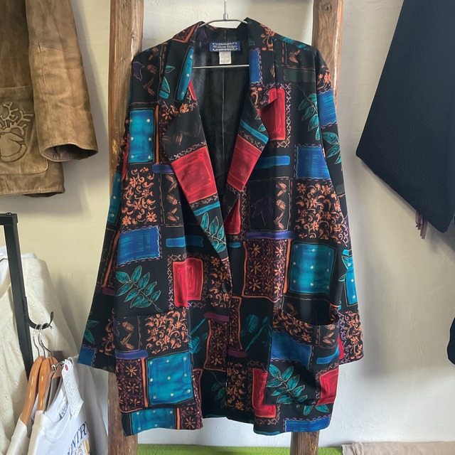ブラックベースに、レッド・ブルー・パープル・オレンジの鮮やかな配色を効かせた、存在感のある総柄ジャケット。大きめのカラーブロックや植物モチーフ、装飾的なパターンが全体に散りばめられており、1990年代らしい華やかさと遊び心を感じられる1着。ベースが黒のため色数が多くてもまとまりがあり、派手すぎず、しっかりスタイリングの主役になります。 シルエットはかっちりしすぎない軽やかな印象で、テーラード型ながらも気負わず羽織りやすいのが魅力。柄物のジャケットは1点で雰囲気が決まりやすく、シンプルなインナーに重ねるだけでも十分に映えます。デニムで少しカジュアルに崩しても良く、黒のスラックスやロングスカートと合わせると、より大人っぽく上品な印象にもまとまります。 アートピースのような配色と、90sらしい大胆な総柄使いが魅力で、古着ならではの1点物感を楽しんでいただけるアイテム。無地のジャケットでは物足りない方や、コーディネートにしっかり個性を出したい方にオススメ。 サイズ:1X(L程度の大きさ) 平置き実寸:着丈87 身幅66 肩幅46 袖丈62 ※素人採寸のため、多少の誤差はご了承ください。 原材料:100% POLYESTER。 モデル:man 170cm 状 態:A A→多少使用感のある商品。(一般的古着の状態) B→使用感があり、多少のダメージがある商品。(着用には問題ない程度) C→使用感があり、大きなダメージがある商品。
