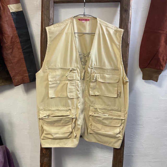 SOLISTA(ソリスタ)より、機能美が光るマルチポケット仕様のジップアップベスト。前身頃に大小さまざまな収納を備え、フラップポケットに加えてジップポケットも多く、荷物が増えがちな外出やイベント、旅行時にも頼れる1着。 カラーはやわらかなベージュ系で、ミリタリーやワークの要素を持ちながらも強くなりすぎず、きれいめ・ストリートどちらにも馴染みます。右身頃にはDカンが付属し、鍵やカラビナ、小物の取り付けが可能。ジップの引き手にはテープが付いており、手袋をしたままでも扱いやすい配慮。 背面にはインパクトのあるグラフィックプリント(“FIREDARTS”表記)。フロントの実用性と、バックスタイルの遊び心のバランスが良く、シンプルな装いに重ねるだけで雰囲気が出ます。サイズはL表記。Tシャツからスウェット、薄手のアウターの上まで、レイヤードの幅が広いのも魅力。 サイズ:L 平置き実寸:着丈68 身幅57 肩幅42 ※素人採寸のため、多少の誤差はご了承ください。 原材料:65% POLYESTER。 35% COTTON。 モデル:man 170cm 状 態:A A→多少使用感のある商品。(一般的古着の状態) B→使用感があり、多少のダメージがある商品。(着用には問題ない程度) C→使用感があり、大きなダメージがある商品。