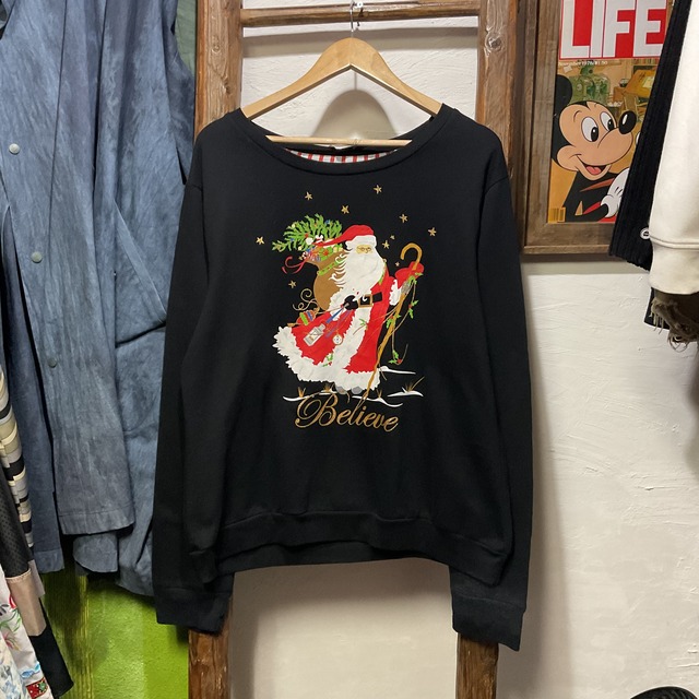 深いグリーンボディに、サンタの顔をアップリケで大胆に配置したクリスマススウェット。ヒイラギ部分はチェック生地+赤ボタンで実際に立体感があり、クラフト感が可愛い1枚。 襟ぐりには小花のようなステッチ装飾、袖口には大きめボタン、裾はチェック生地で切替えられていて、 “普通のプリント物”じゃ出ない温かみが魅力。 サイズ:XL 平置き実寸:着丈75 身幅60 肩幅58 袖丈52 ※素人採寸のため、多少の誤差はご了承ください。 原材料:50% COTTON。 50% POLYESTER。 モデル:man 170cm 状 態:A A→多少使用感のある商品。(一般的古着の状態) B→使用感があり、多少のダメージがある商品 (着用には問題ない程度) C→使用感があり、大きなダメージがある商品