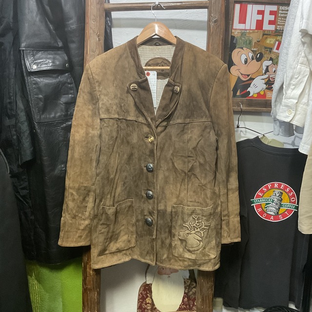 ドイツ語で「ECHTES LEDER(本革)」表記の入った、トラハテン(民族衣装)テイストのスエードレザージャケット。しっとり起毛したブラウンスエードに、スタンド気味の襟・切替ステッチ・クラシックな装飾ボタンが映える1着。 内側はチェック柄ライニングで、レザー特有の重さを感じにくく羽織りやすいバランス。さらにポケットの鹿(トナカイ)刺繍が程よく遊び心を足してくれて、無骨になりすぎず“ヨーロッパ古着らしさ”がしっかり出ている。デニムでラフにも、スラックスで品良くもいける、主役級のヴィンテージレザージャケット。 サイズ:42 (サイズL) 平置き実寸:着丈78 身幅55 肩幅46 袖丈60 ※素人採寸のため、多少の誤差はご了承ください。 原材料:100% POLYESTER。 モデル:man 170cm 状 態:A A→多少使用感のある商品。(一般的古着の状態) B→使用感があり、多少のダメージがある商品。(着用には問題ない程度) C→使用感があり、大きなダメージがある商品。