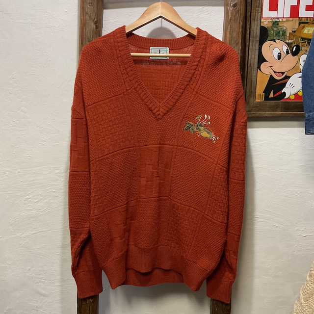 深みのあるブリックオレンジが映える、フルマックス・ゴルフのウール100% Vネックニット。 身頃全体をブロック状に切り替えたパッチワーク編み(天竺・鹿の子・ケーブルなど)で構成し、編み地の凹凸によって陰影が生まれる表情豊かな1枚。ネックはやや深めのVネックで、先端に小さなVスリット入り。インナーにシャツやタートルを挟むと襟元のレイヤードがきれいに決まる。 左胸には、ゴルフクラブとフラッグ(1番ホール)を描いた多色刺繍。カジュアルな中に上品なアクセント。袖口と裾は太めのリブ編みで、ほどよいフィット感とシルエットの安定感を確保。ミドル〜ヘビーゲージのウールで保温性が高く、アウターの中にも1枚着にも対応。 サイズ:表記なし(メンズL~XL,レディースXL) 平置き実寸:着丈77 身幅59 肩幅55 袖丈63 ※素人採寸のため、多少の誤差はご了承ください。 原材料:100% WOOL。 モデル:man 170cm 状 態:A A→多少使用感のある商品。(一般的古着の状態) B→使用感があり、多少のダメージがある商品 (着用には問題ない程度) C→使用感があり、大きなダメージがある商品