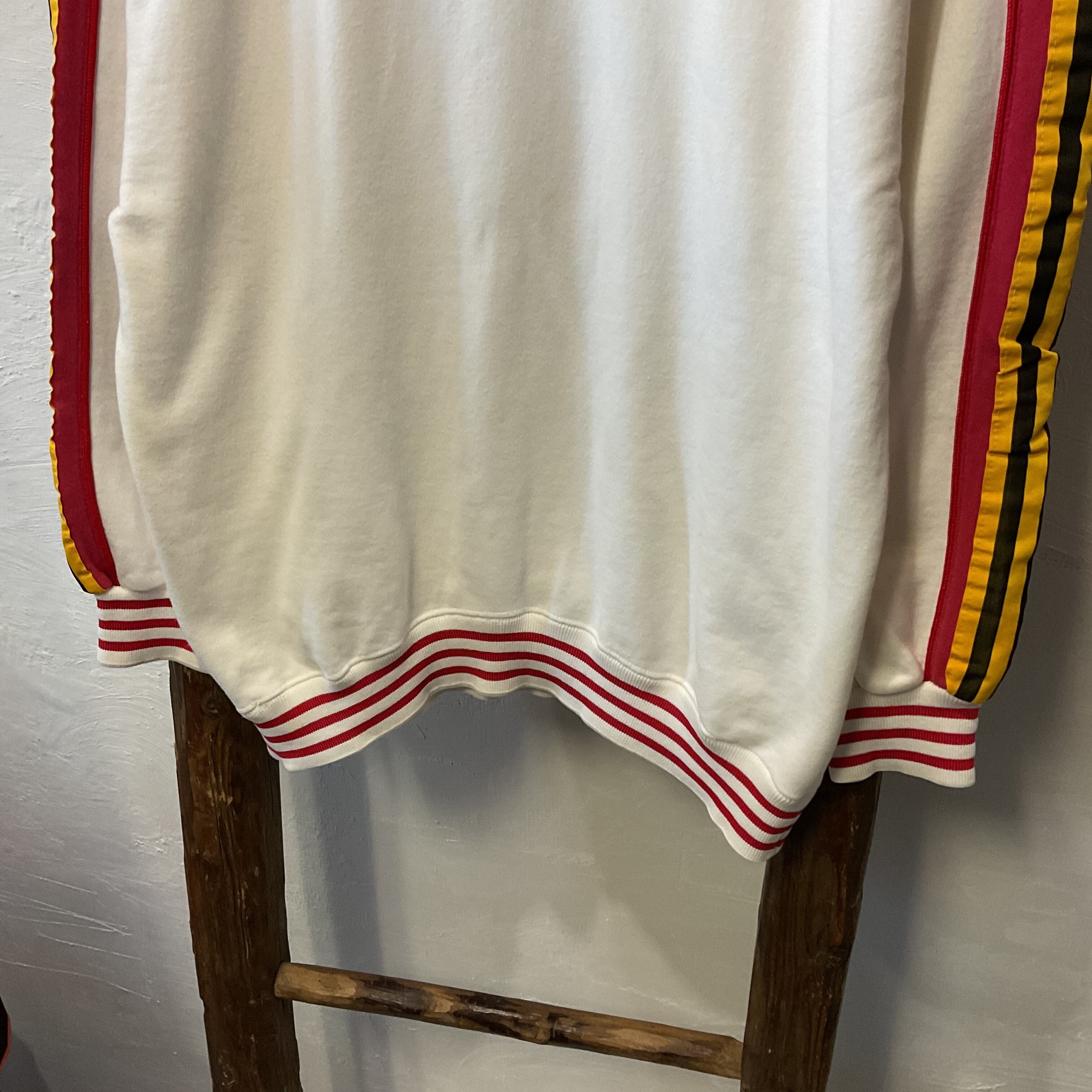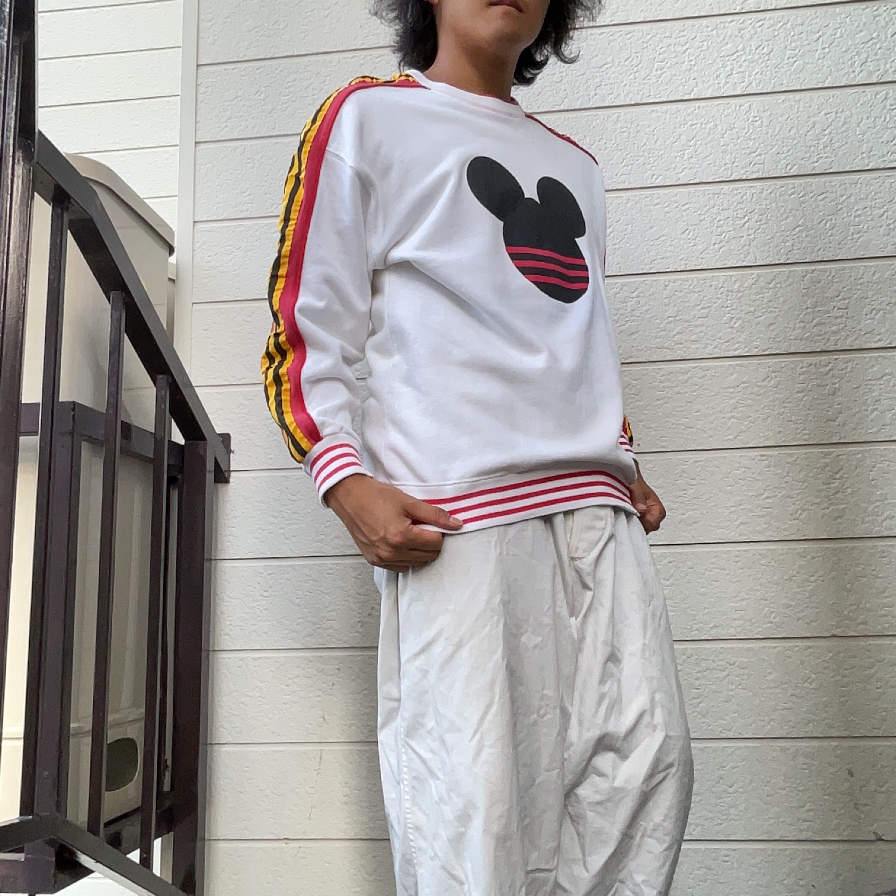 フロントにはブラックのミッキーマウス風シルエットと赤のラインを大胆にデザイン。肩から袖口にかけてのラインテープ、リブの赤×白の切り替えもアクセントになっています。