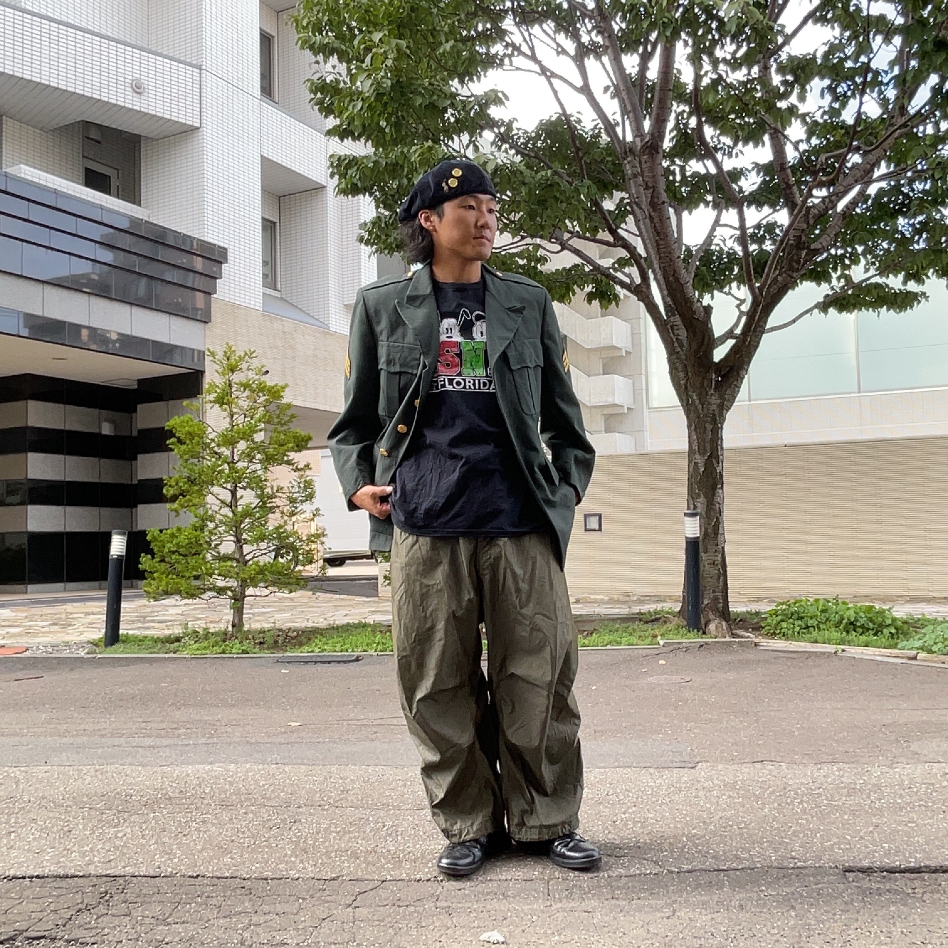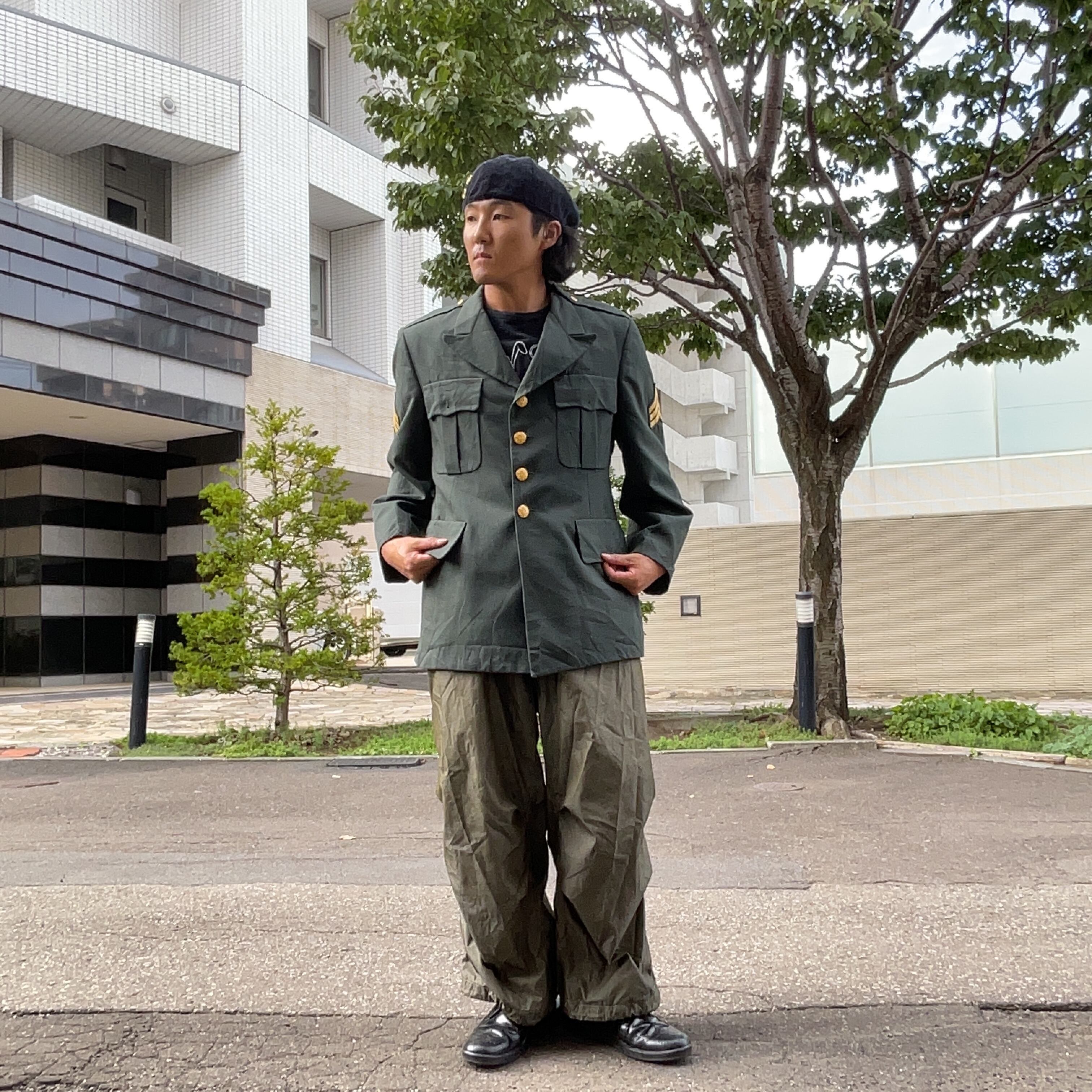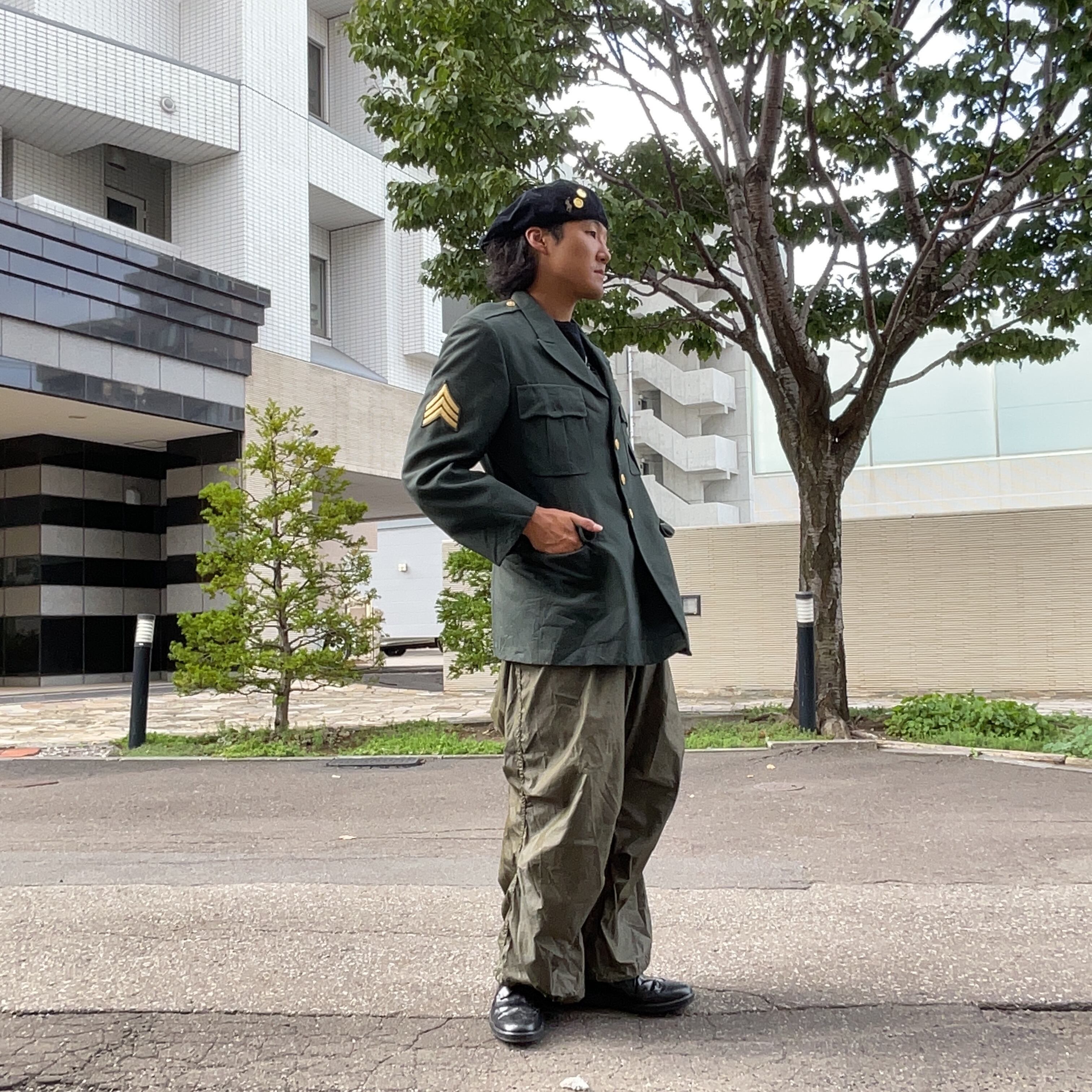 80〜90年代製の本物のアメリカ陸軍ジャケット。軍曹階級章付きで、ヴィンテージ感あふれる一着。古着コーデやミリタリーファッションにおすすめ!