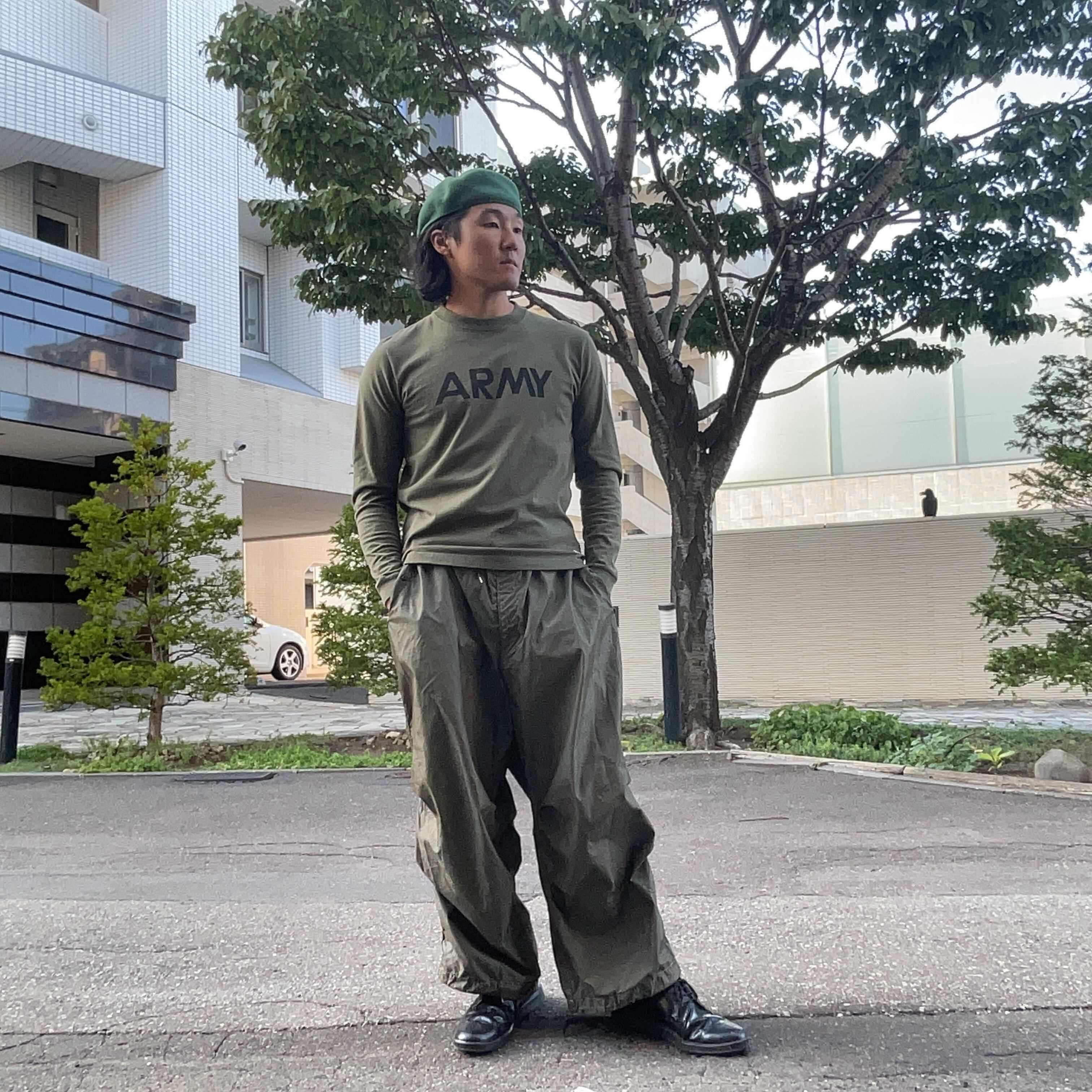 フロントに大胆にプリントされた“ARMY”ロゴが、ミリタリースタイルを象徴する一枚。