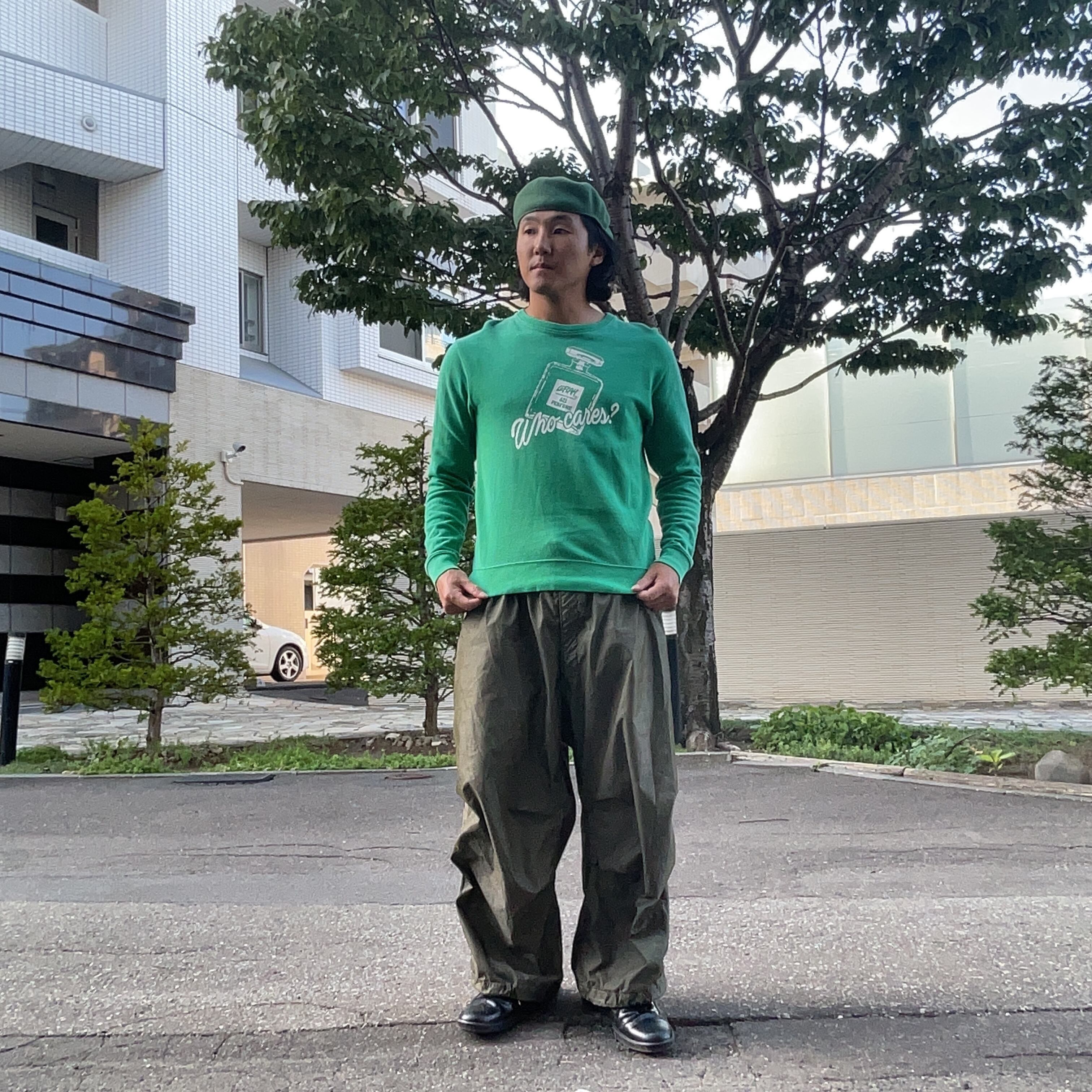 鮮やかなグリーンのボディに、香水ボトルをモチーフにした「PERFUME」プリントと「Who Cares?」=(どうでもいいじゃん、気にしないよ)のメッセージを大きく配置したインパクトある一枚です。