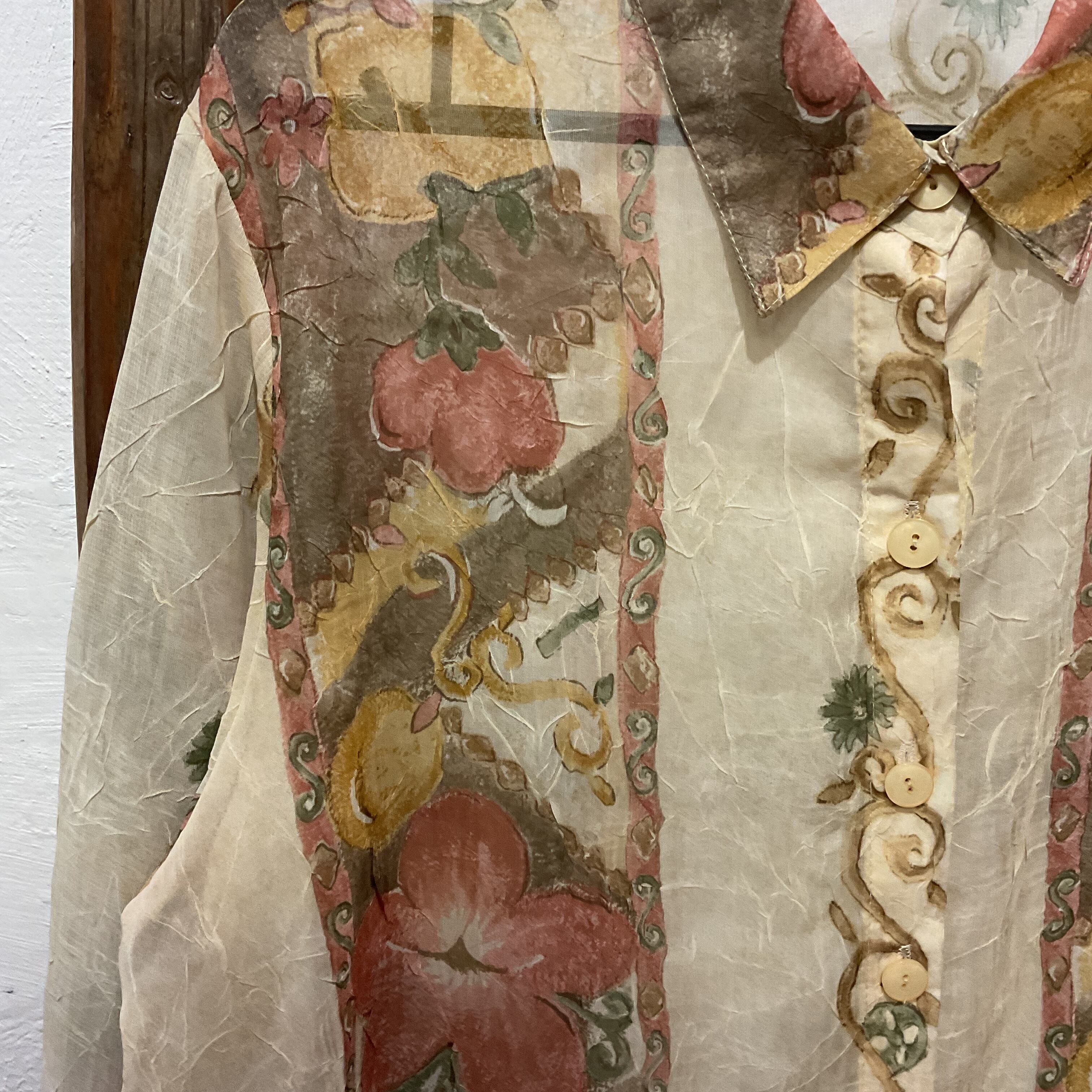透明感のあるシースルー素材に、クラシカルな花柄とスクロール模様をあしらったレトロシャツ。