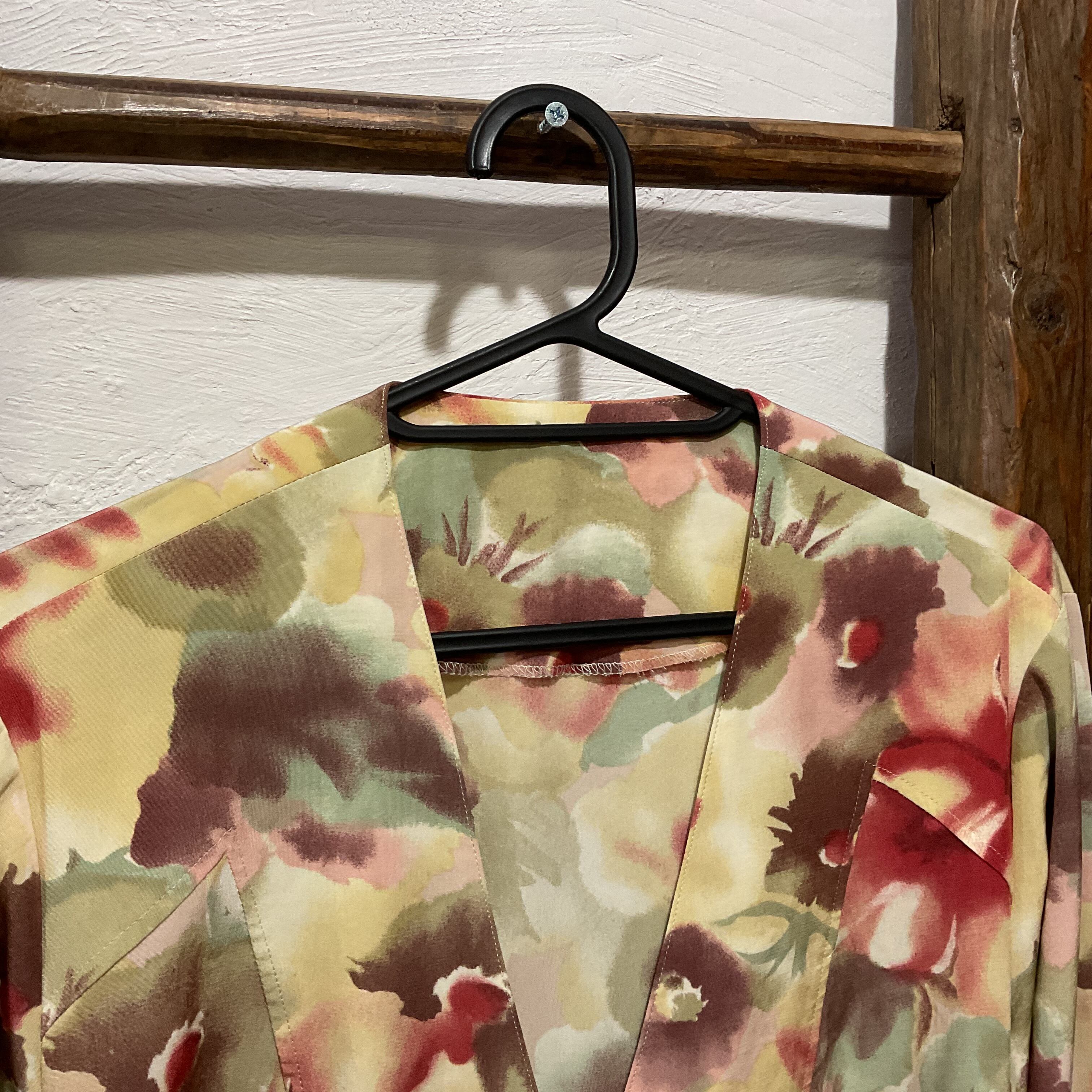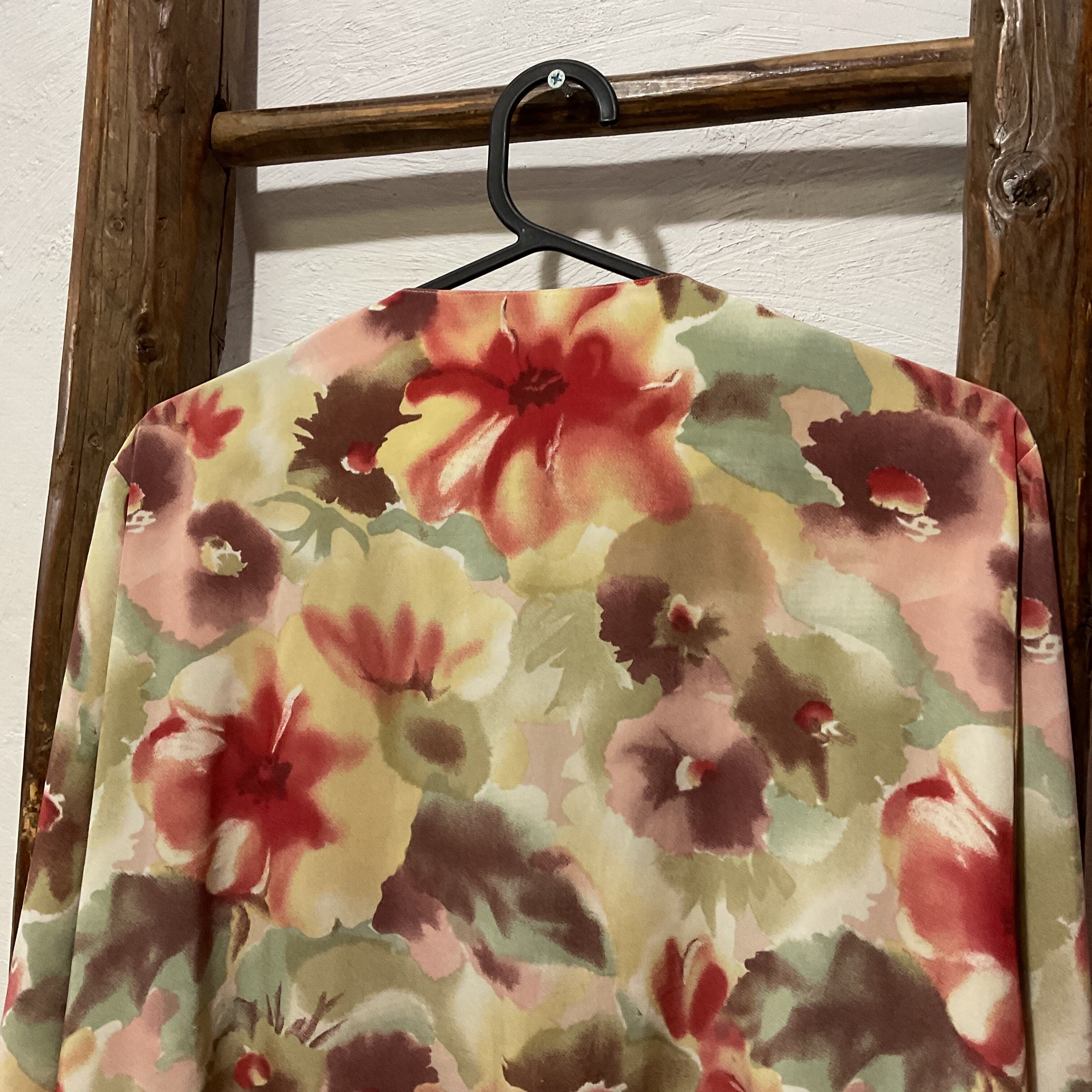 大胆なフラワープリントに、パール調のゴールドボタンがアクセントになった日本製ヴィンテージブラウス。
