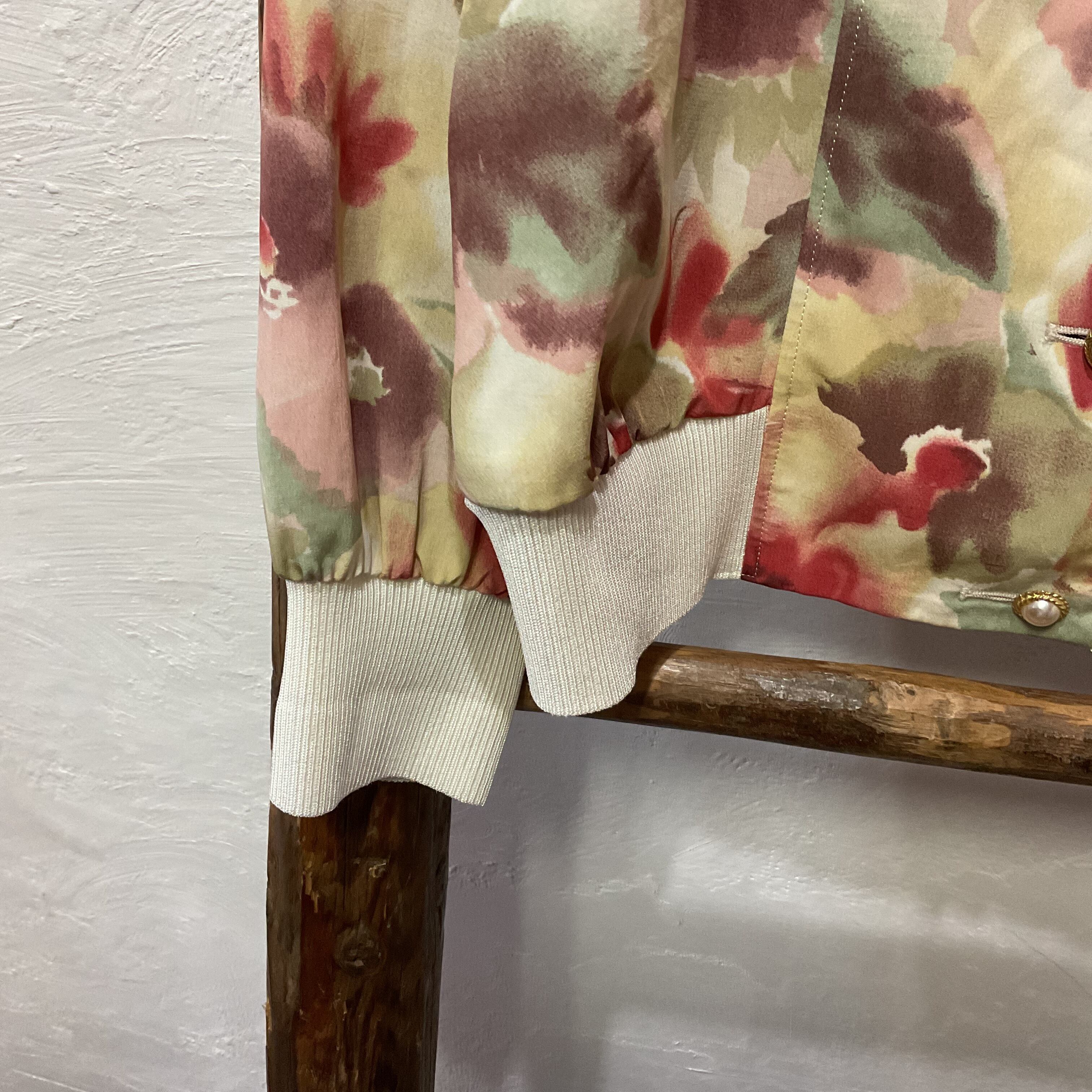 80~90年代らしい華やかなデザインで、裾と袖口はリブ仕様になっており、ブルゾン感覚でも着こなせる1枚。