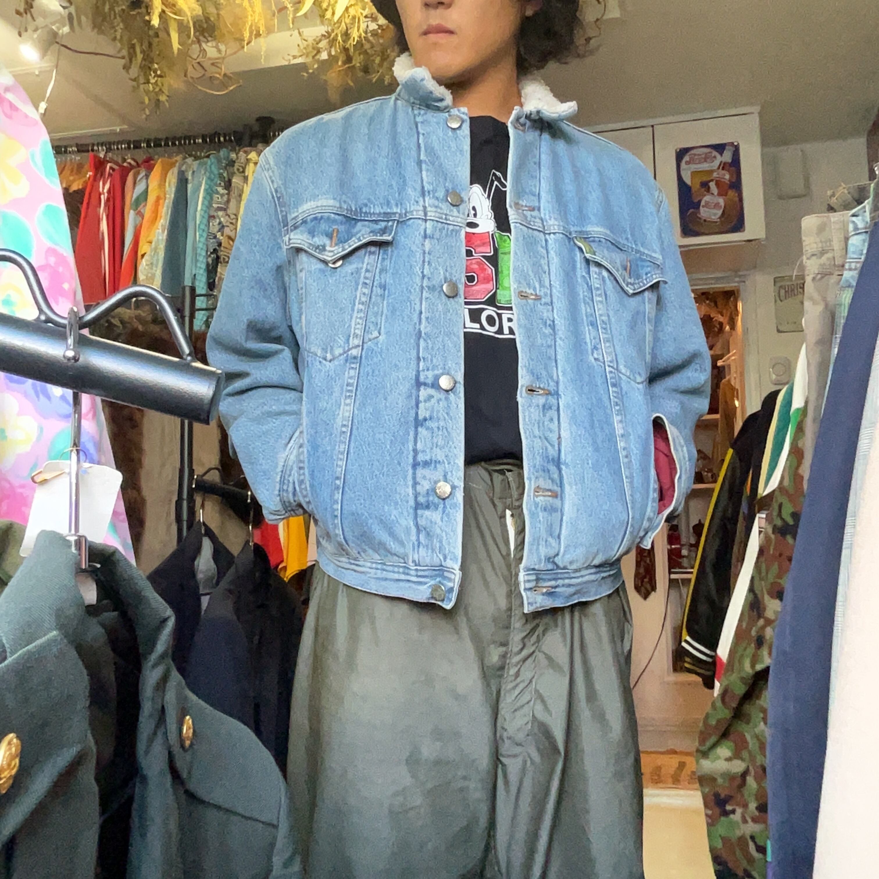 表地はしっかりとしたデニム生地を使用し、裏地にはシープボア風のポリエステルファーを全面に配した防寒仕様。90sらしいリラックス感のあるシルエットとヴィンテージ