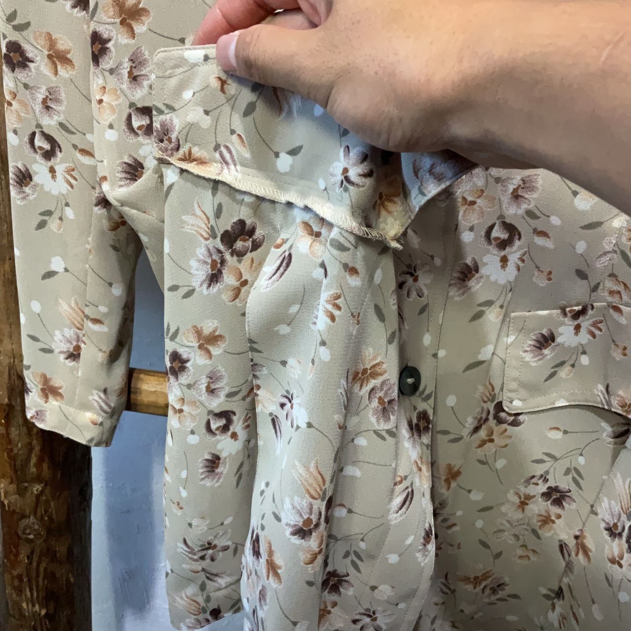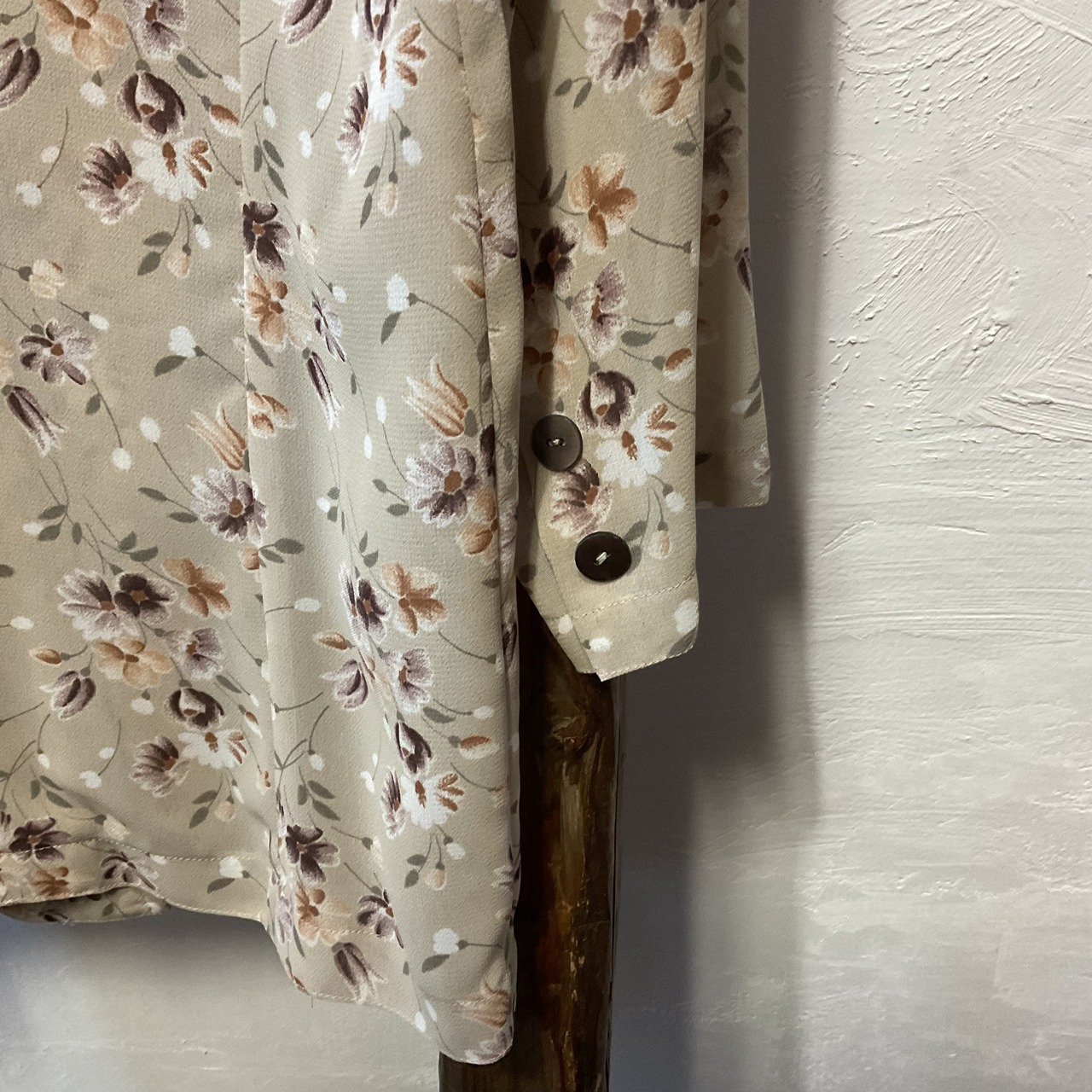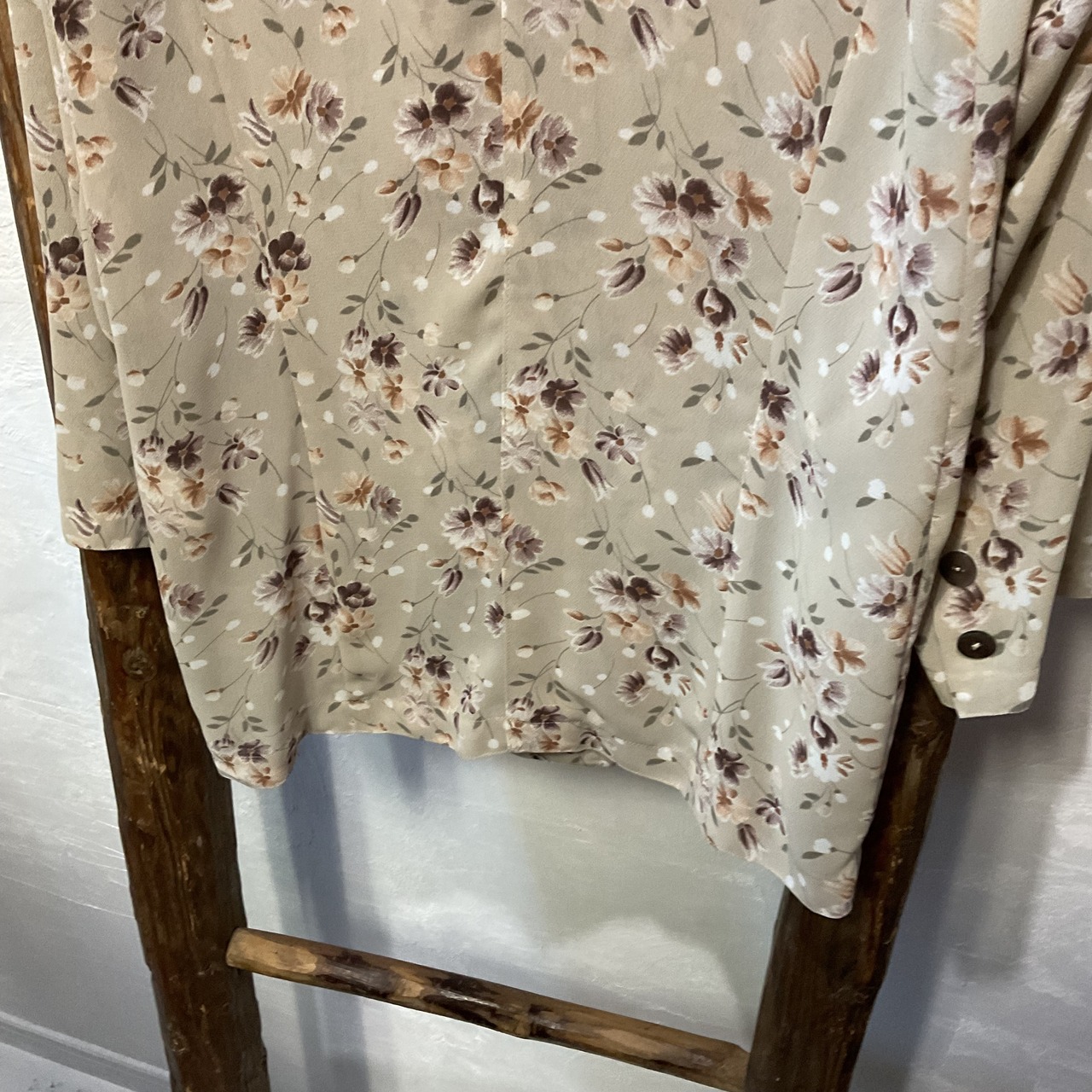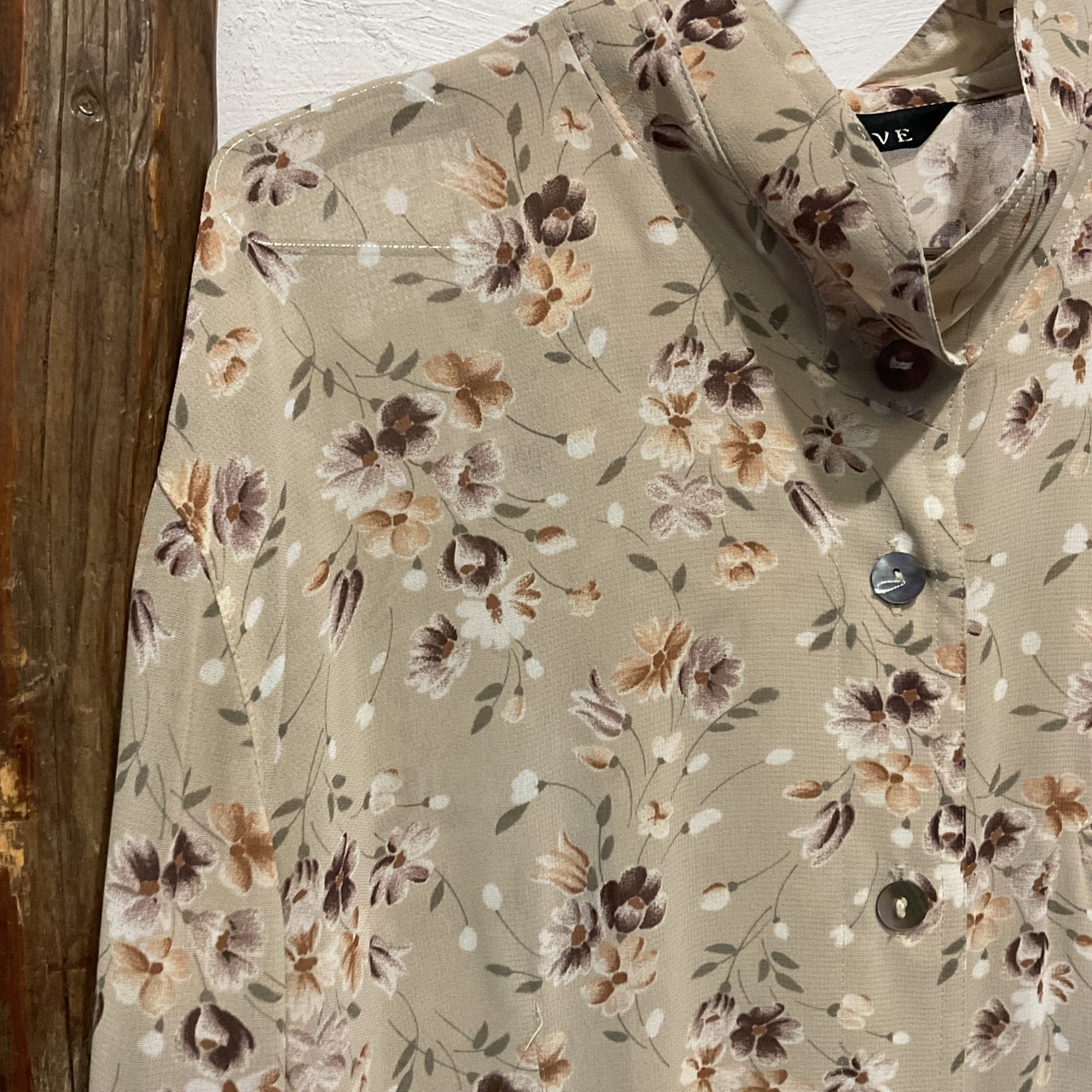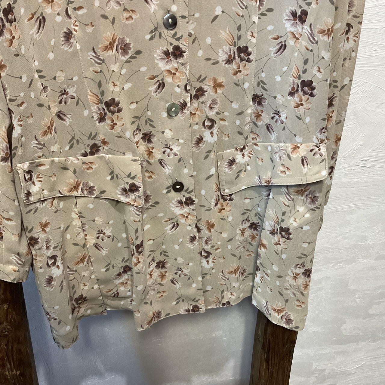 ベージュ地に落ち着いた小花柄が映える90sヴィンテージブラウス。