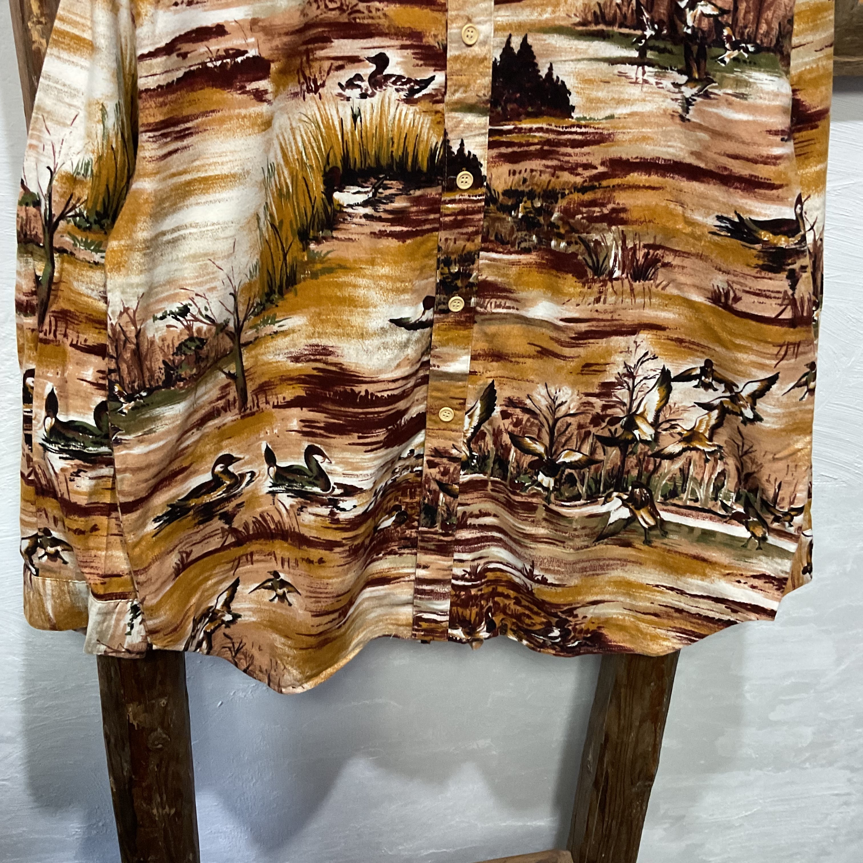 カモや木々、水辺の風景を描いたアート調のプリントが印象的な1着。