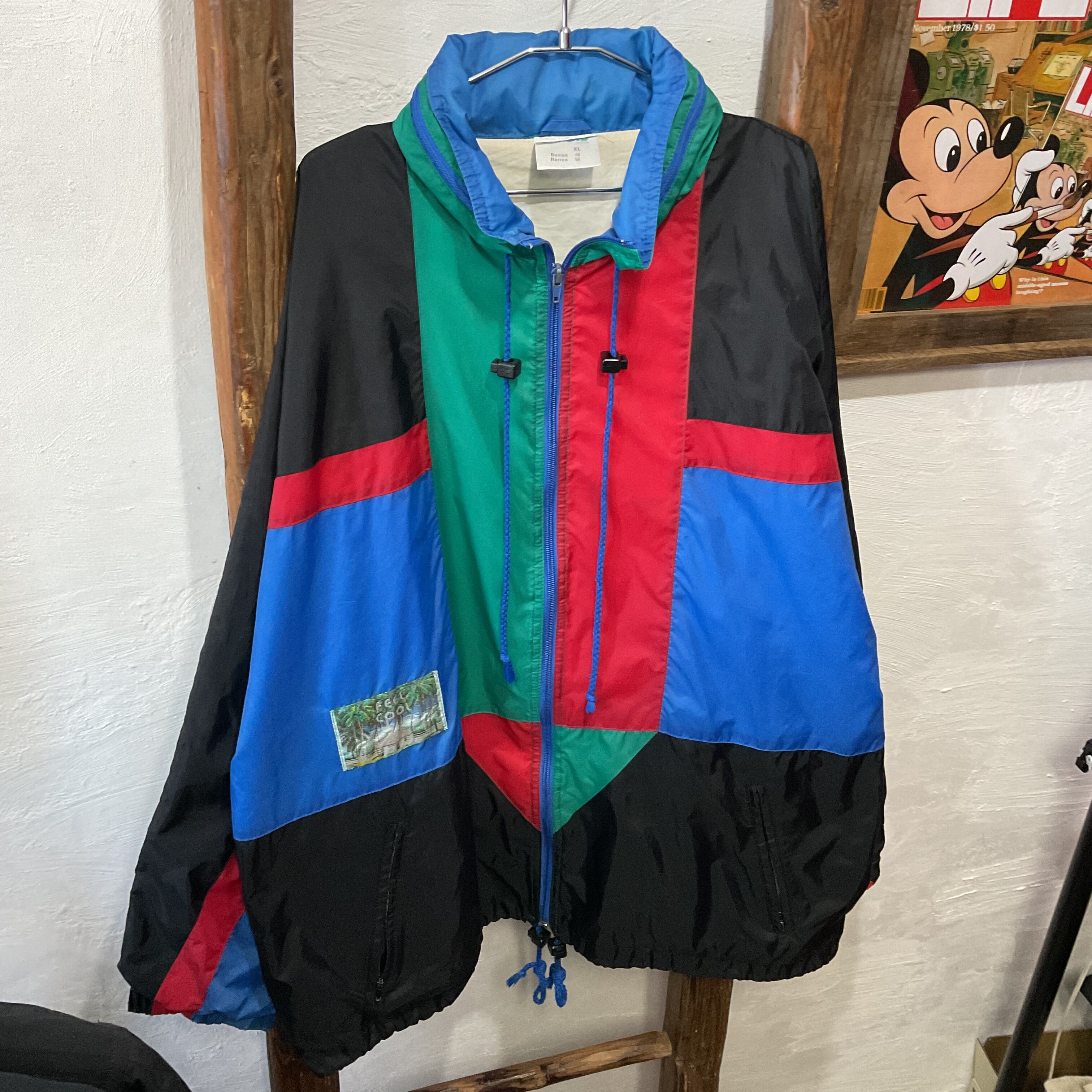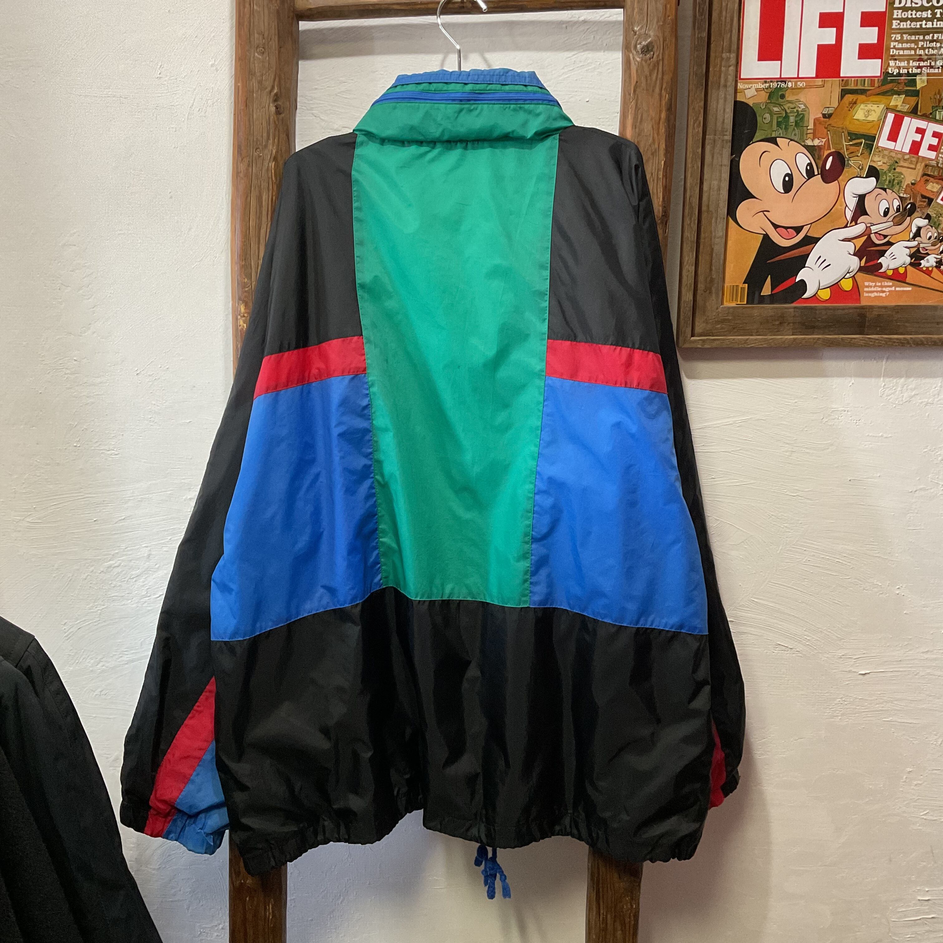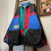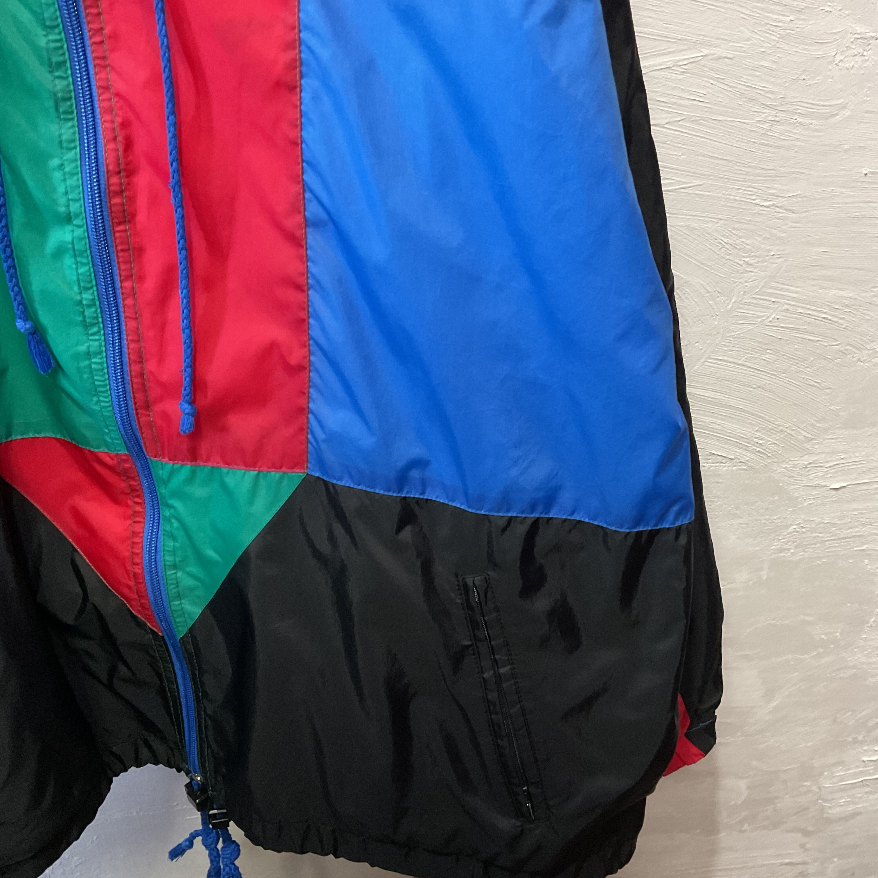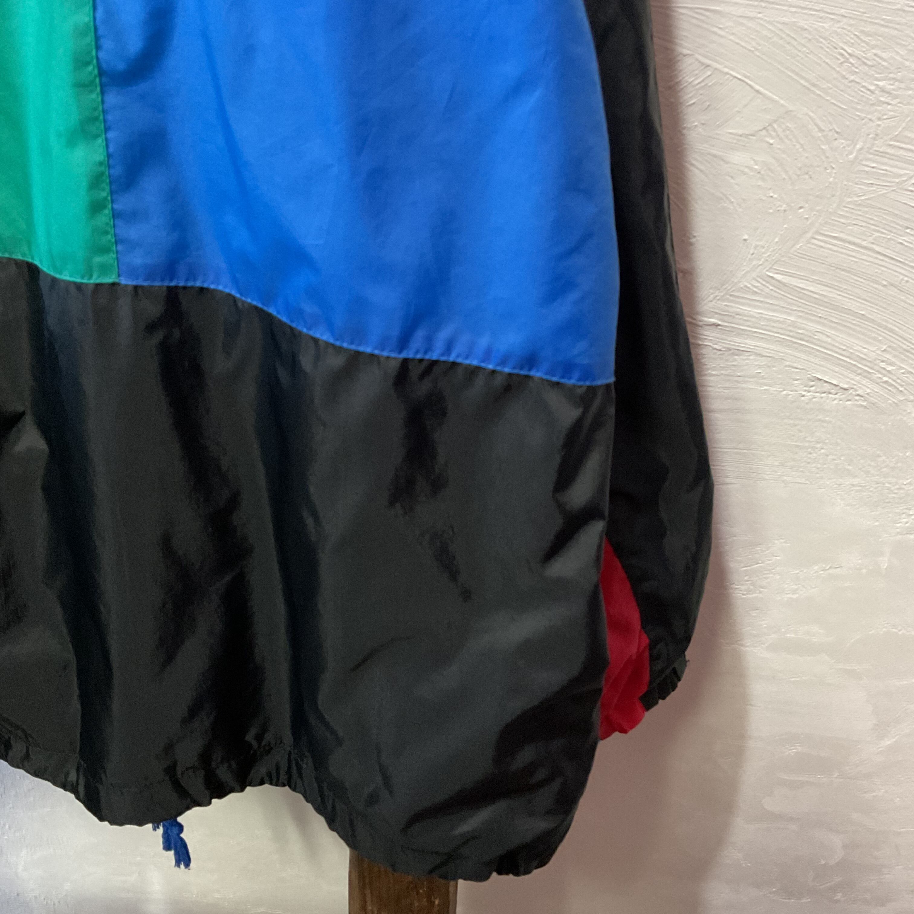 レッド・ブルー・グリーン・ブラックのマルチカラーブロッキングが映える90sらしいデザイン。胸元には南国風の「FEEL COOL」刺繍パッチが入り、アウトドア×ストリートな雰囲気。