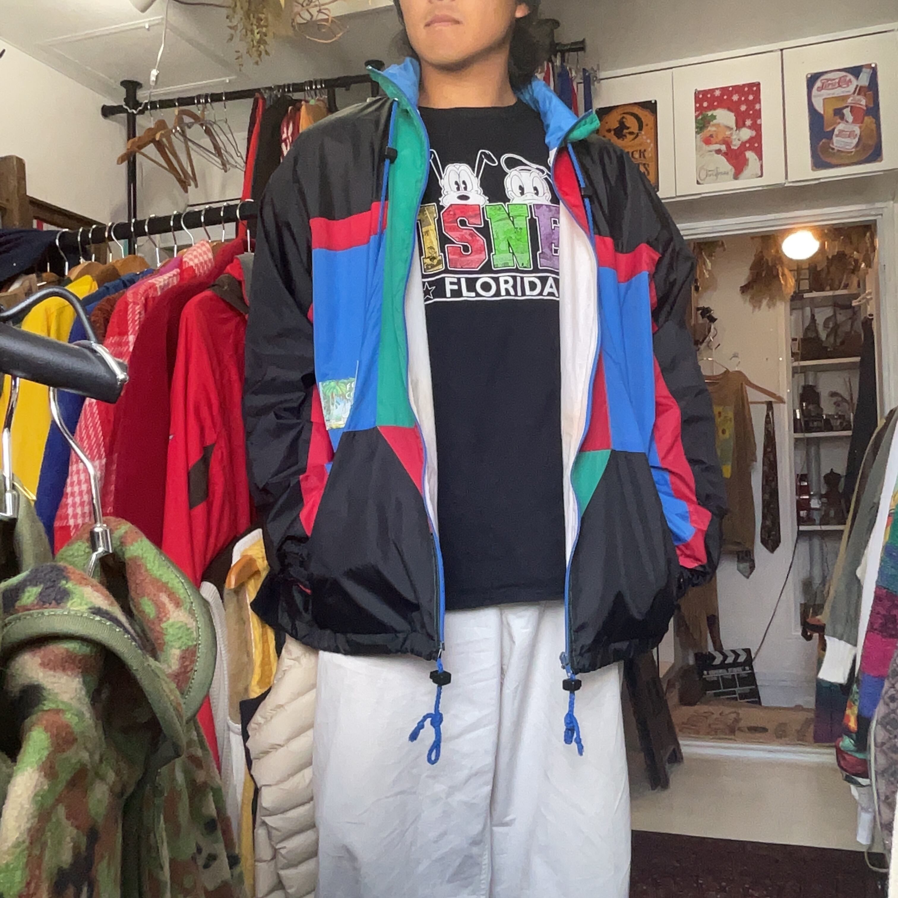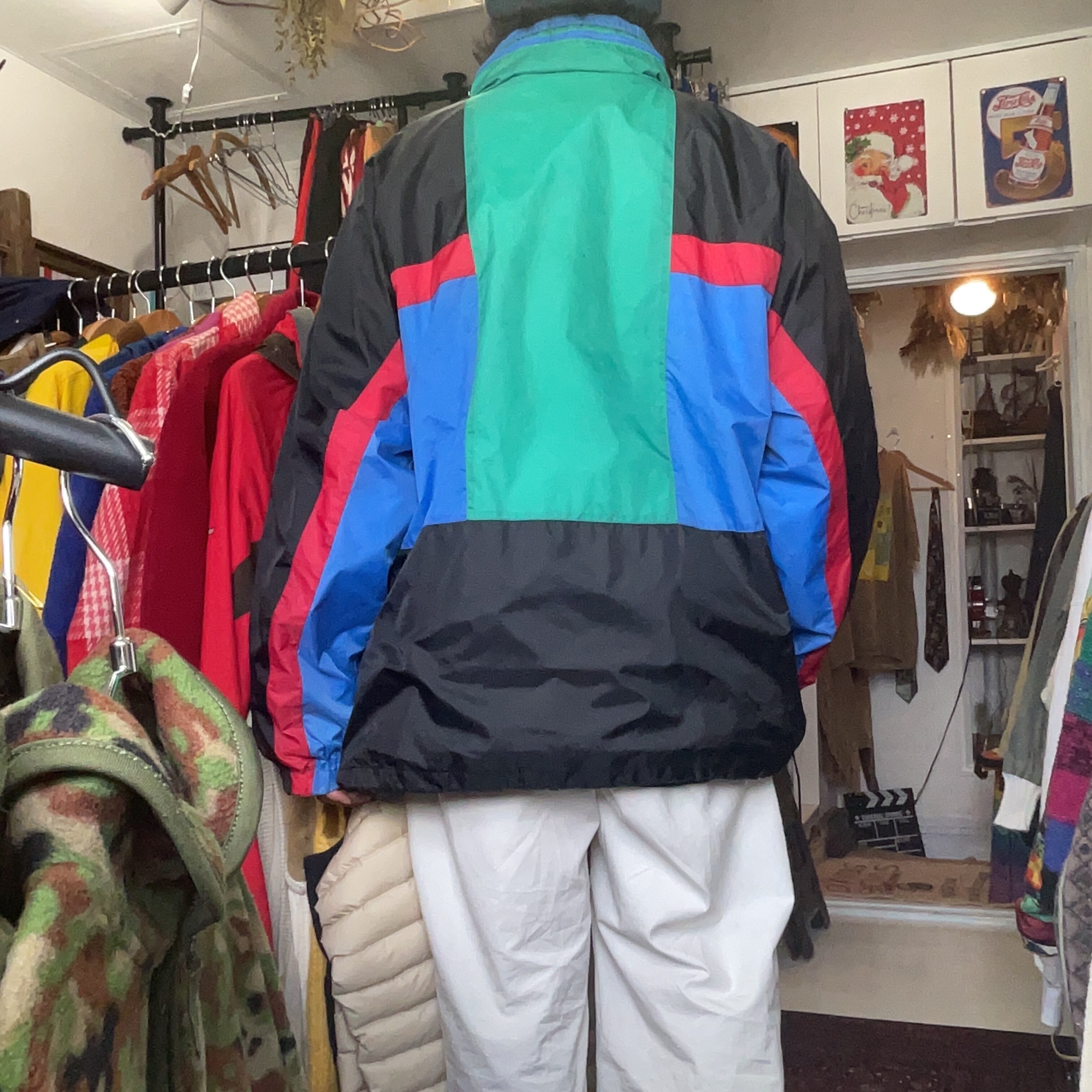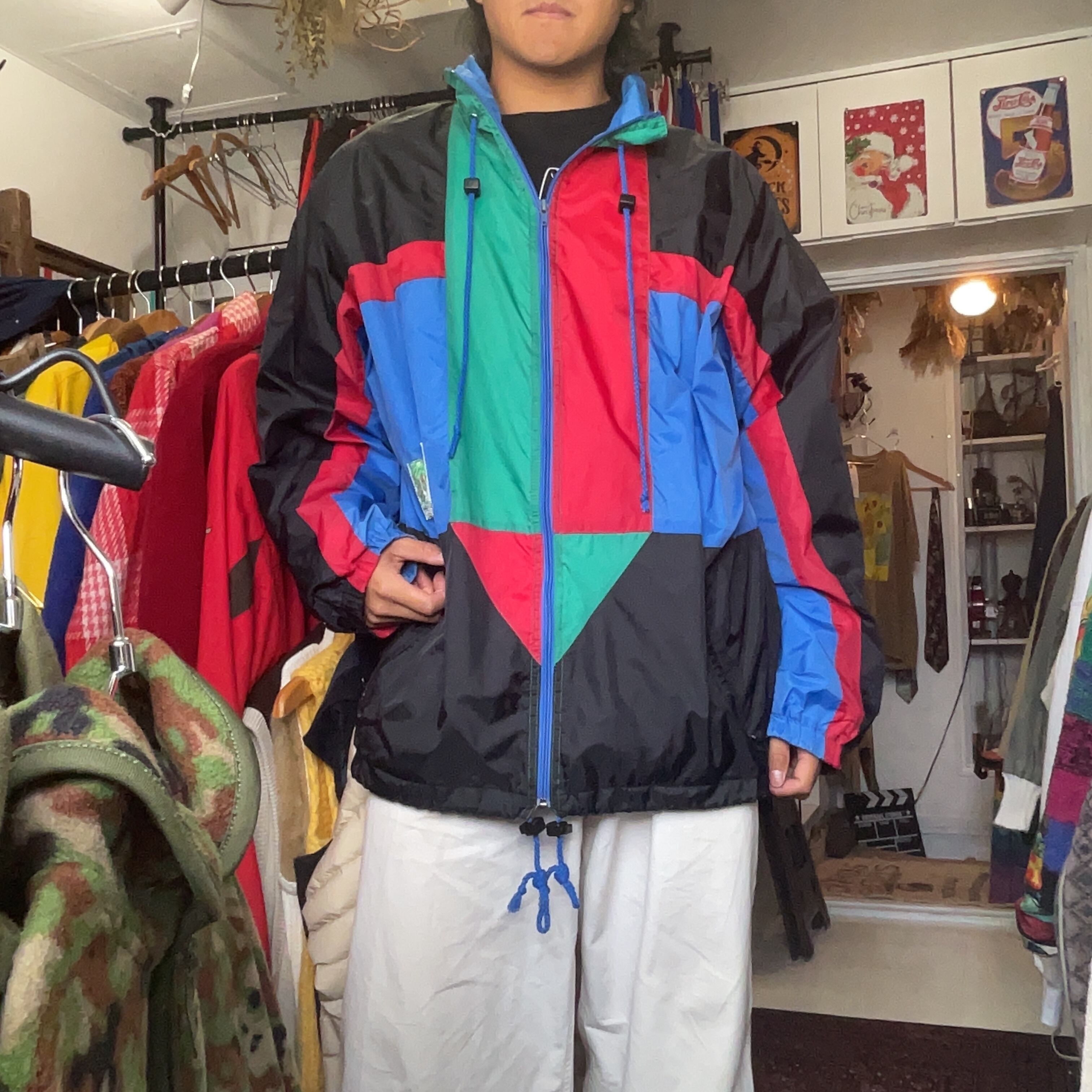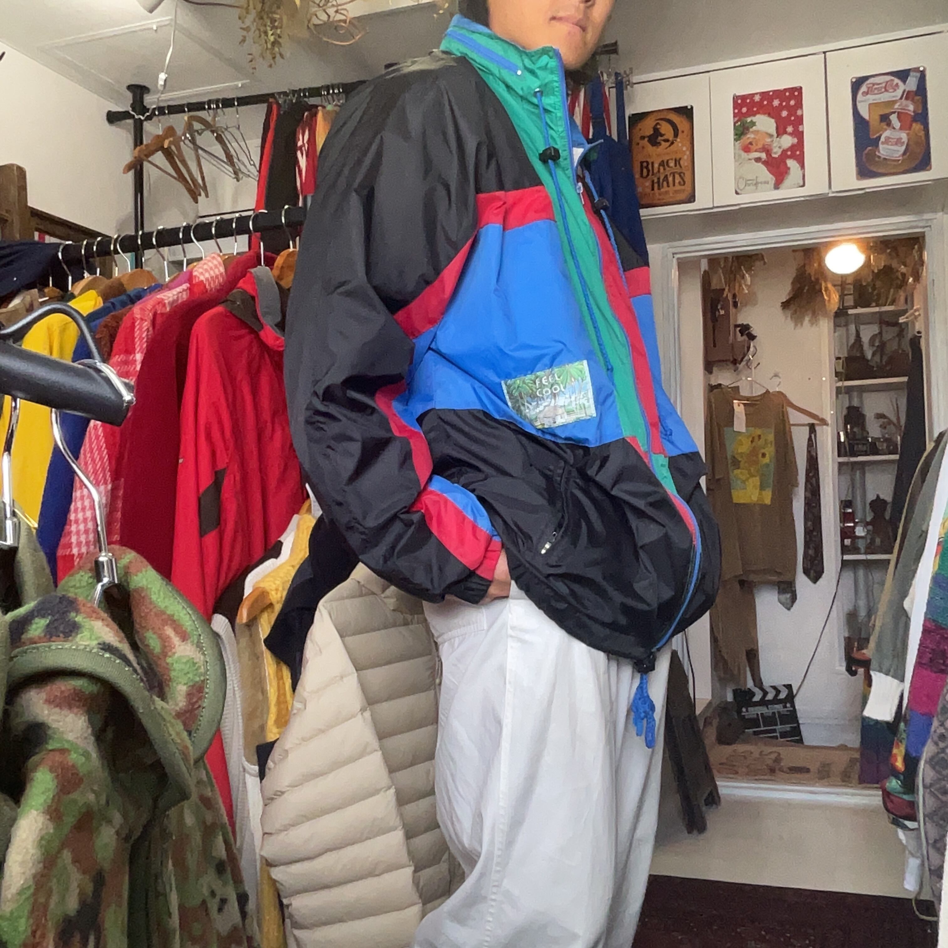 レッド・ブルー・グリーン・ブラックのマルチカラーブロッキングが映える90sらしいデザイン。胸元には南国風の「FEEL COOL」刺繍パッチが入り、アウトドア×ストリートな雰囲気。