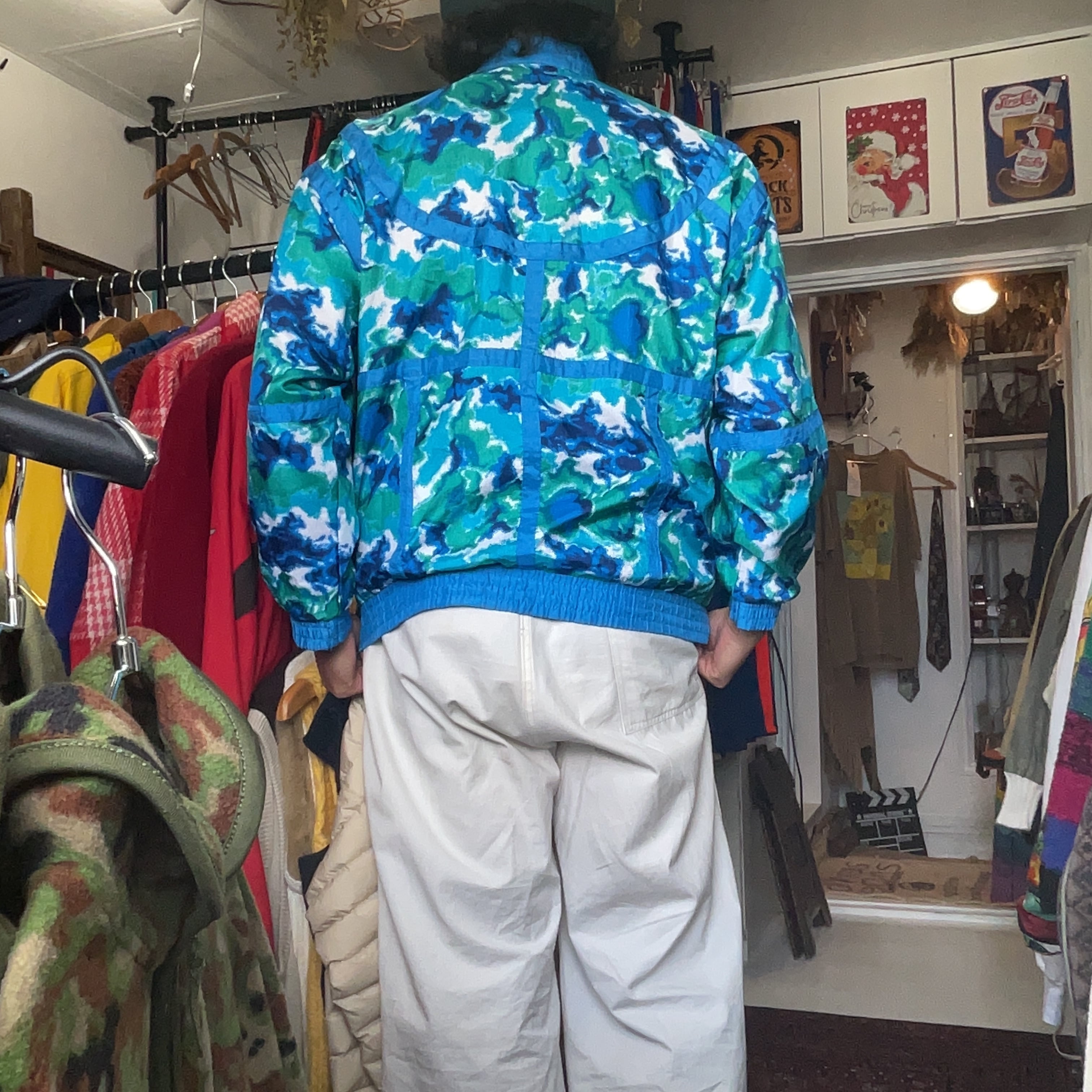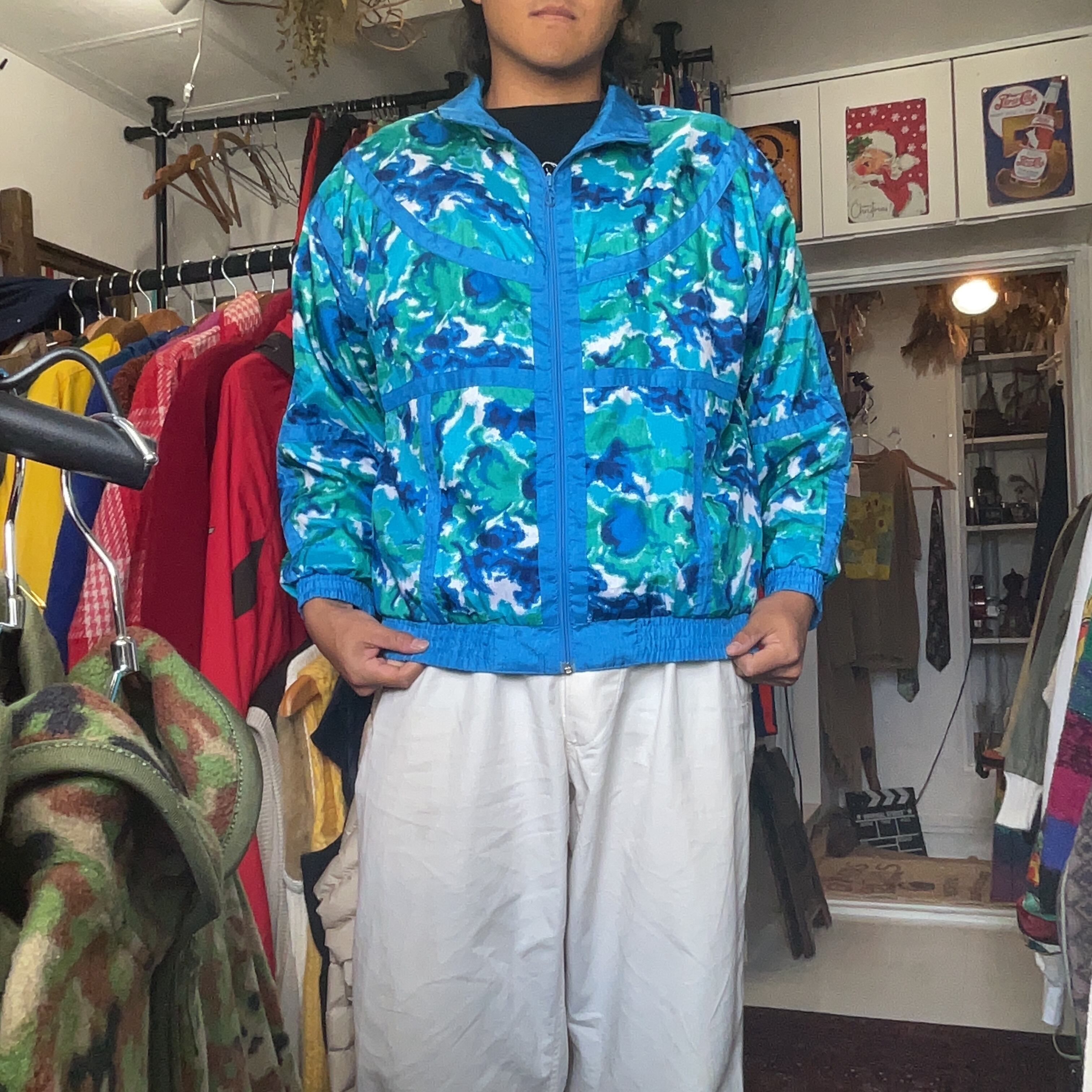 ブルー・グリーンを基調としたアブストラクト柄が印象的で、80〜90年代らしい軽い光沢感とシャリっとしたナイロン素材。