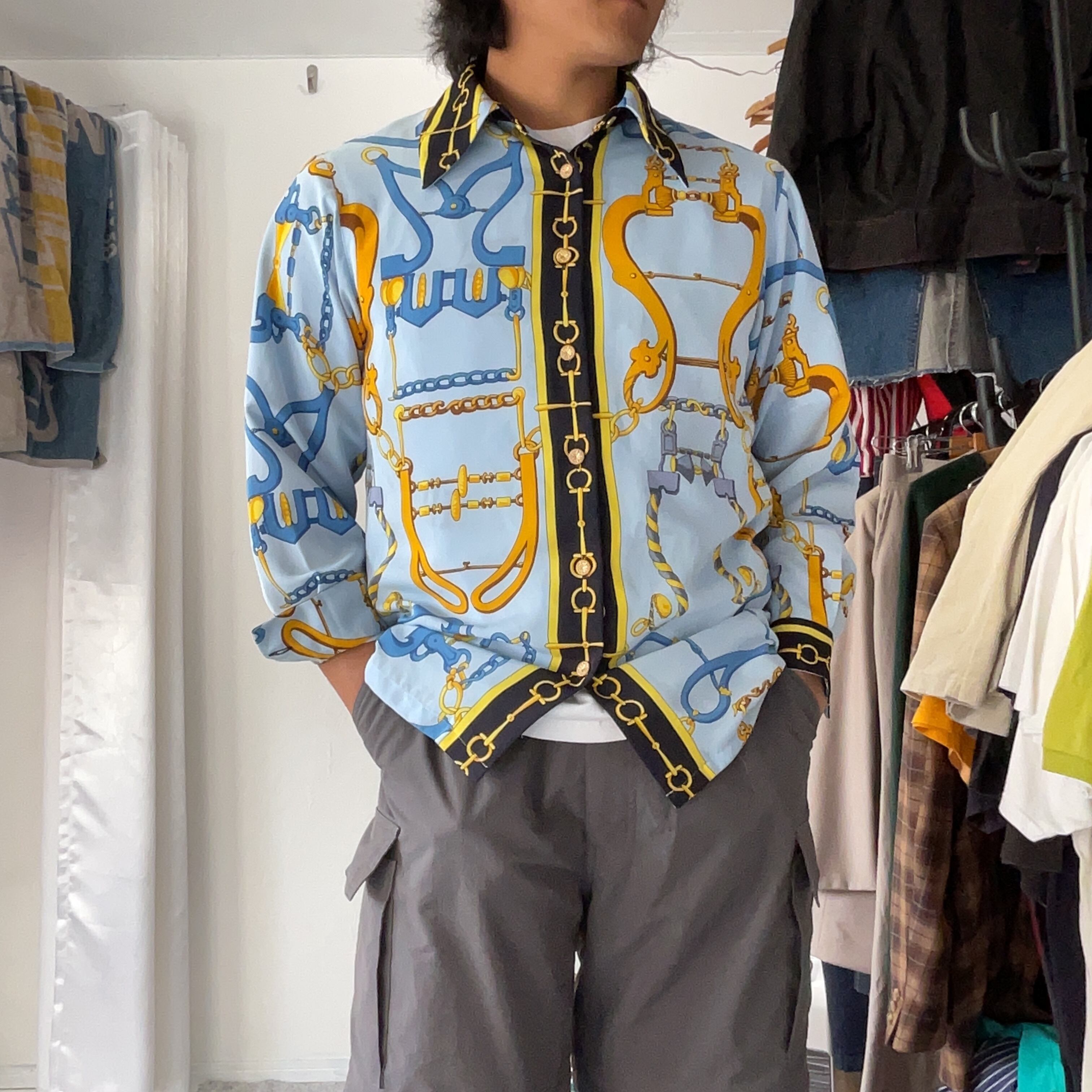 日本ブランド ATELIER SAB(アトリエサブ) による、エルメス調のホースビットチェーンプリントシャツ。