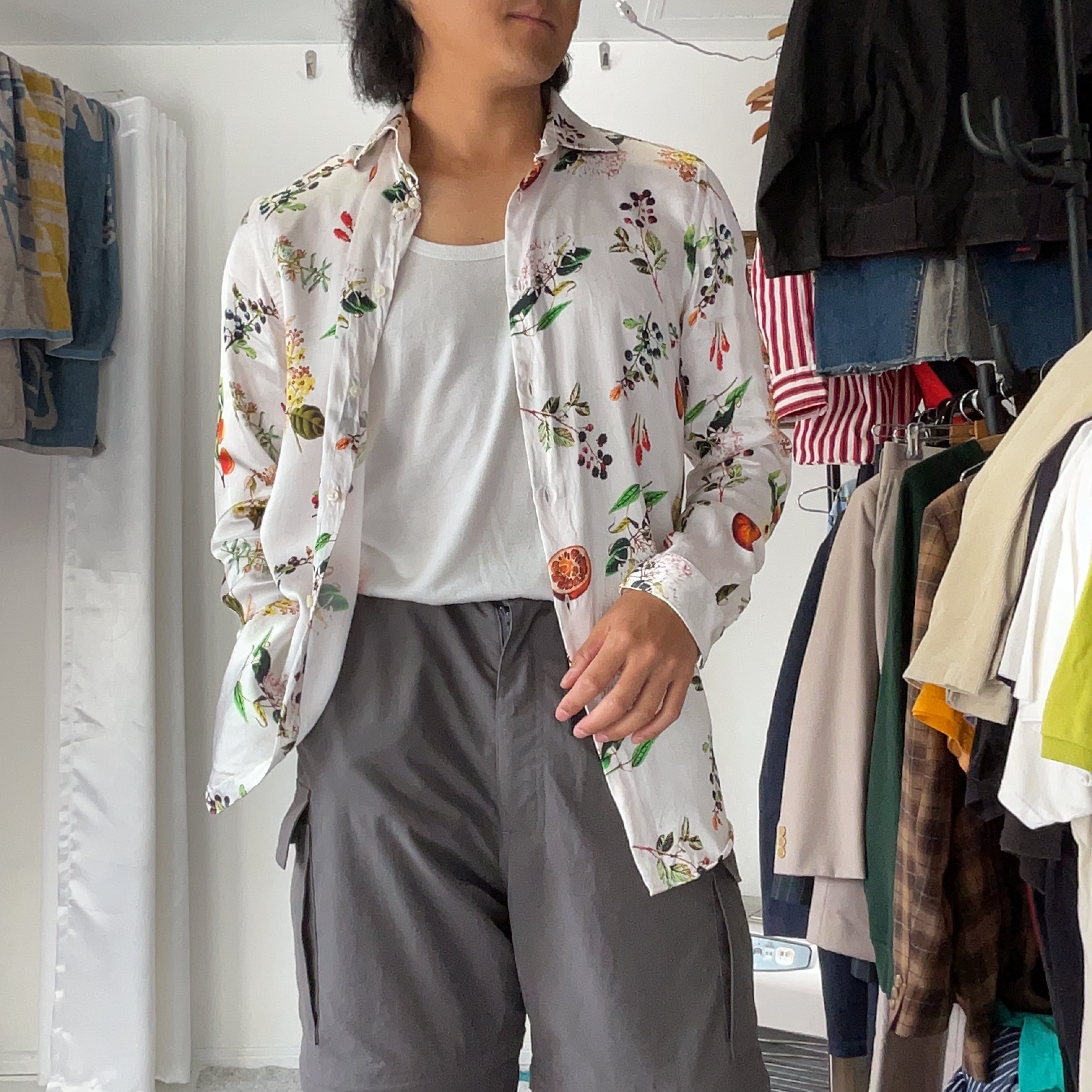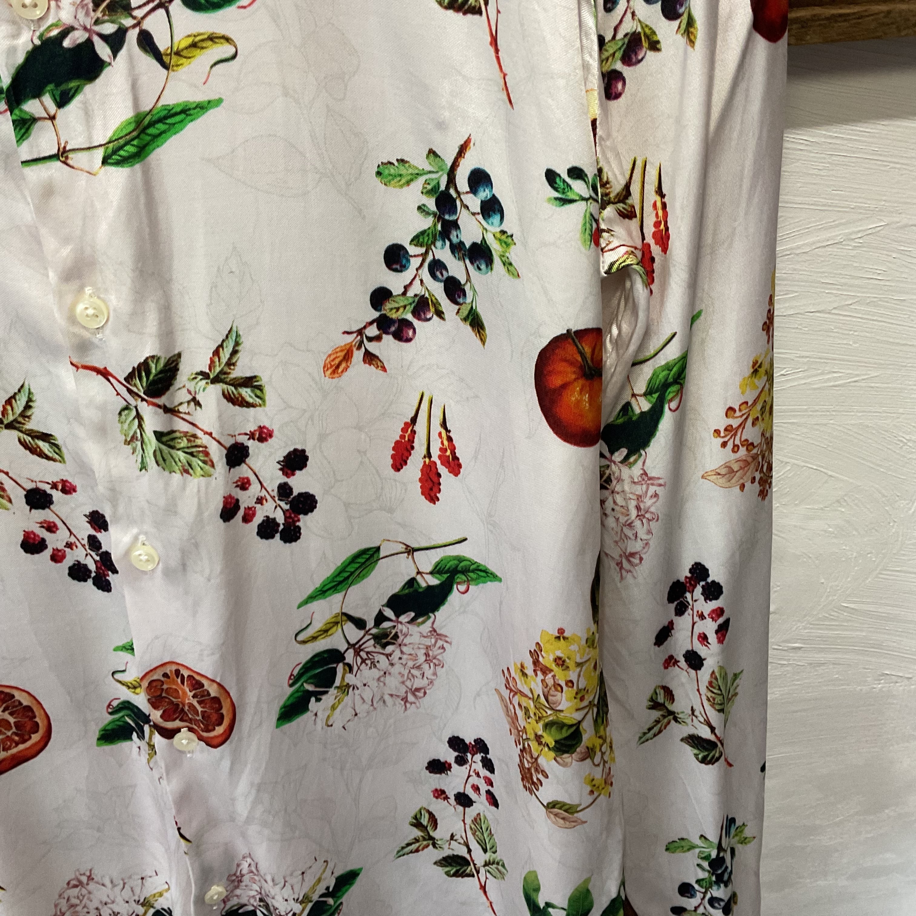 ホワイトベースにフルーツや植物をモチーフとしたボタニカル柄が全面にプリントされた華やかなデザインです。