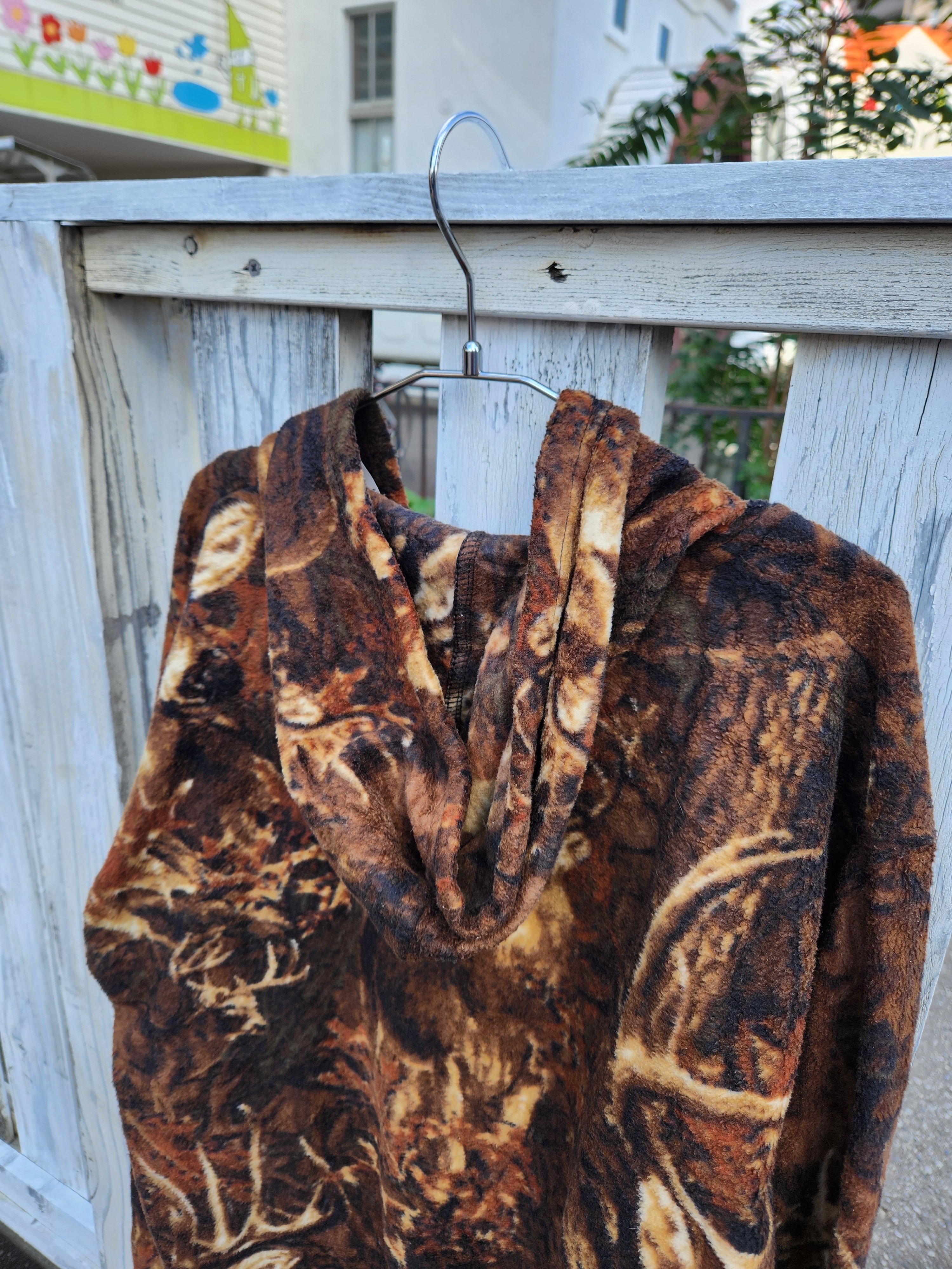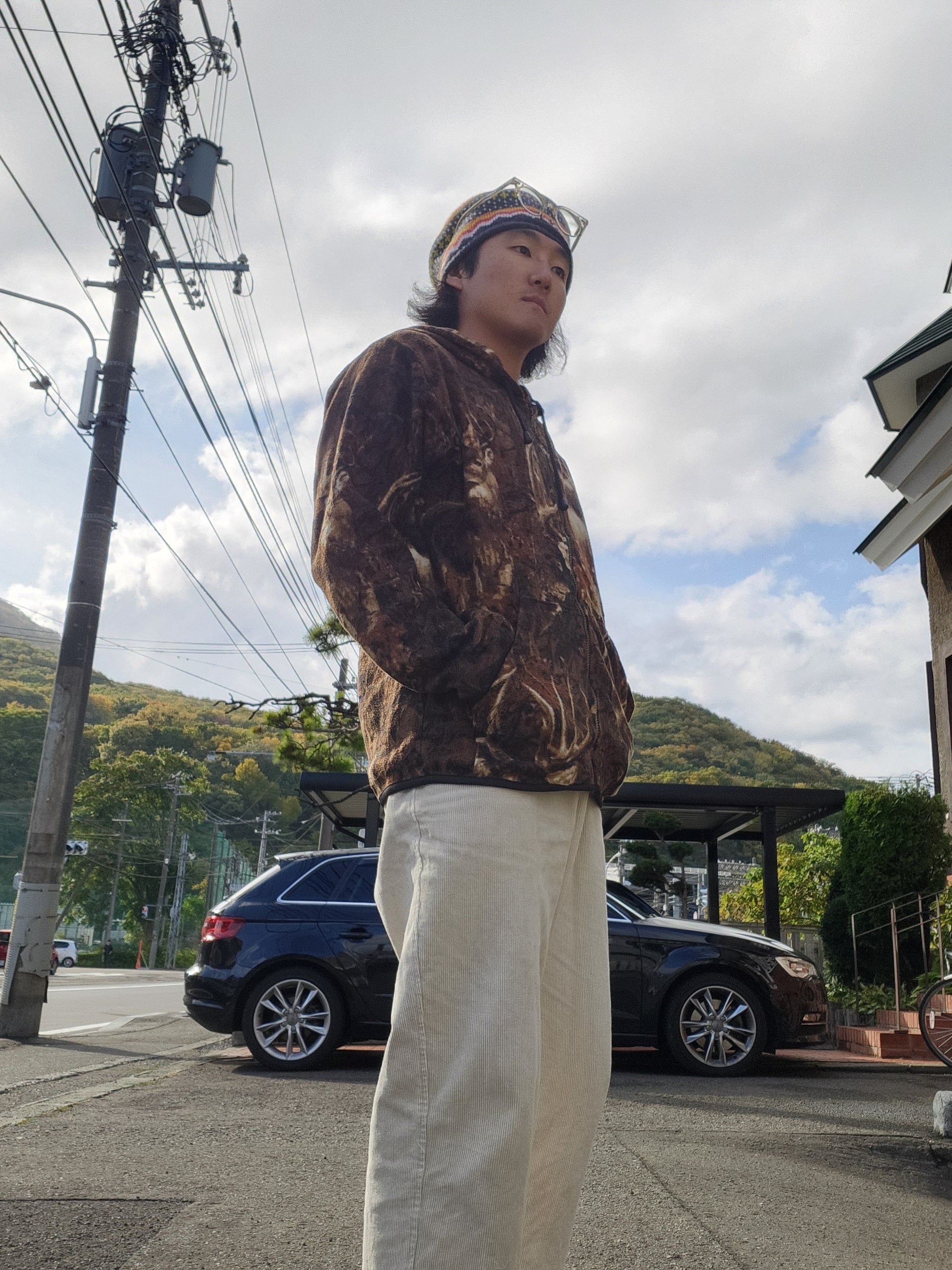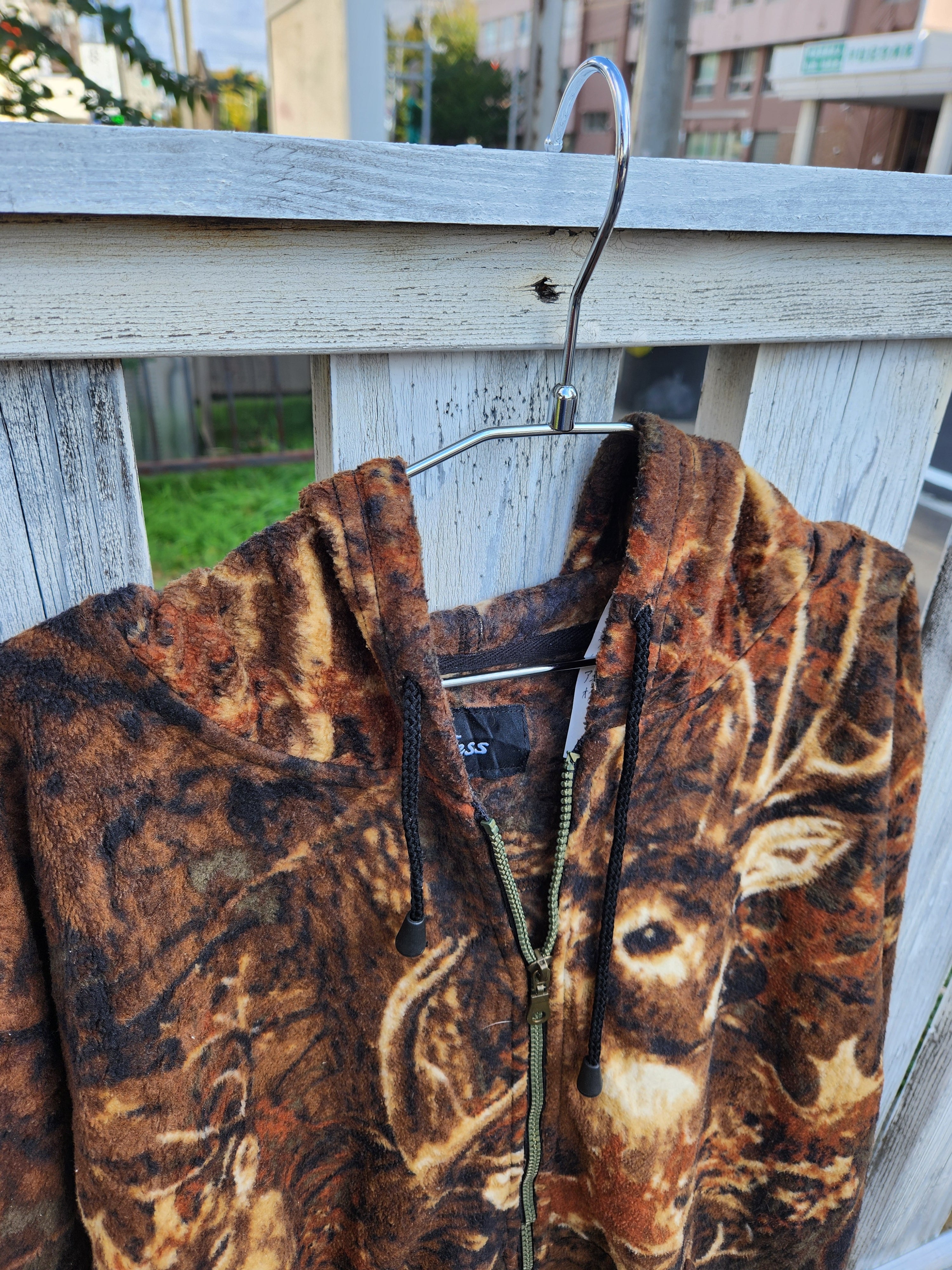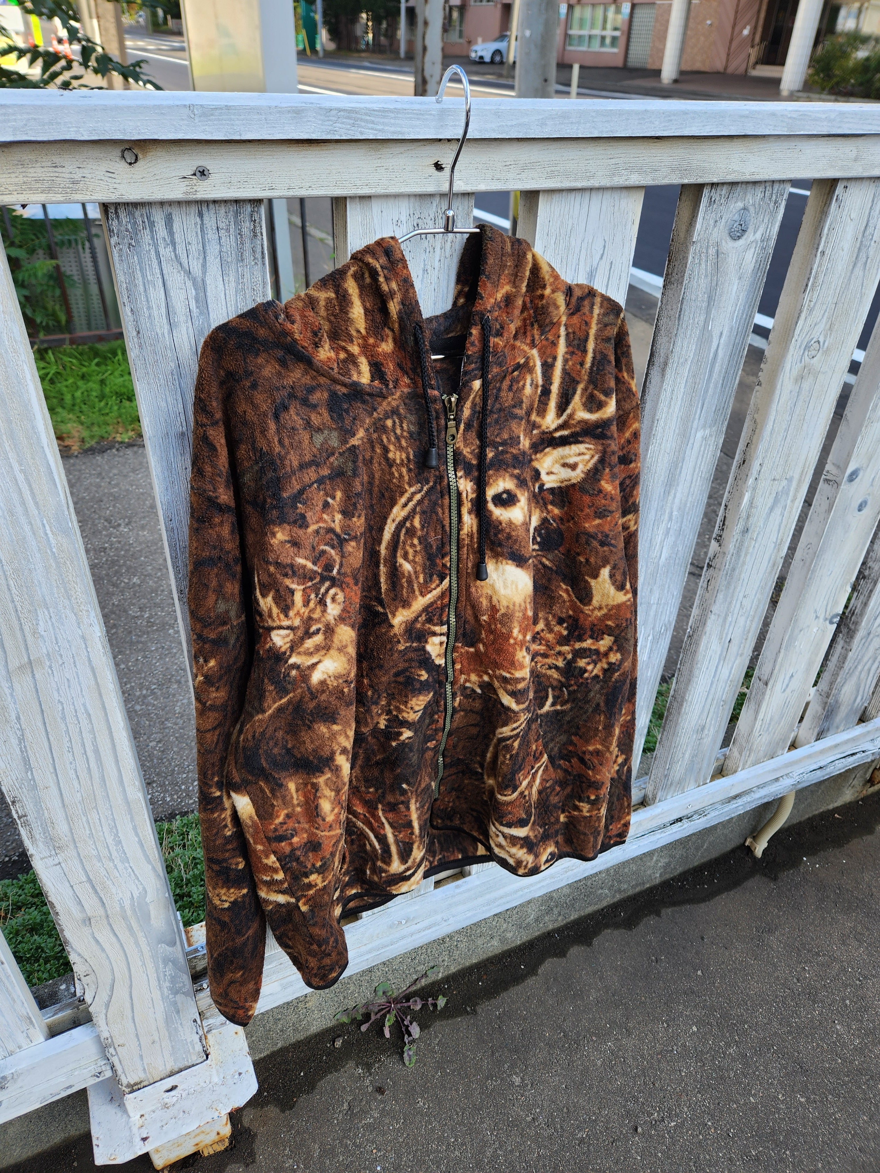 ブランド「Jess」による、鹿(ディア)柄の総柄フリースジップパーカー。