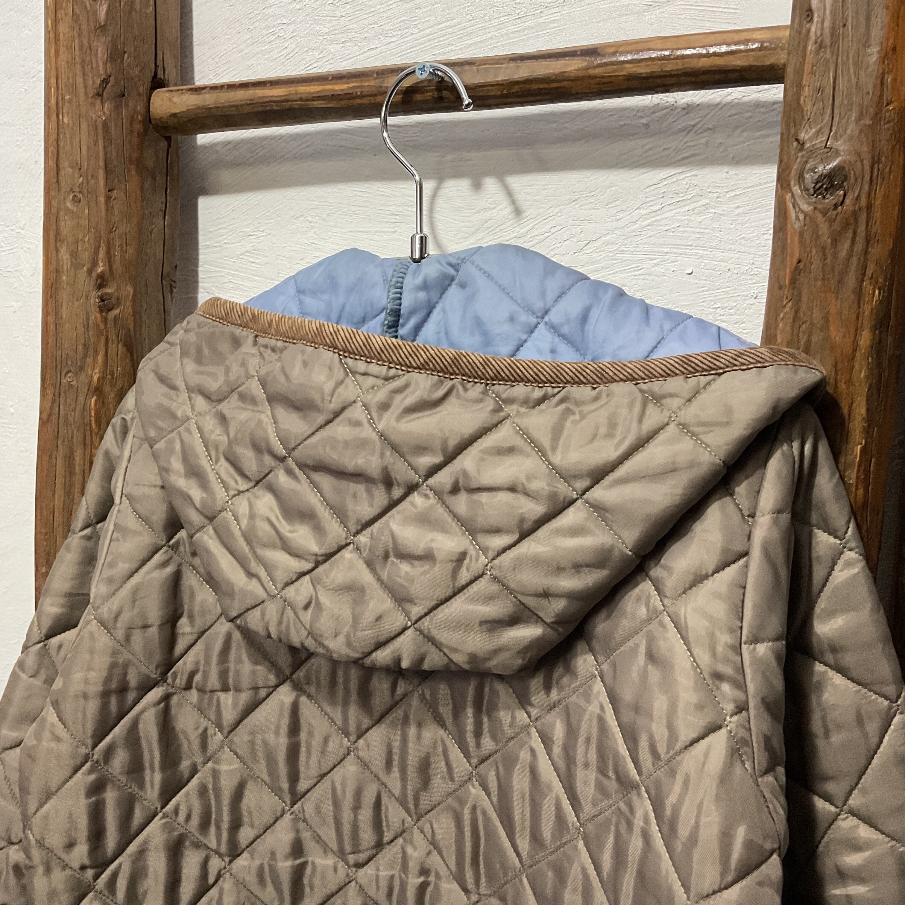 表地は上品な光沢のあるポリエステルキルト、裏地は淡いブルーのナイロンライニング。縁取りやポケット口には太畝コーデュロイのトリミングが施され、クラシカルで温かみのある英国カントリースタイルを感じる。