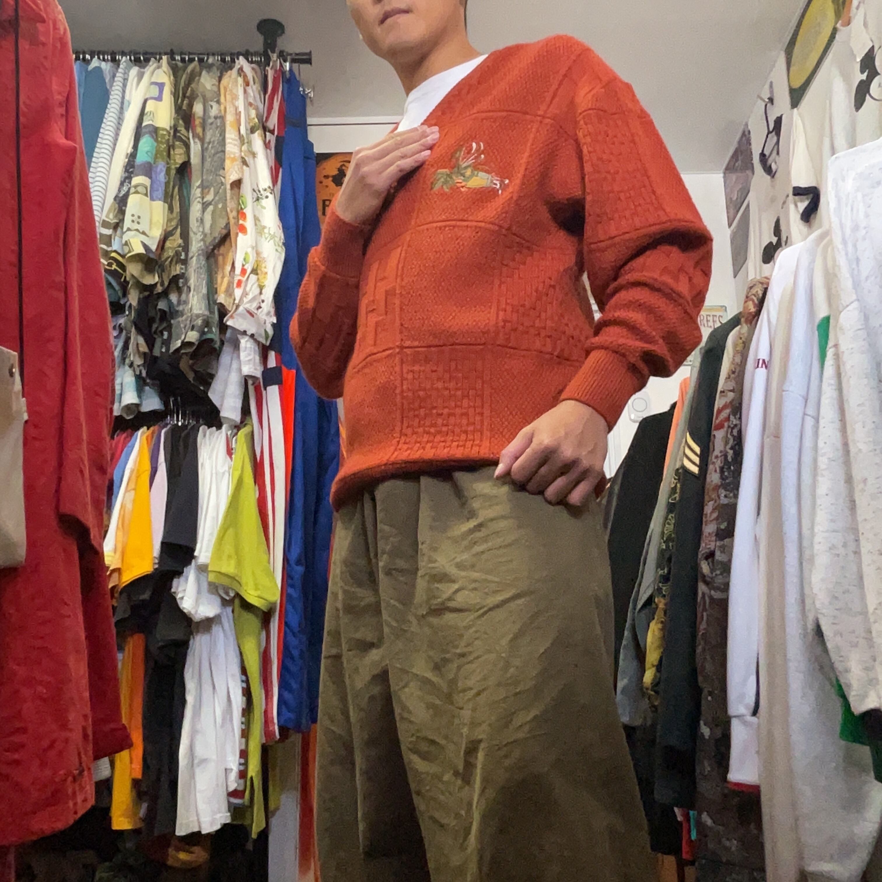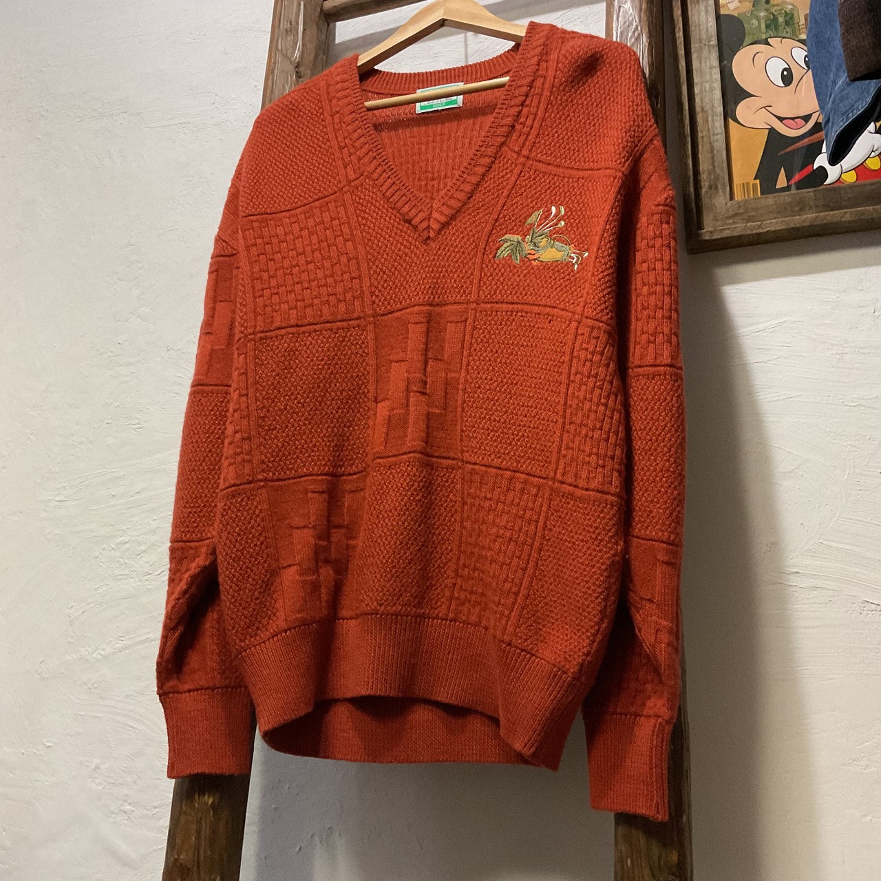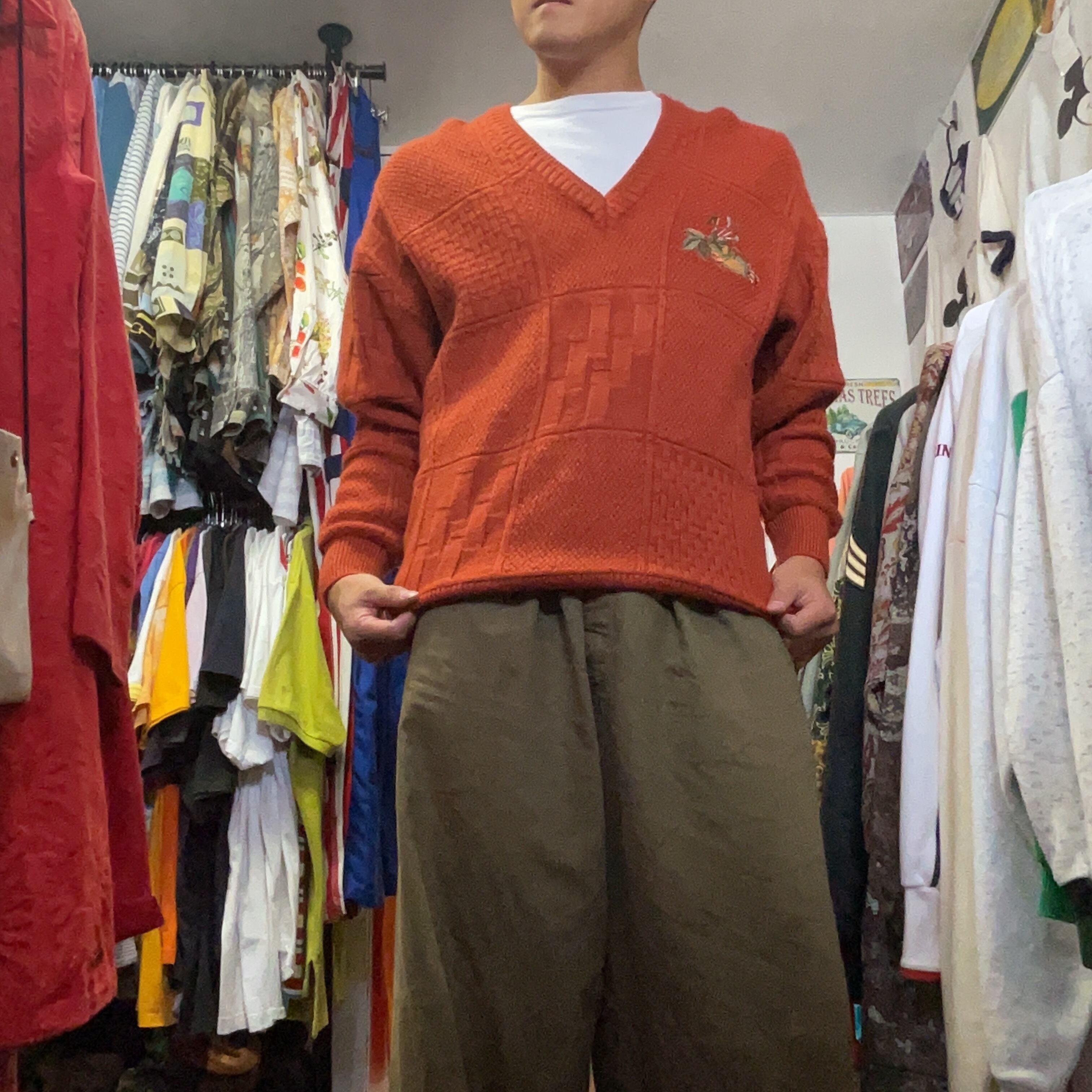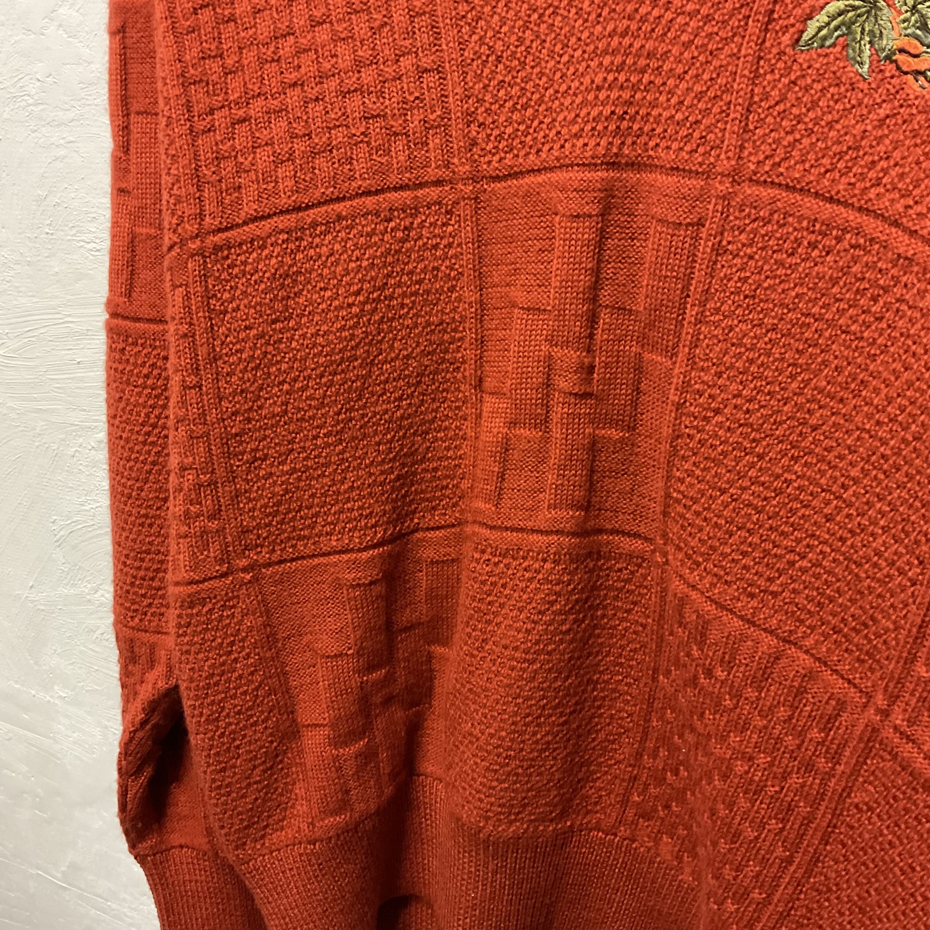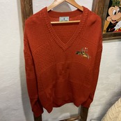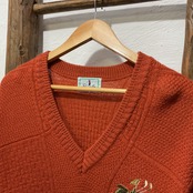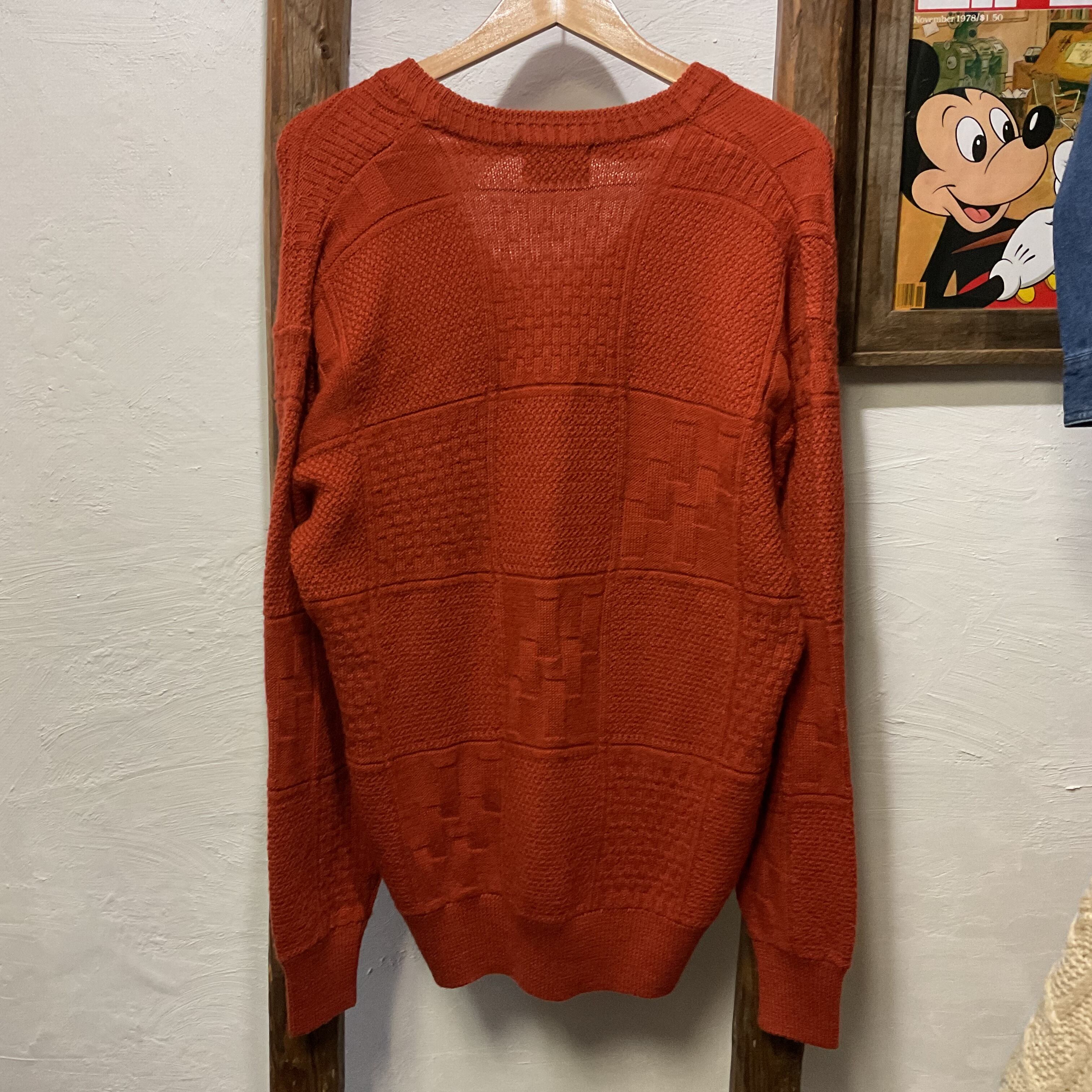 深みのあるブリックオレンジが映える、フルマックス・ゴルフのウール100% Vネックニット。