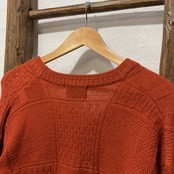 身頃全体をブロック状に切り替えたパッチワーク編み(天竺・鹿の子・ケーブルなど)で構成し、編み地の凹凸によって陰影が生まれる表情豊かな1枚。ネックはやや深めのVネックで、先端に小さなVスリット入り。インナーにシャツやタートルを挟むと襟元のレイヤードがきれいに決まる。