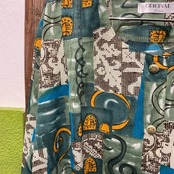 幾何学模様とアブストラクトな線画を組み合わせた独特な総柄デザインで、ブルーグリーン・マスタードイエロー・ブラウンの色調がレトロな雰囲気を漂う。