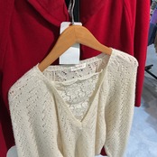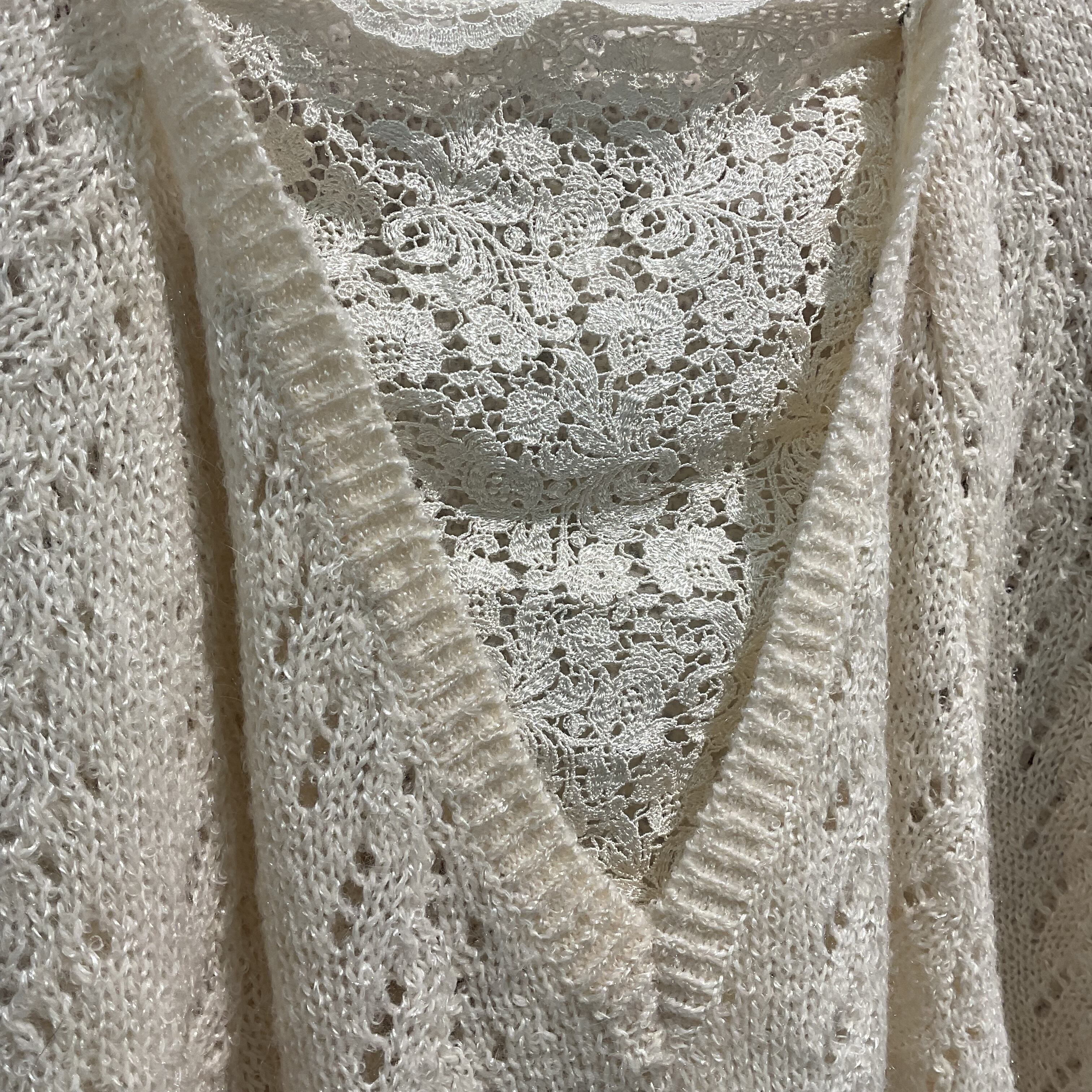 柔らかな生成りカラーと繊細なレースインナー風デザインが特徴で、フェミニンかつ上品な印象。