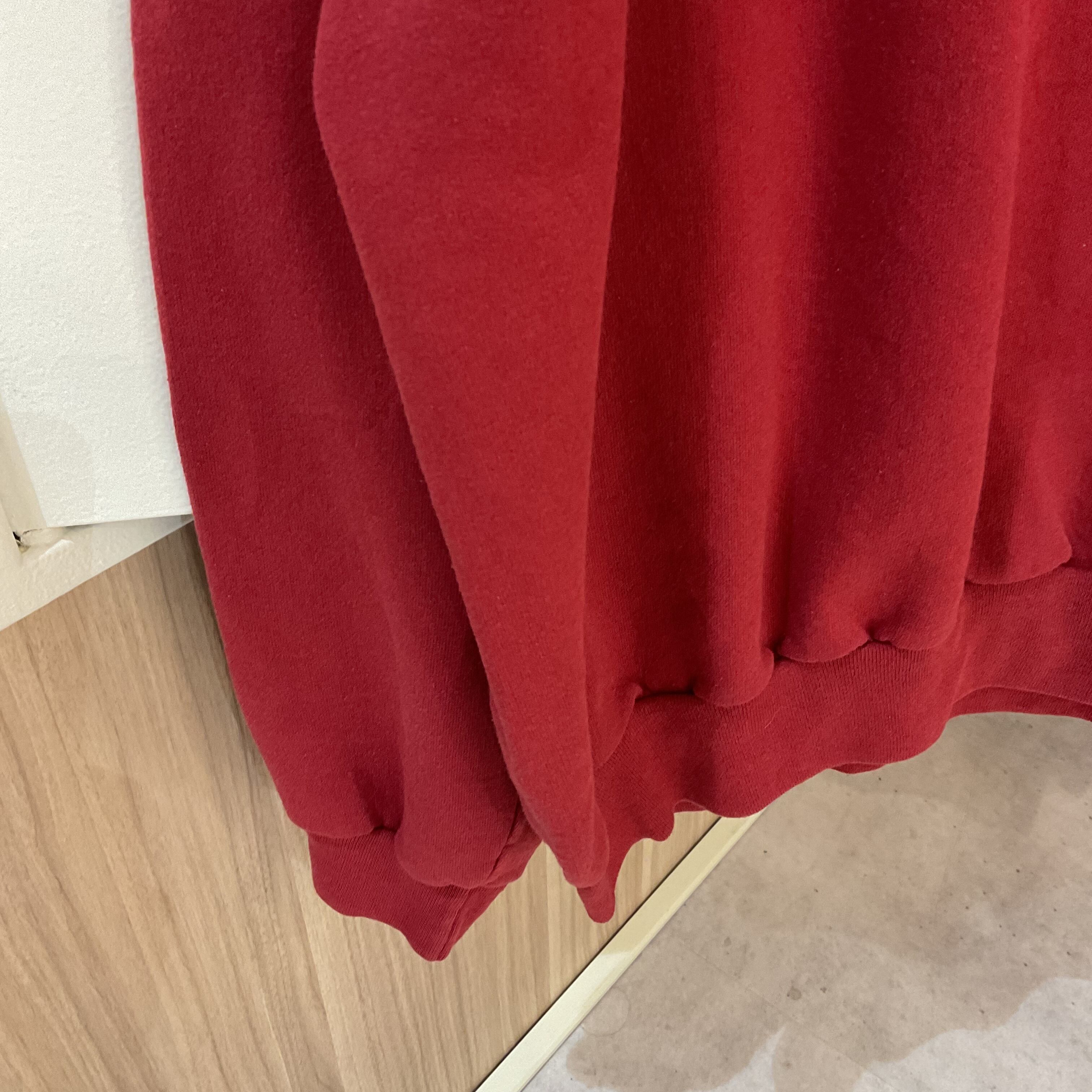 深みのあるバーガンディカラーのスウェットに、胸元へ施されたハート型の刺繍アップリケが印象的な1枚。