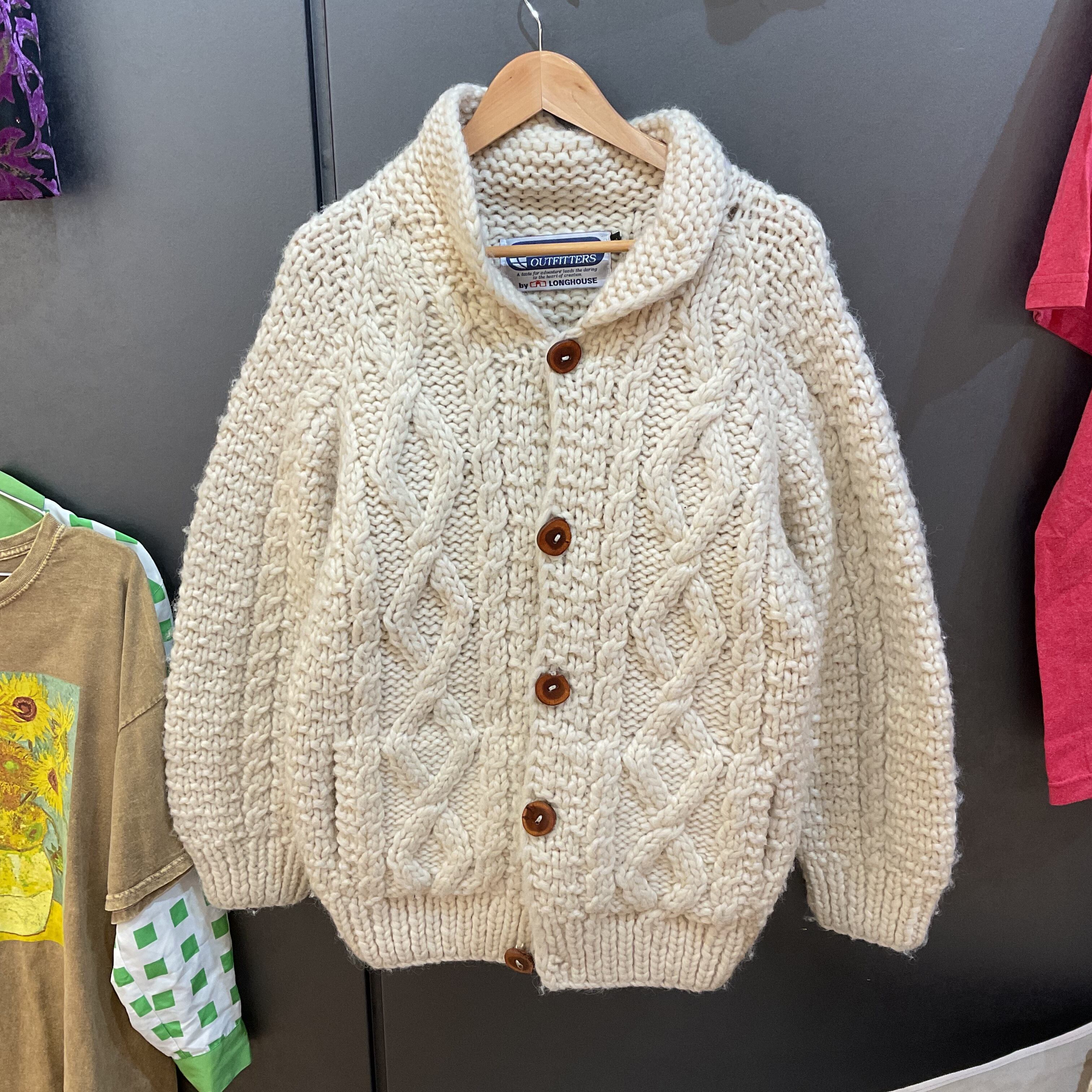 極厚のウール糸で編まれた、クラシックなカウチンタイプのショールカラーカーディガン。