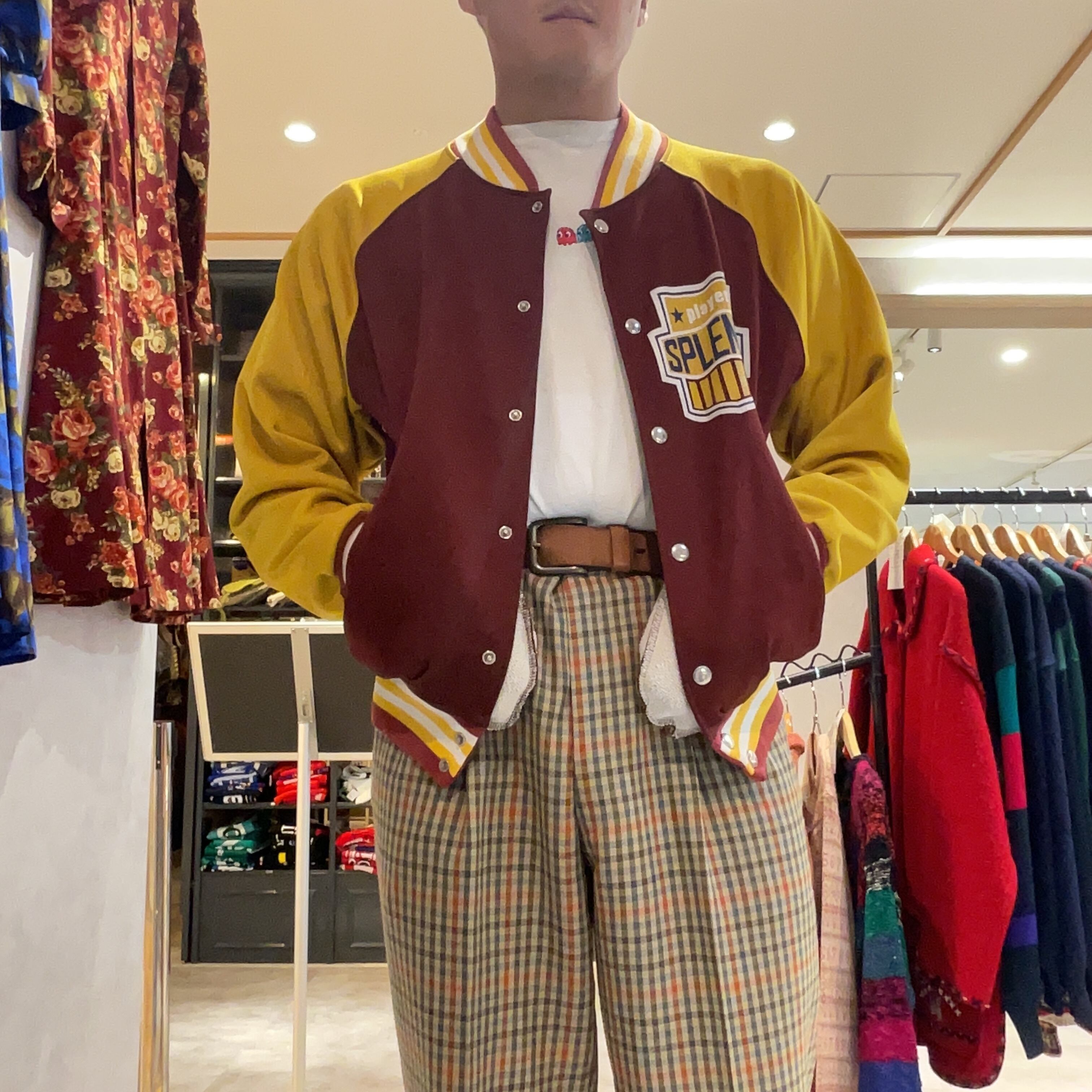 バーガンディとマスタードの切り替えが印象的なスウェット素材のスタジャン風ジャケット。
