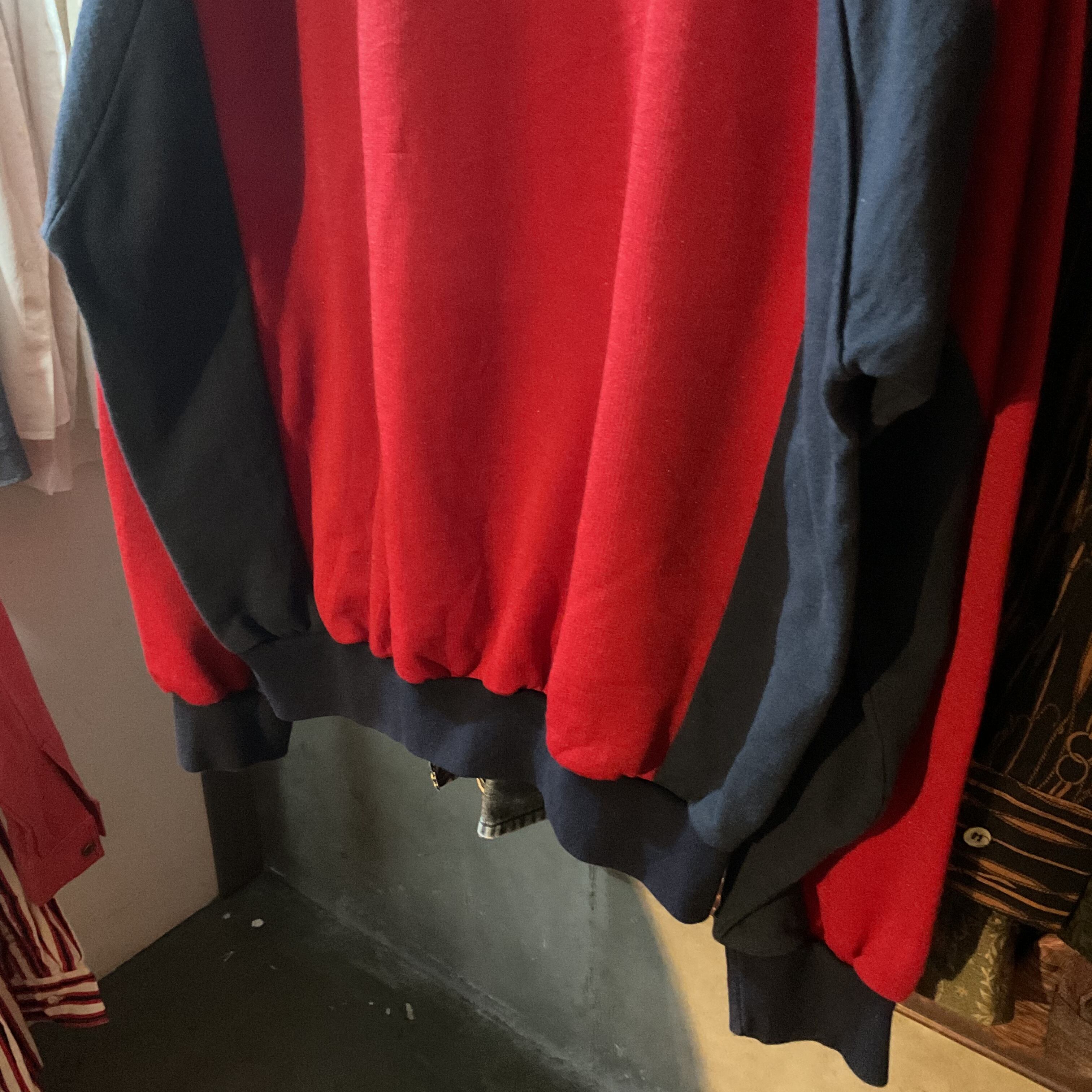 鮮やかなレッド × ネイビーの2トーン切り替えが目を引くUKメイドのスウェット。