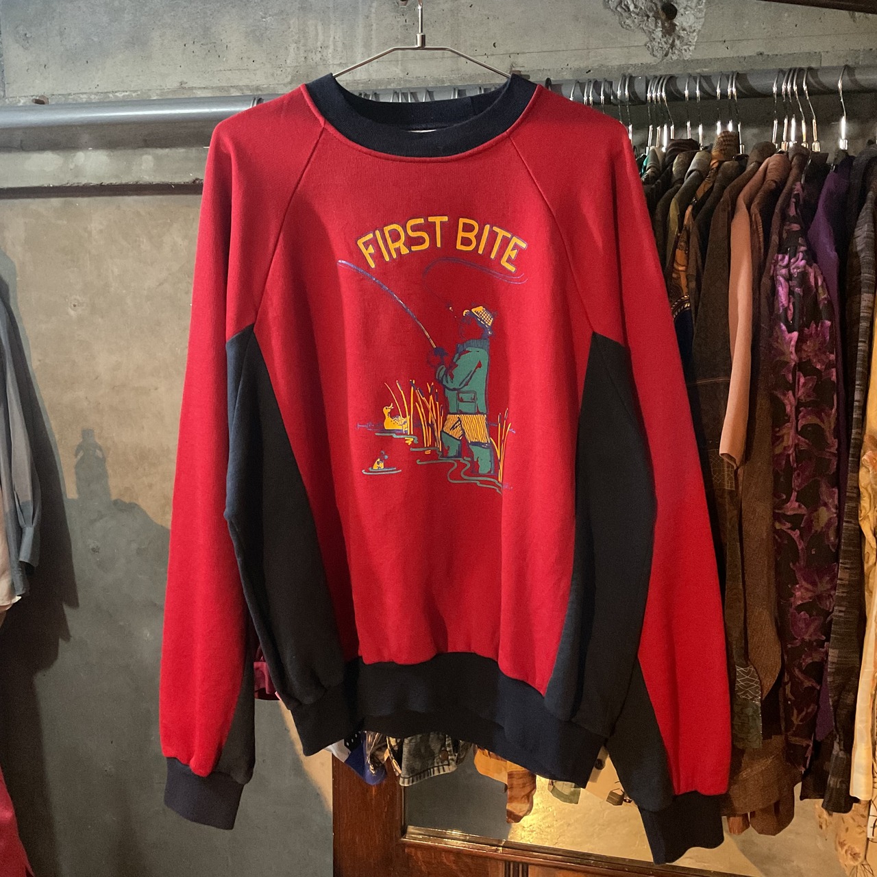 フロントには釣り人を描いたコミカルなプリント「FIRST BITE」。90sらしいユルい雰囲気のタッチで、古着ならではの遊び心ある1枚。