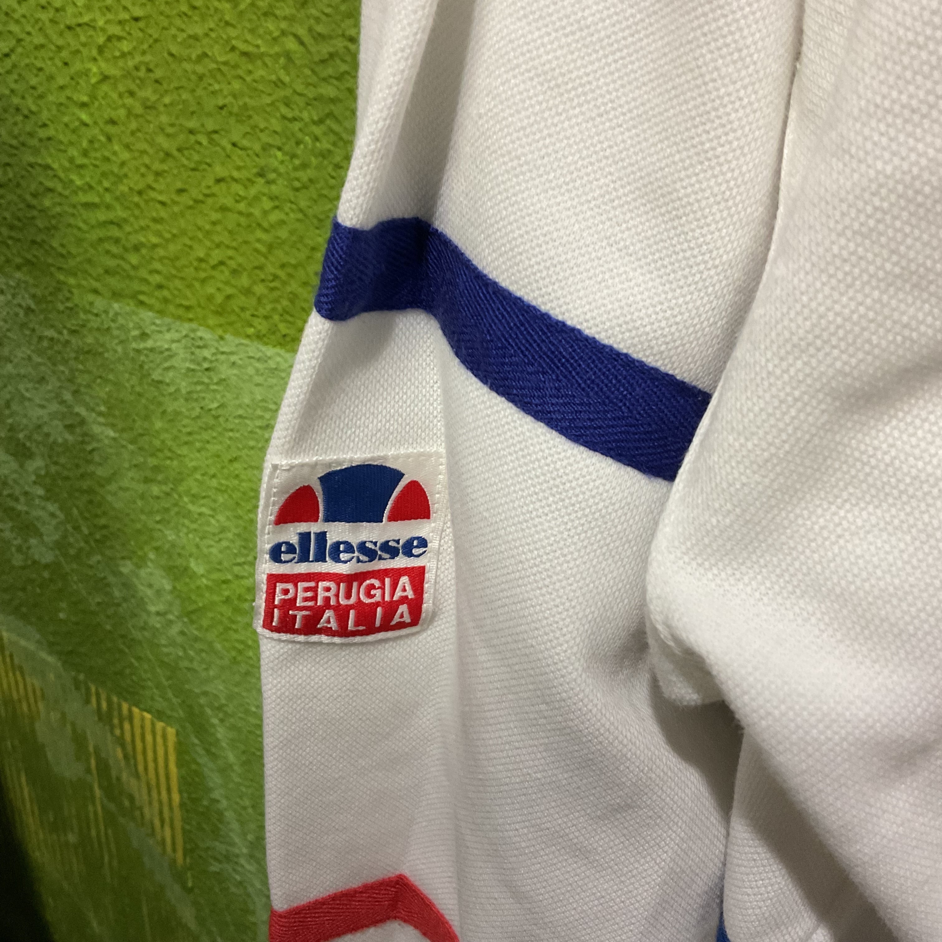 フロントには大判の 刺繍ロゴ(ブルー糸) と、イタリア語でプリントされたブランドメッセージが入り、「イタリア × スポーツ × レトロ」の世界観がしっかり表現されたデザイン。