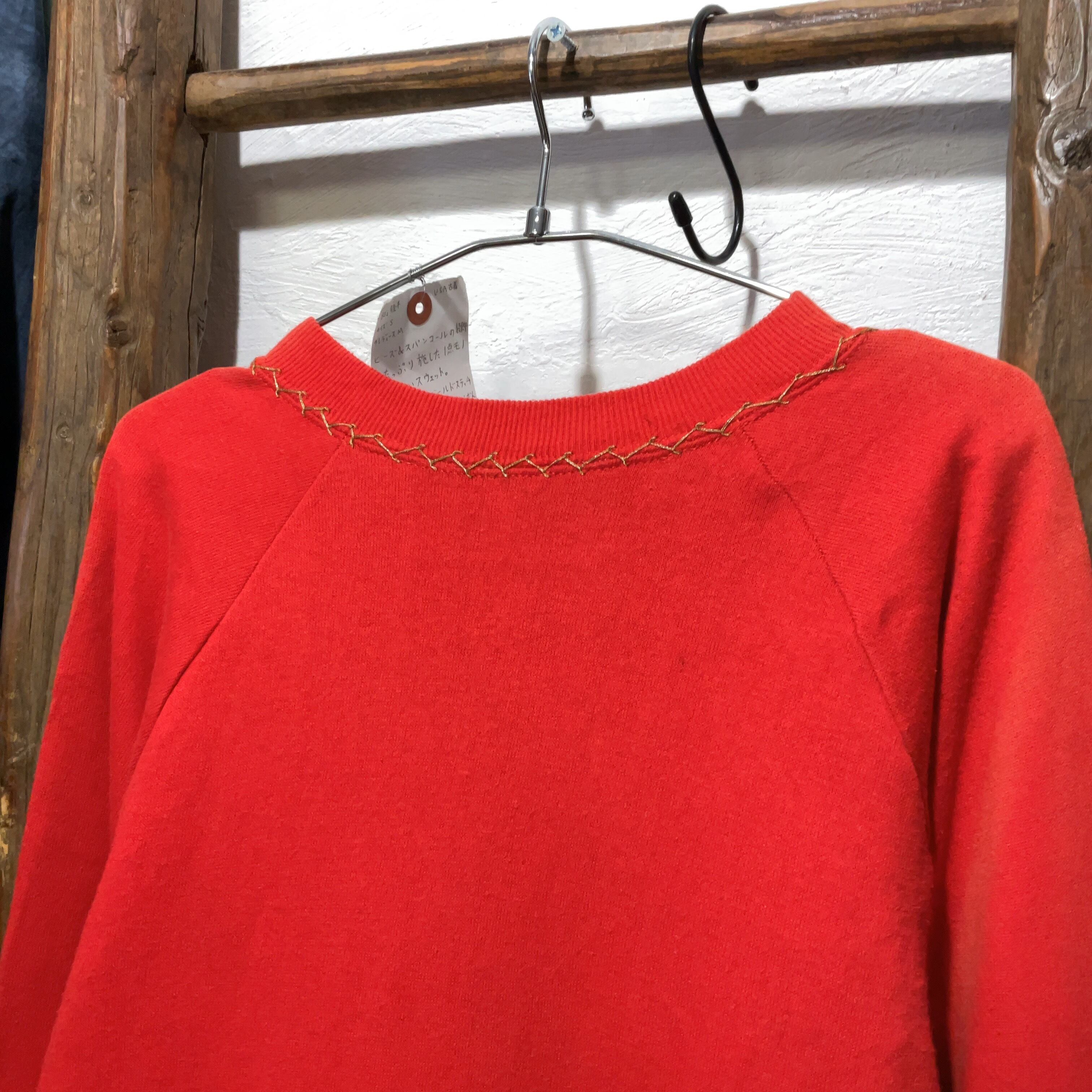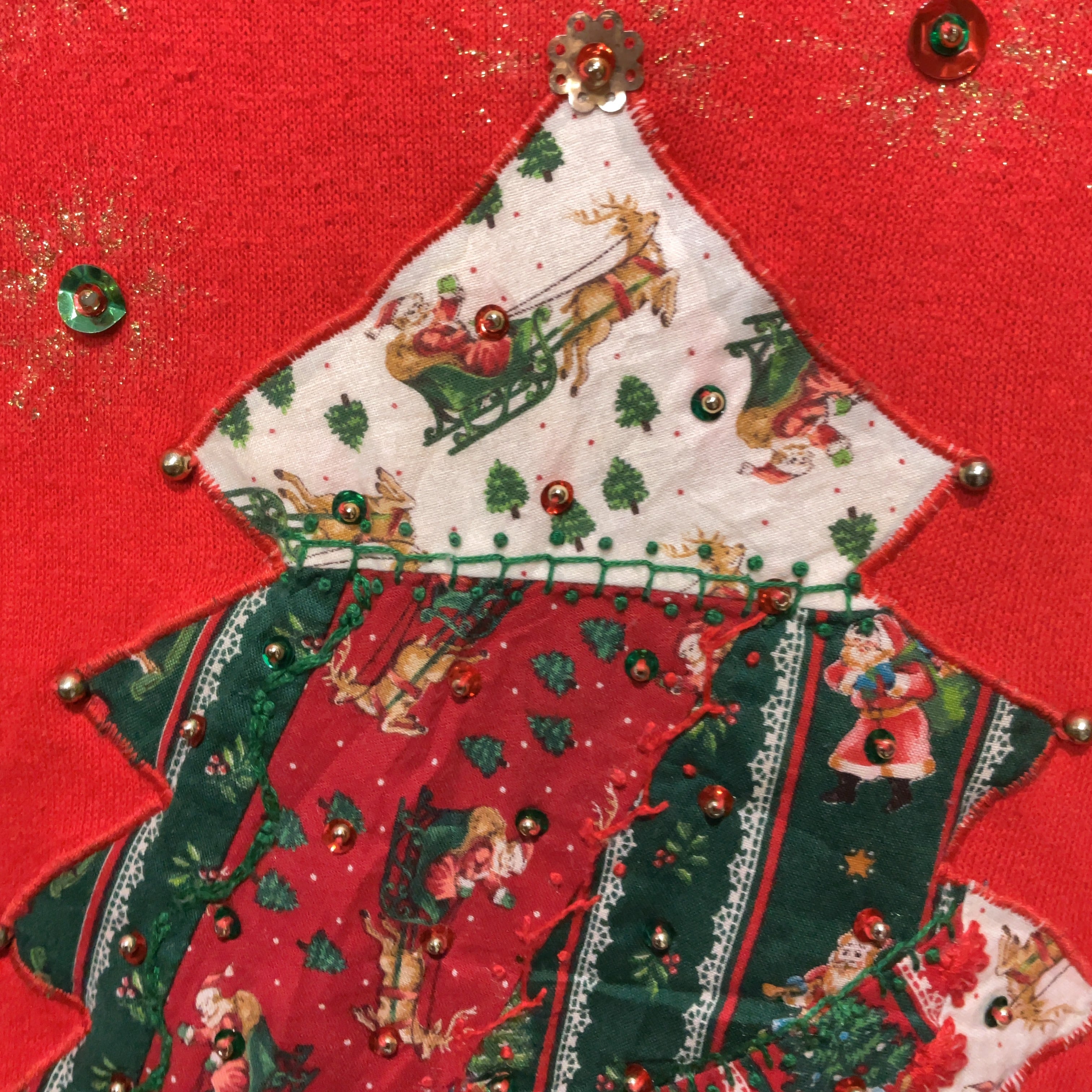 アメリカ製のハンドメイドクリスマススウェット。鮮やかなレッドボディに、布パッチをツリー型に重ねて縫い付けたパッチワークデザインが非常に可愛い1点物。さらに カラービーズの手縫い装飾や ゴールドのステッチも施され、80~90年代らしい温かみのあるクラフト感が魅力。
