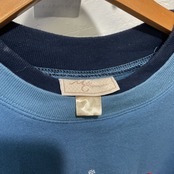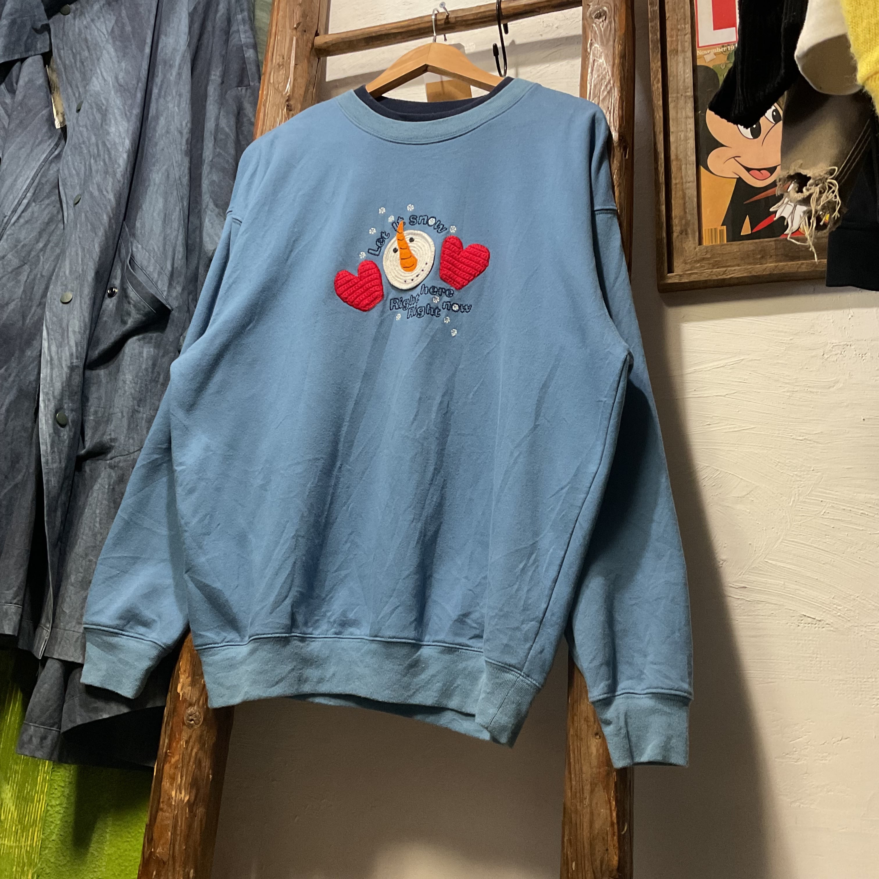 やわらかいフェードブルーのボディに、立体的なスノーマン刺繍+ぷっくりハートがあしらわれた季節感あるスウェット。