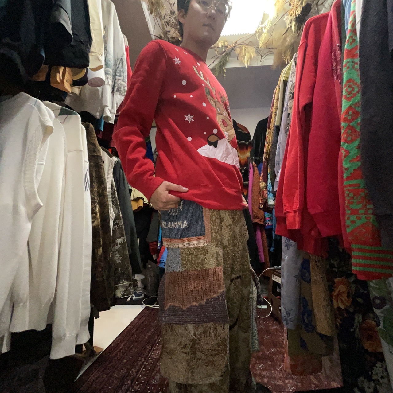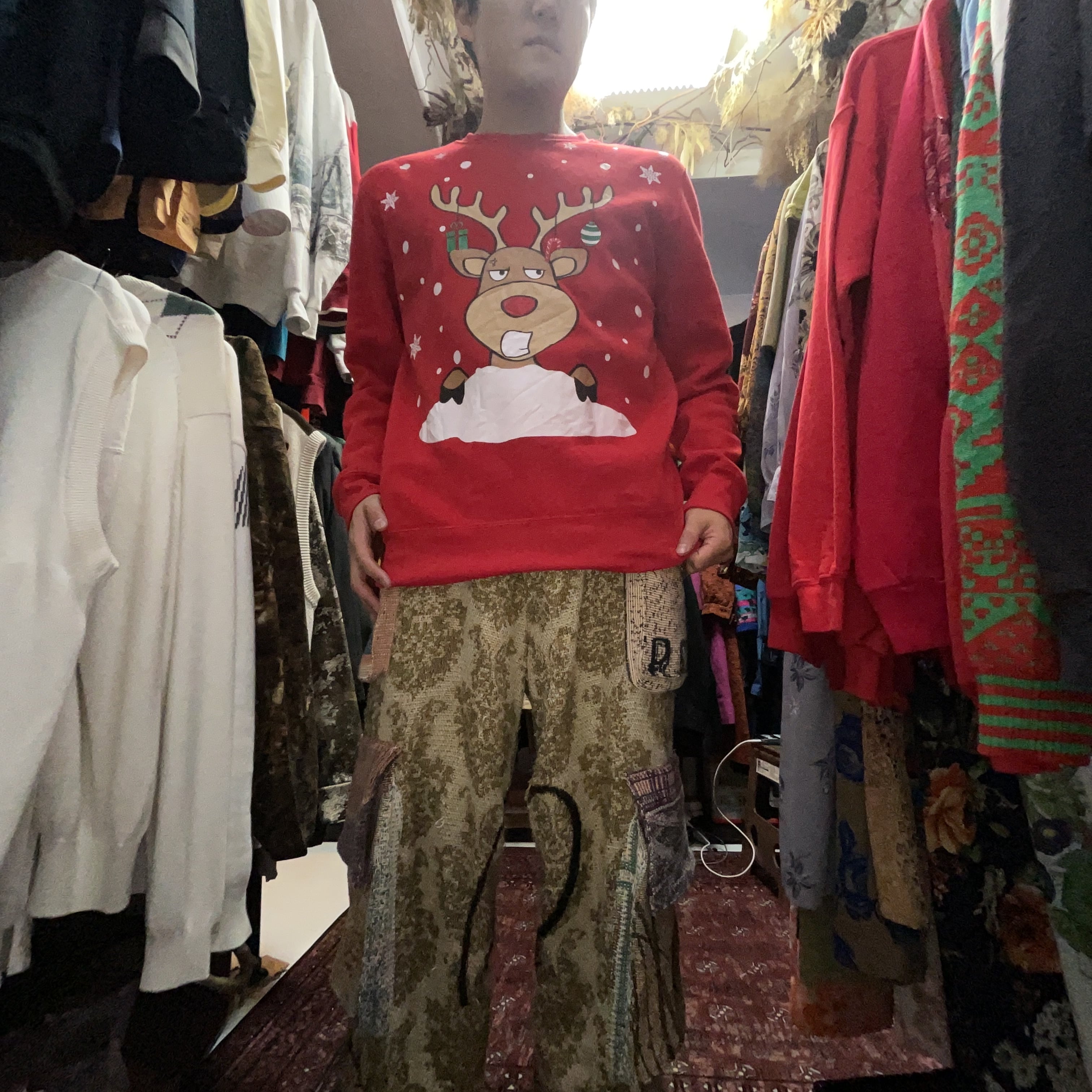 角にはオーナメントやギフトが描かれ、雪柄ドットも入った、いわゆる “Ugly Christmas Sweater” デザイン。