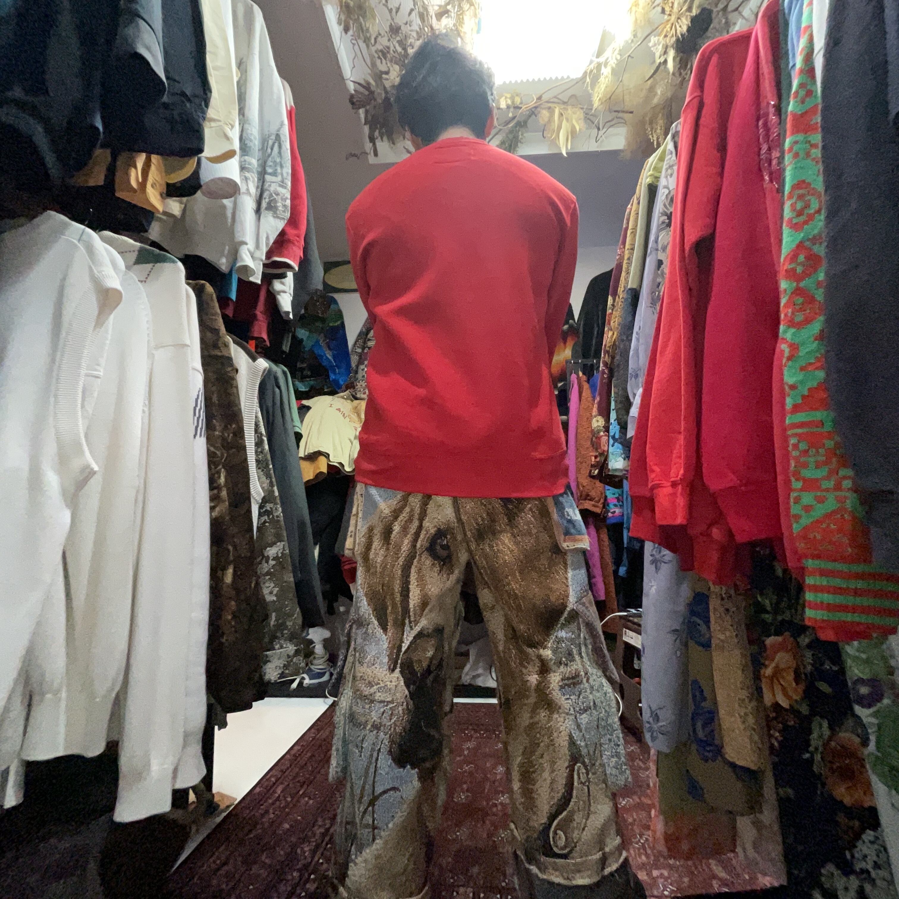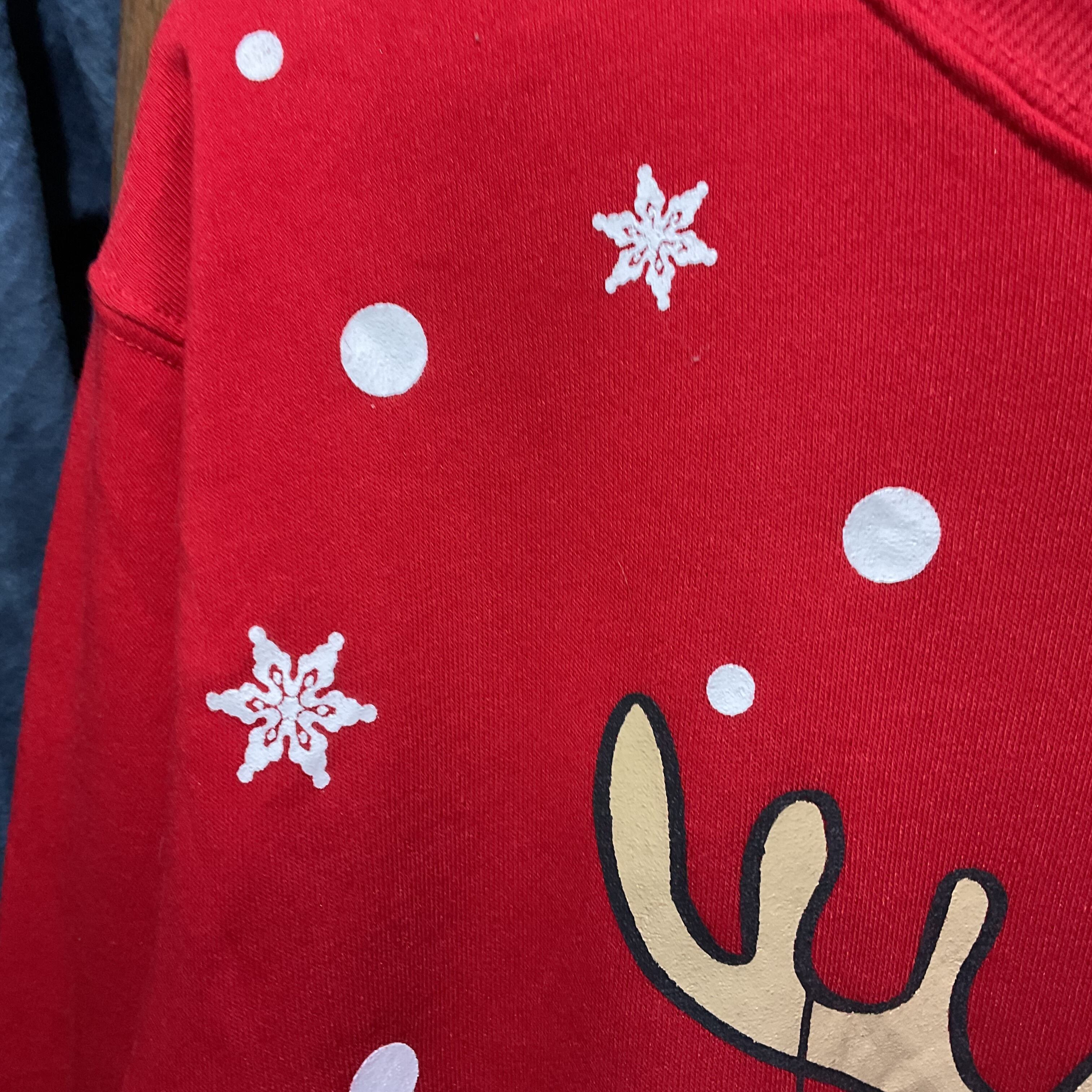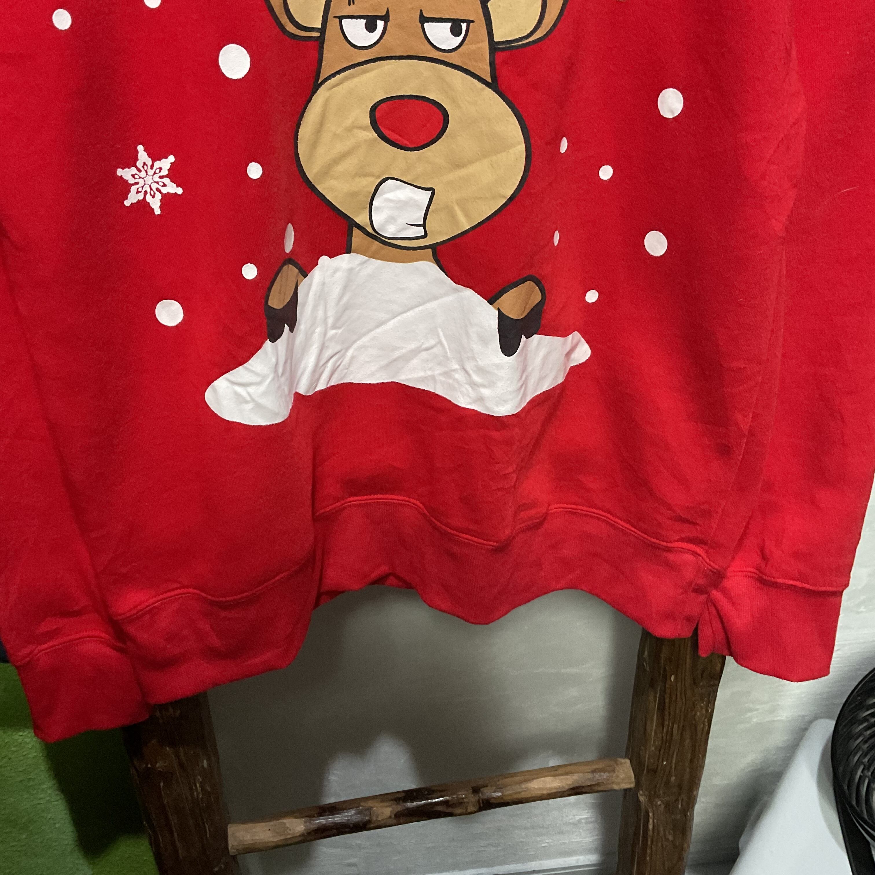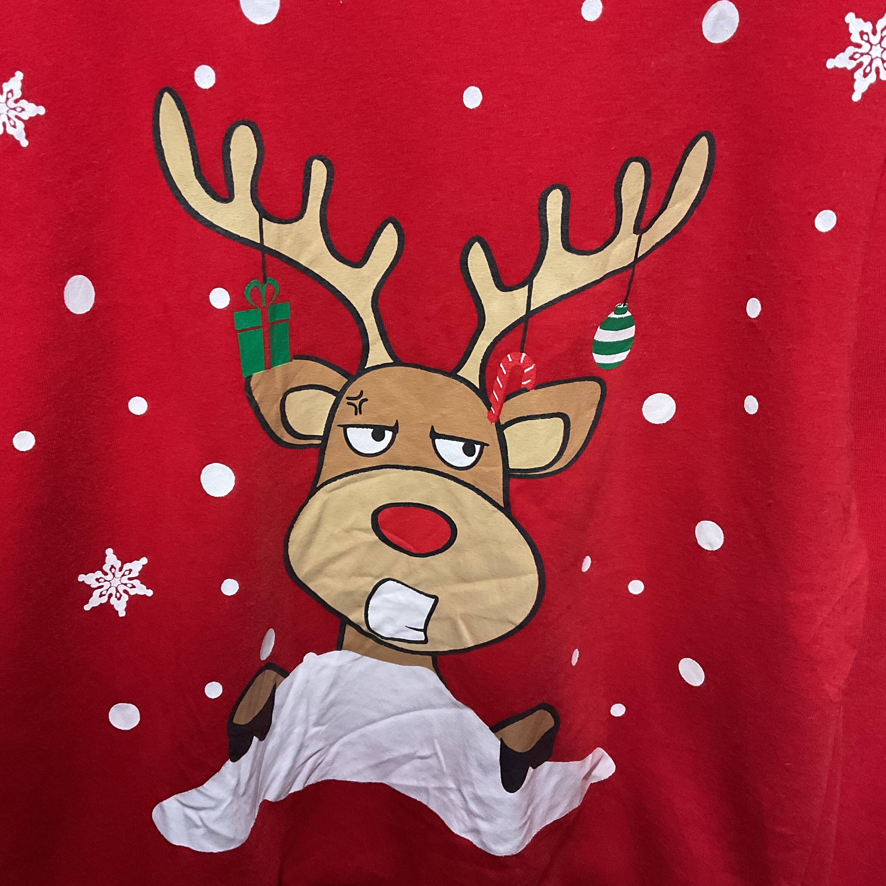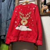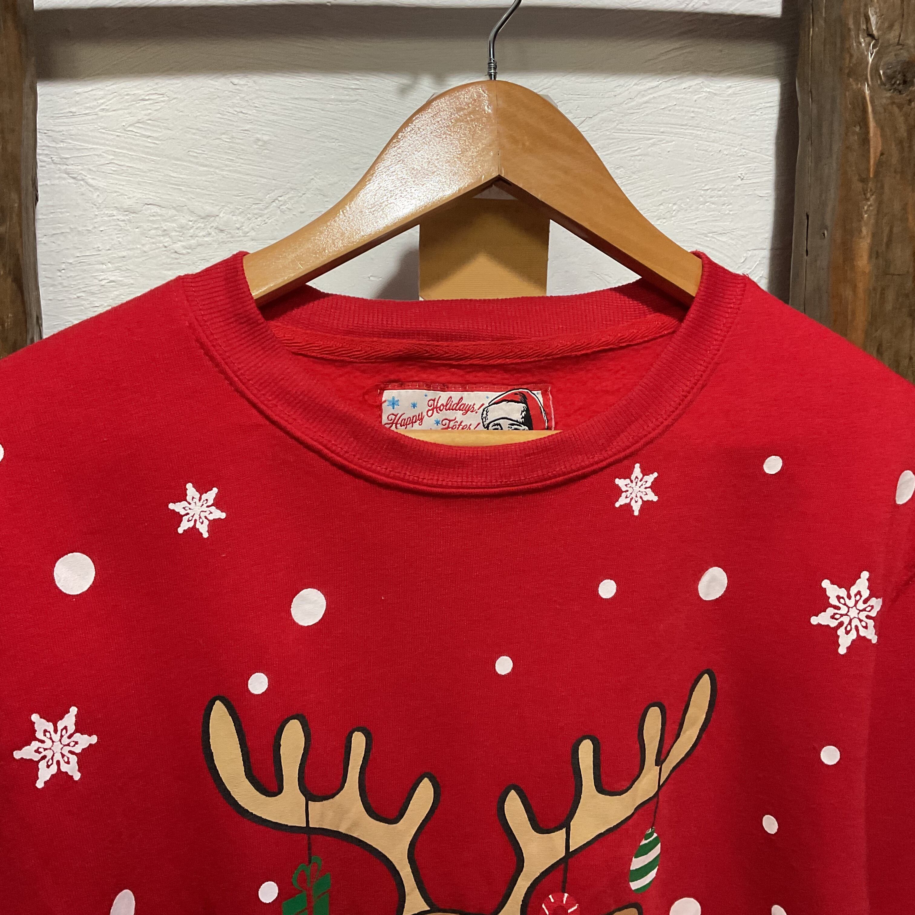 赤ボディに、表情のあるトナカイが大胆にプリントされたクリスマススウェット。