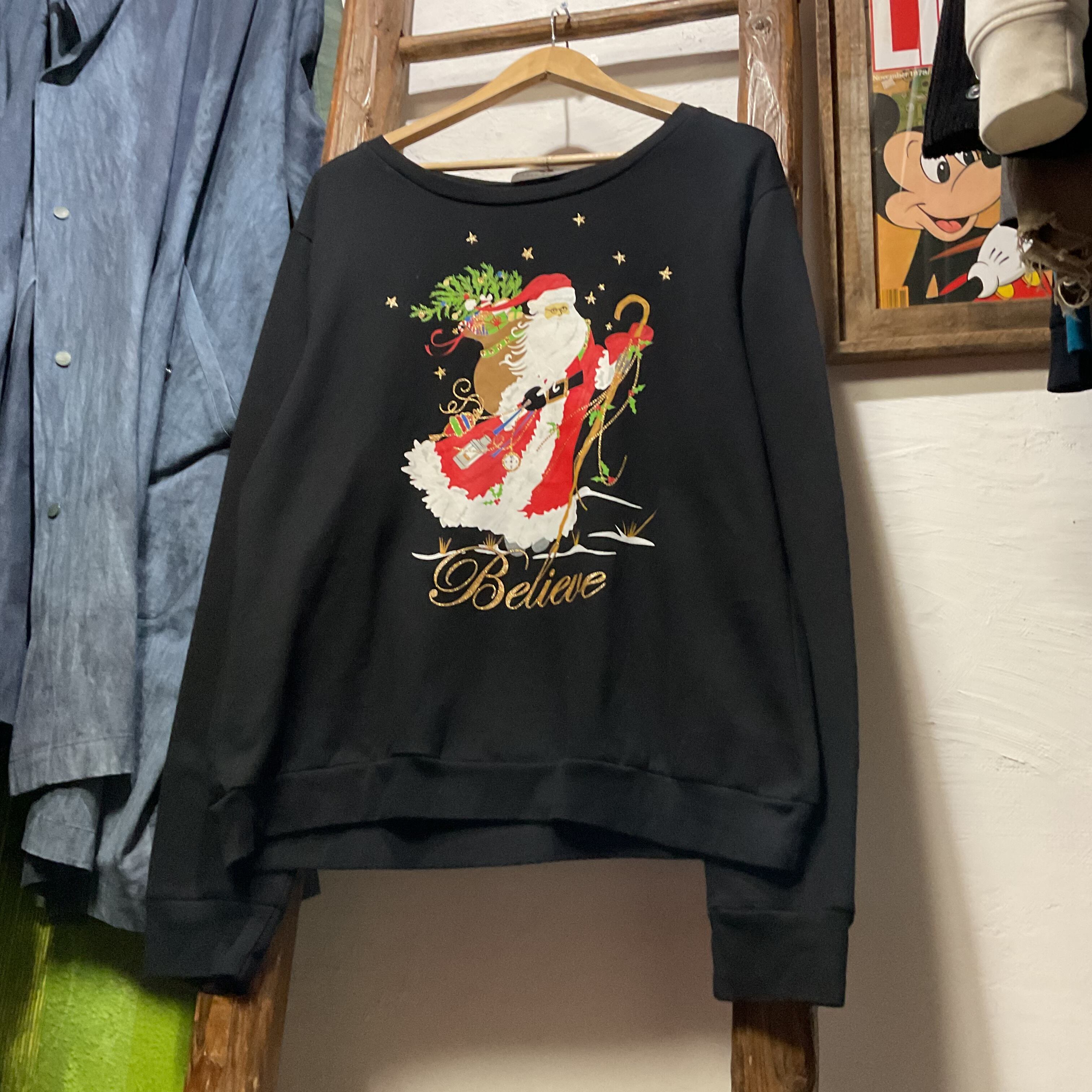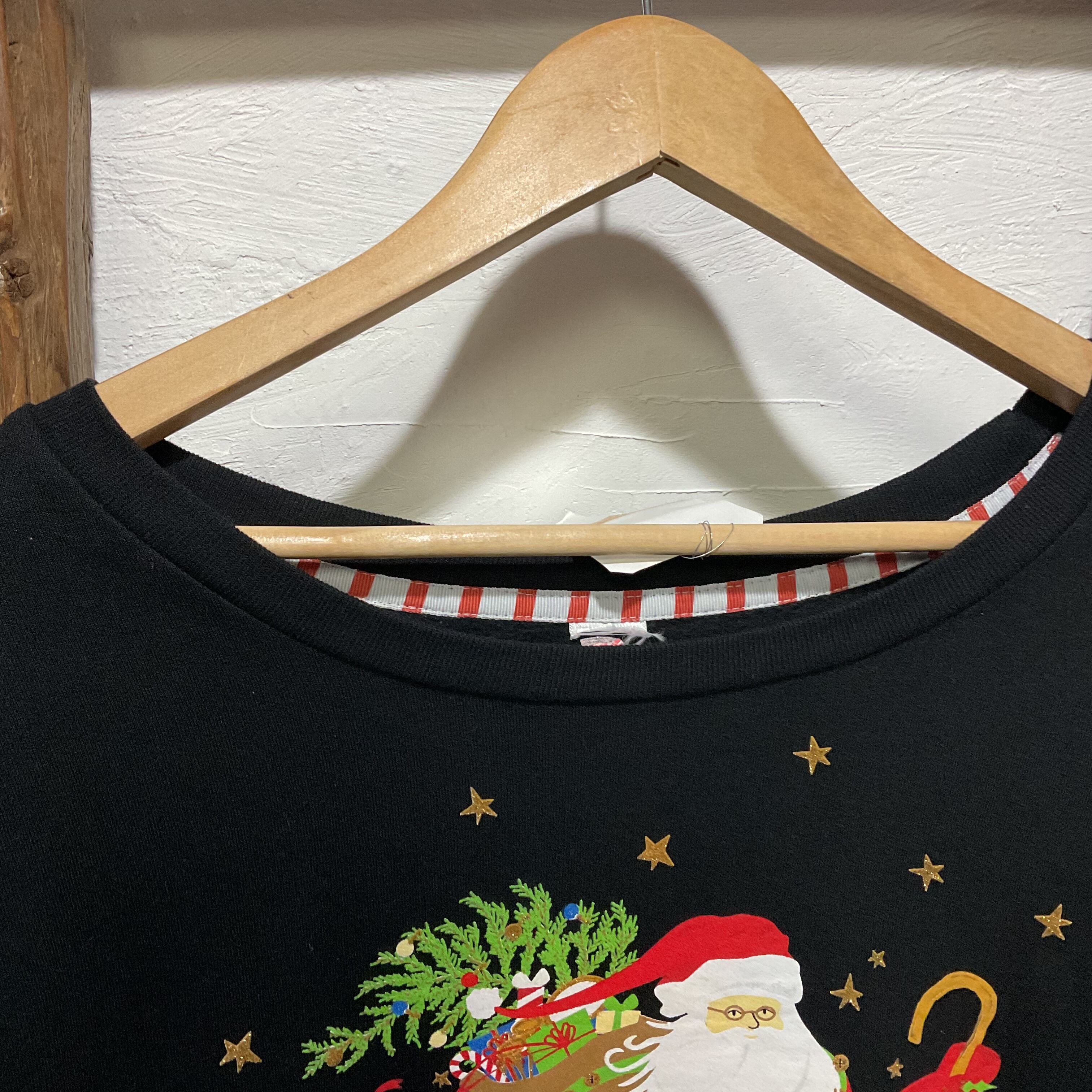 ブラックボディに、袋を担いだサンタクロースが描かれたインパクトのあるクリスマススウェット。星や装飾部分にはゴールド調プリントが使われ、ホリデー感の強い1枚。