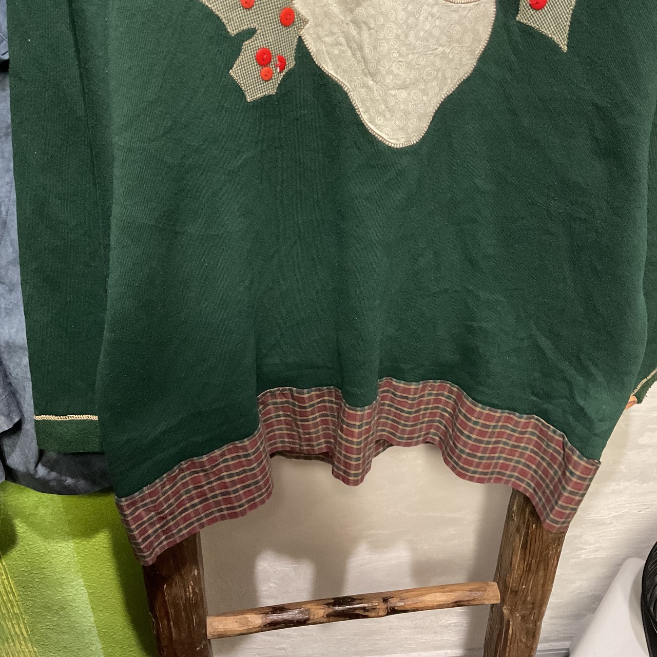 深いグリーンボディに、サンタの顔をアップリケで大胆に配置したクリスマススウェット。ヒイラギ部分はチェック生地+赤ボタンで実際に立体感があり、クラフト感が可愛い1枚。