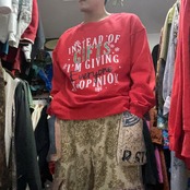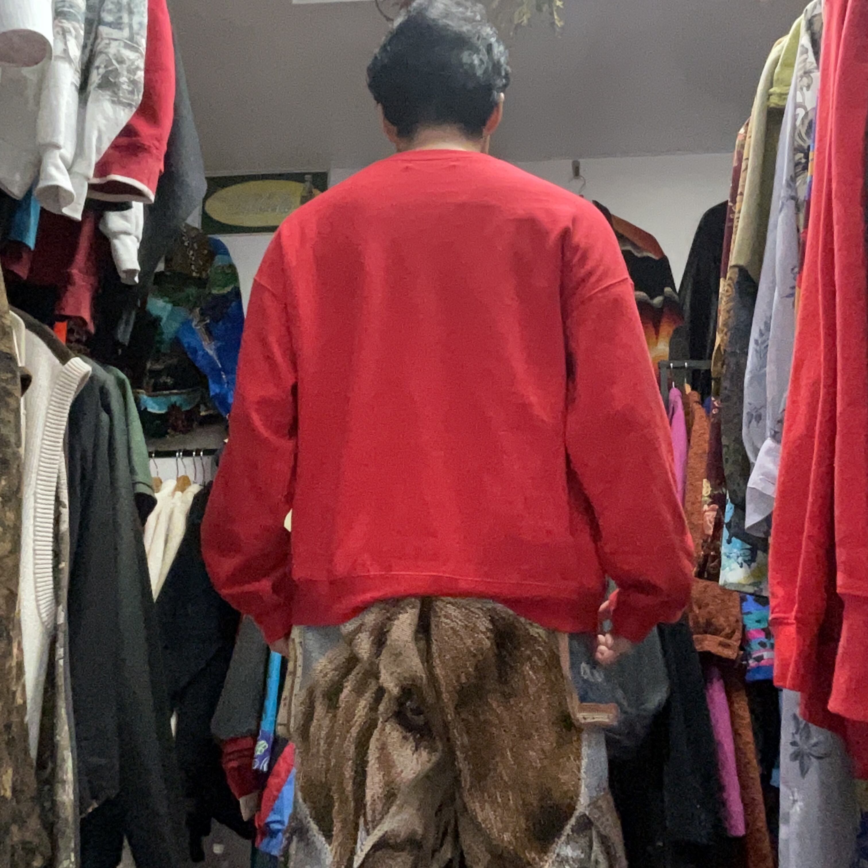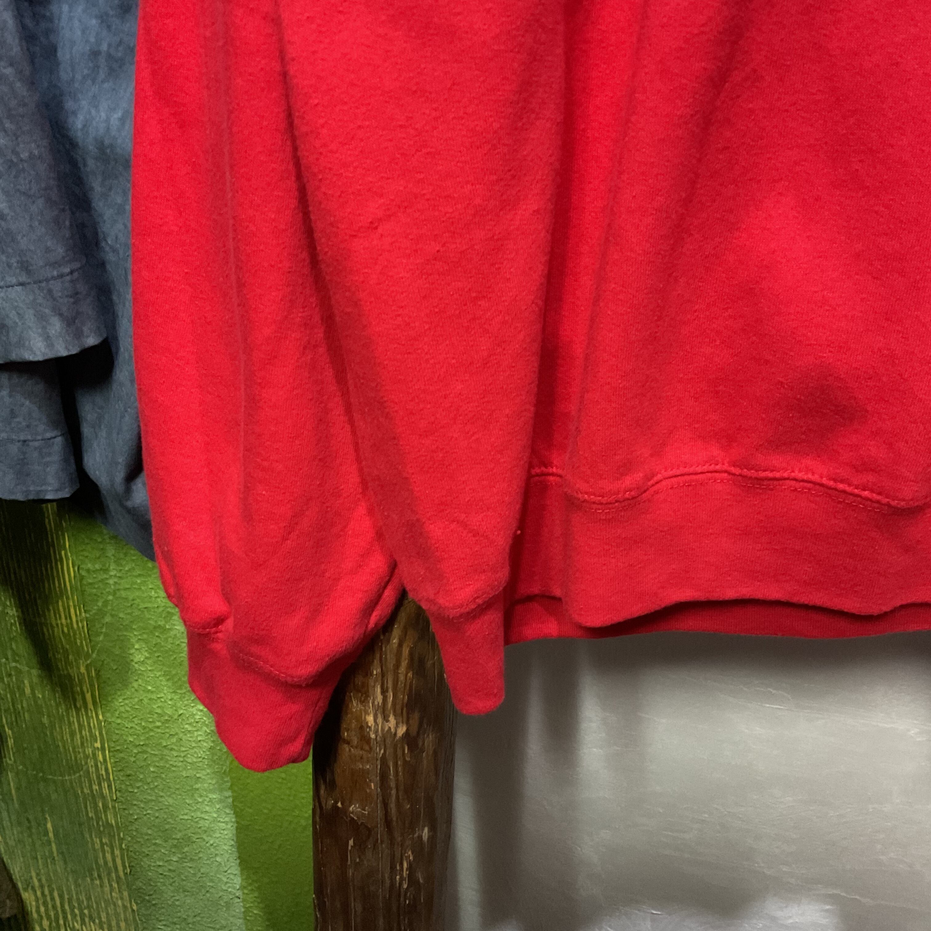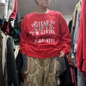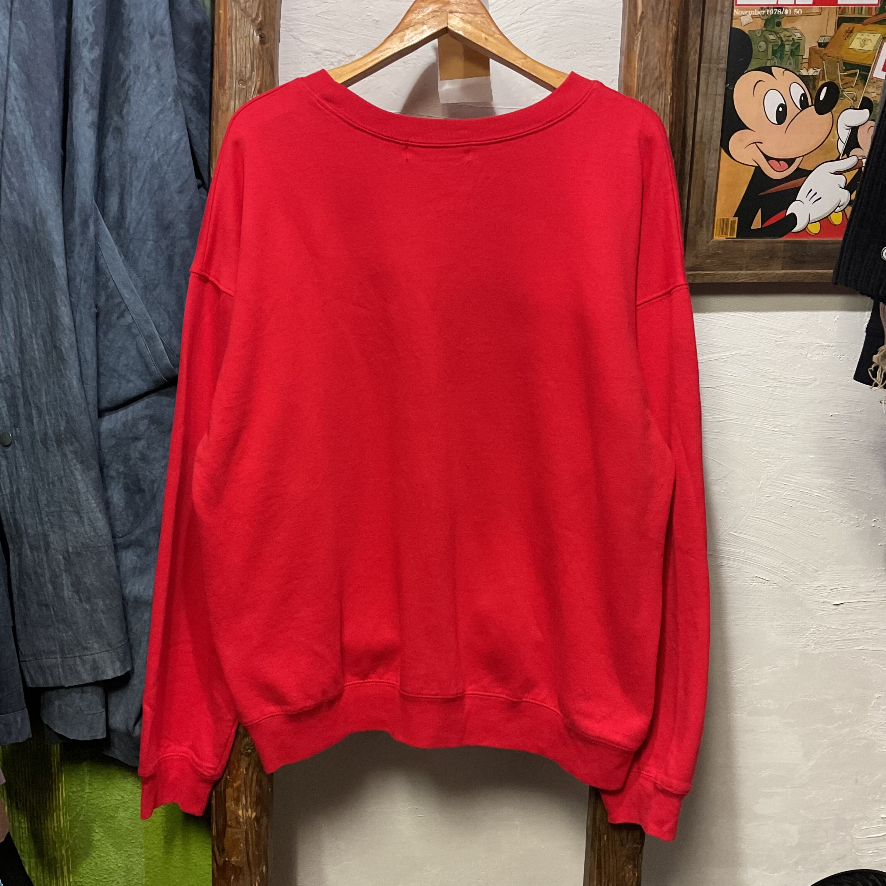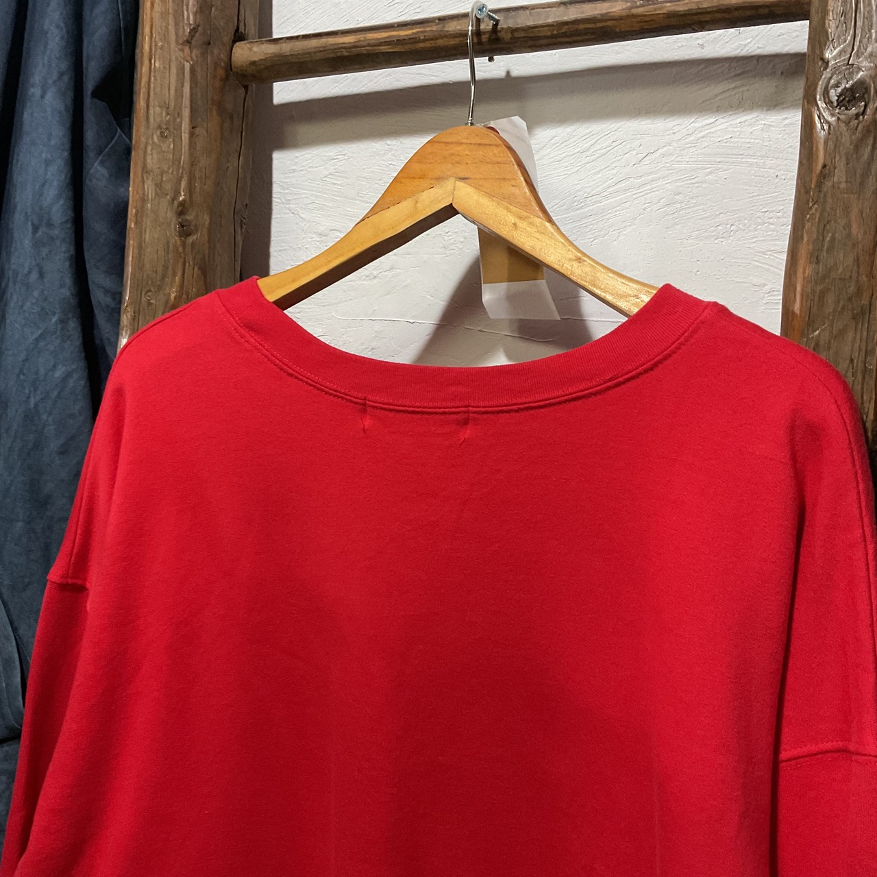 赤ボディに雪の結晶を散らした、ホリデームード満点のメッセージスウェット。