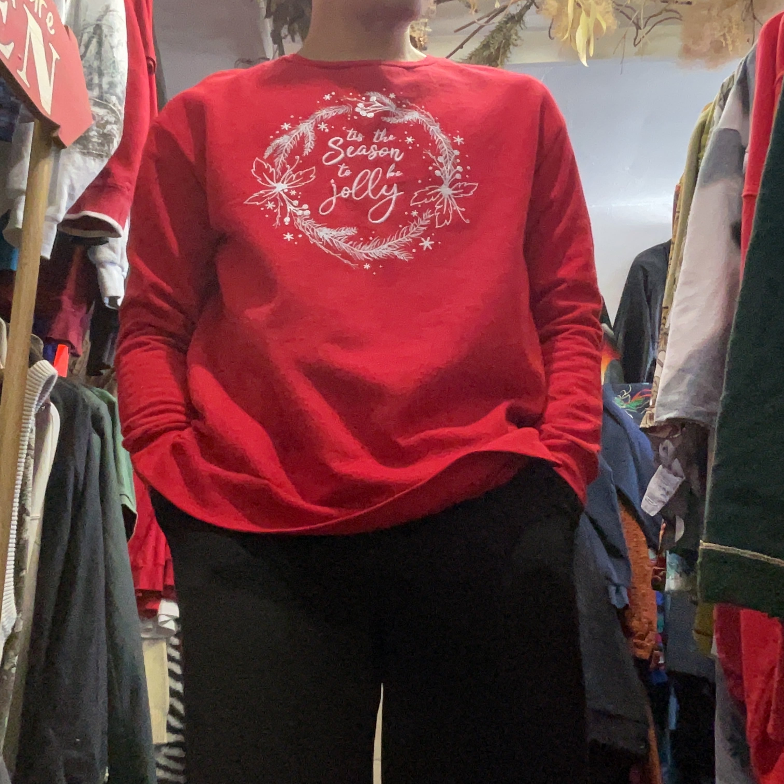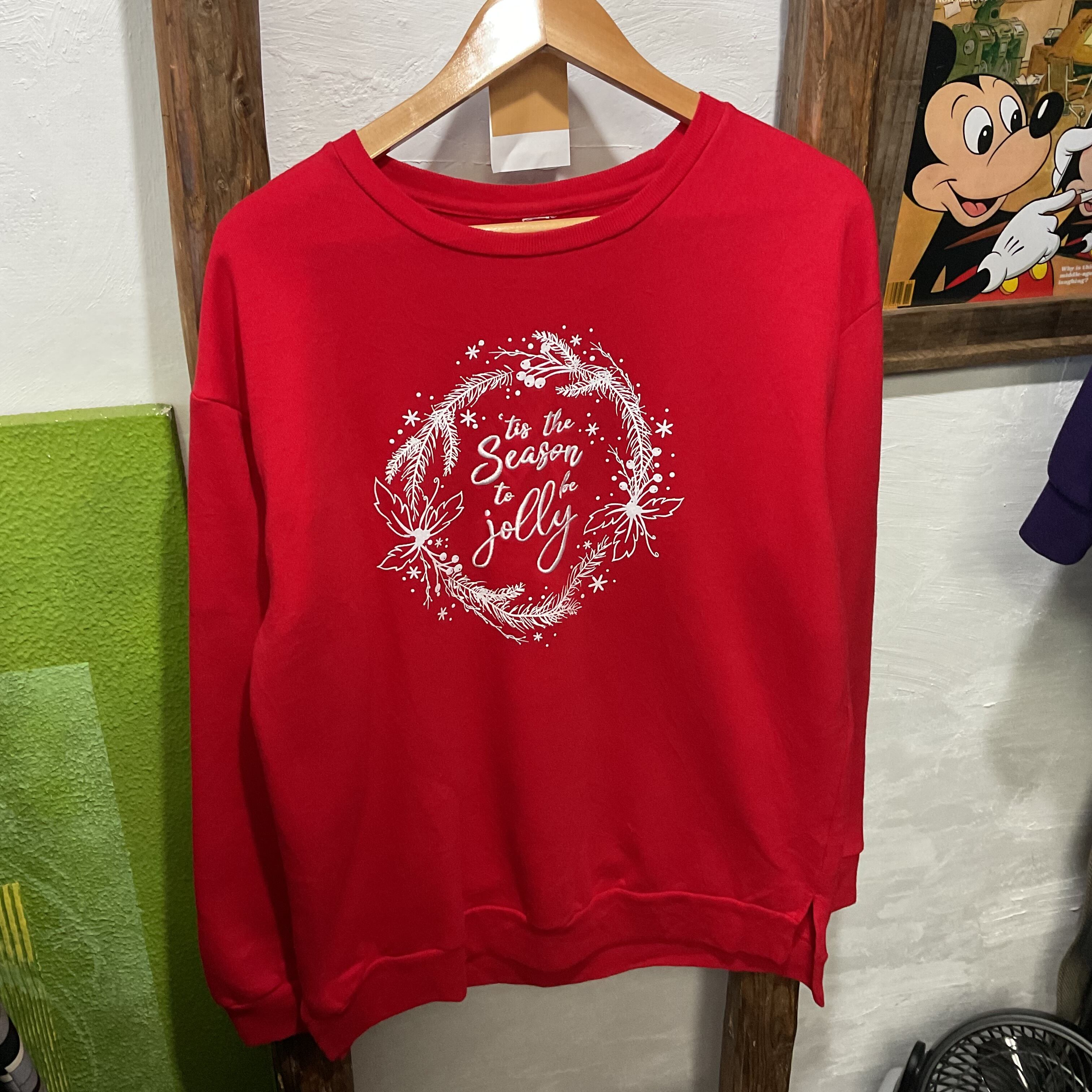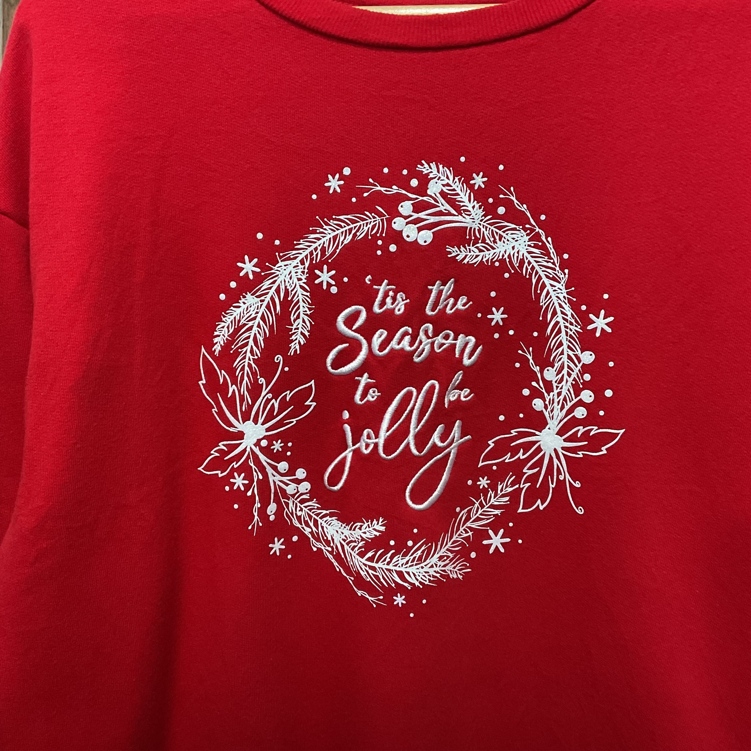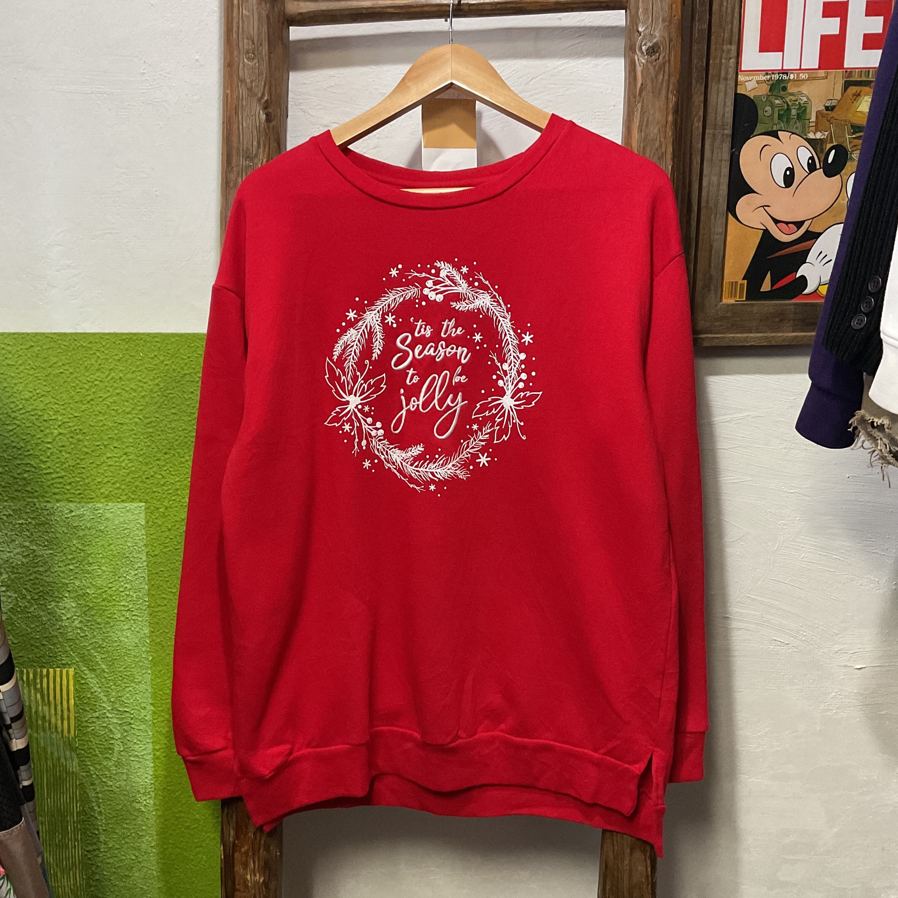 “’Tis the Season to Be Jolly”(=陽気な季節がやってきた)というホリデーシーズン定番フレーズを、リース状のボタニカルモチーフで囲んだクリスマススウェット。