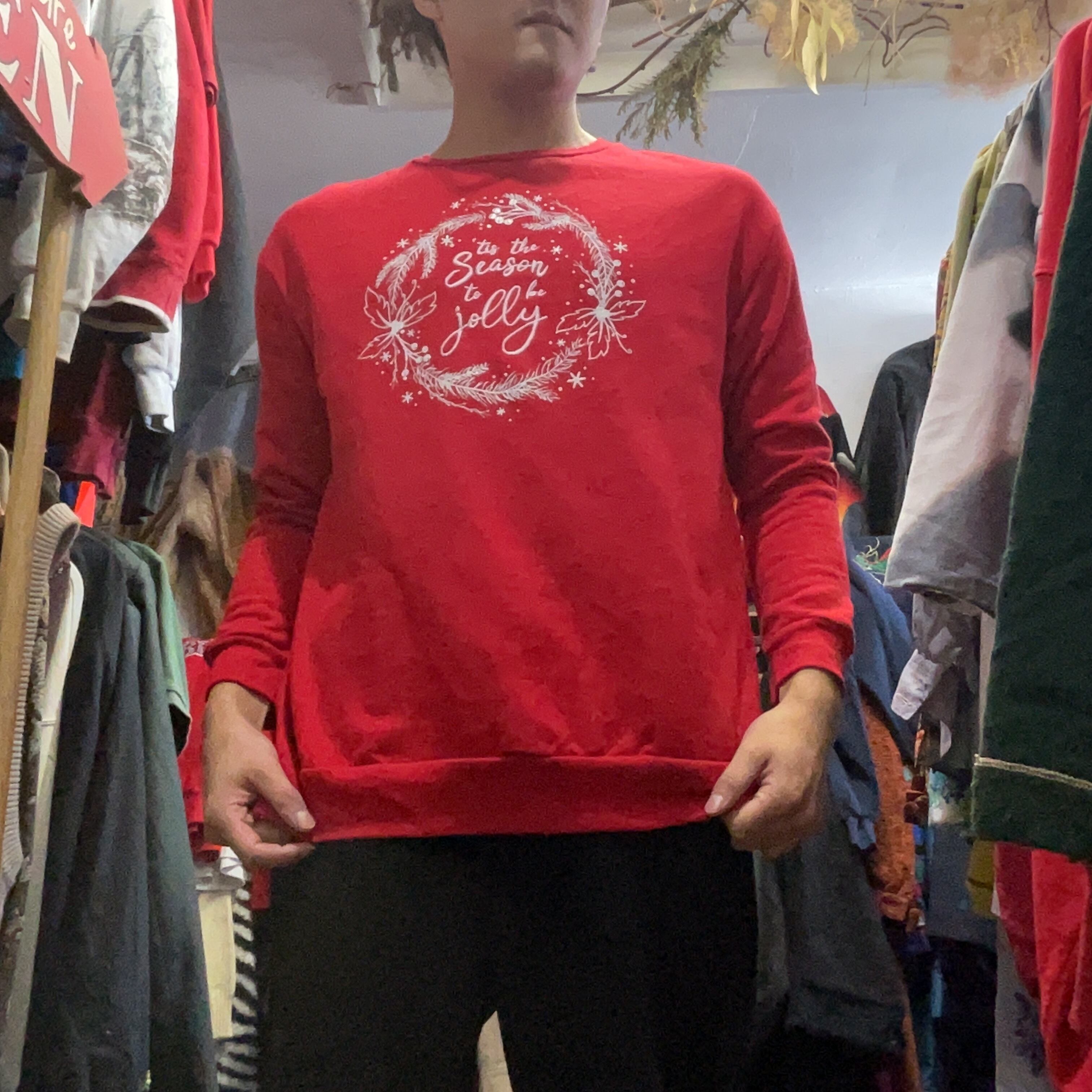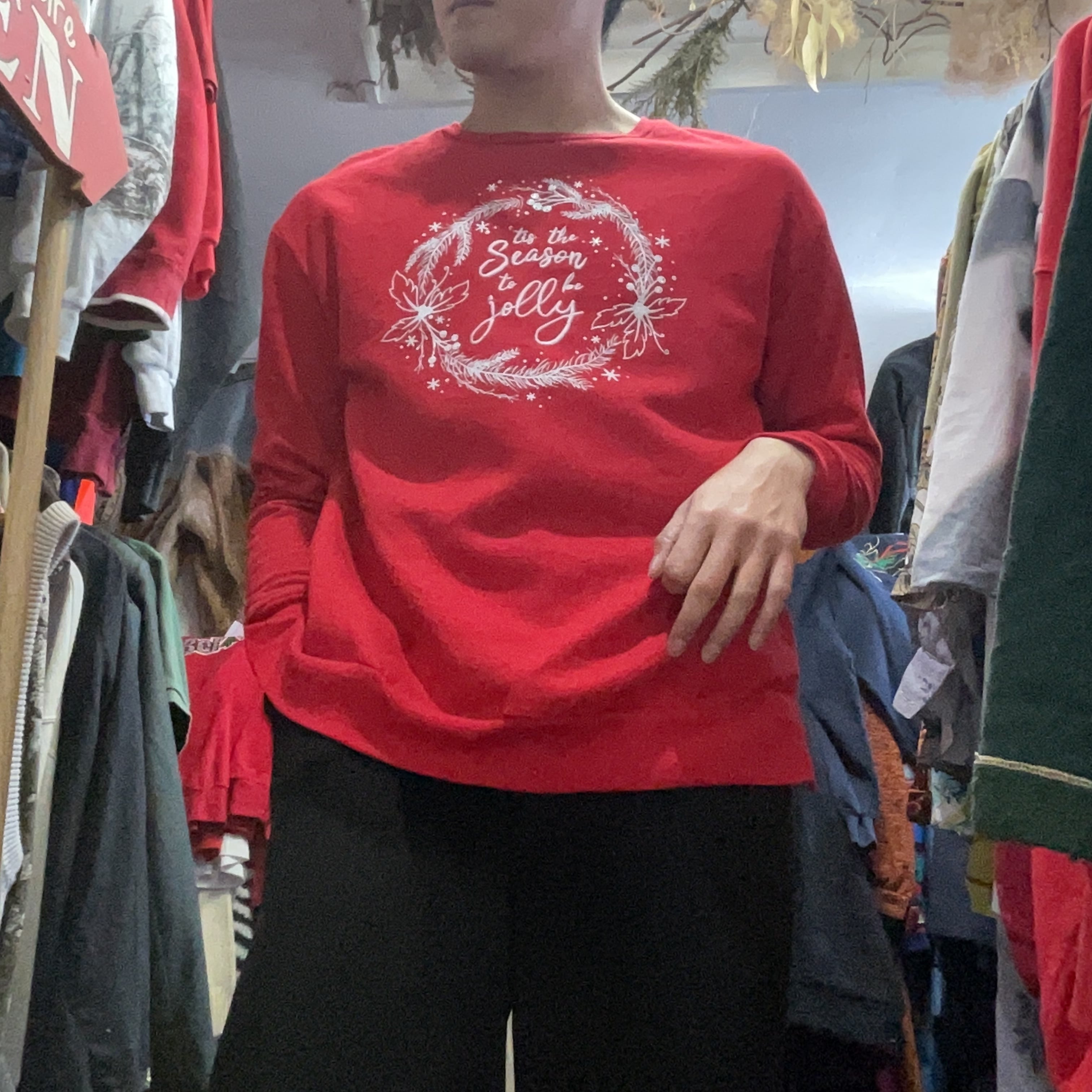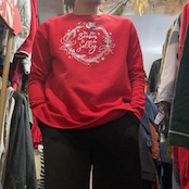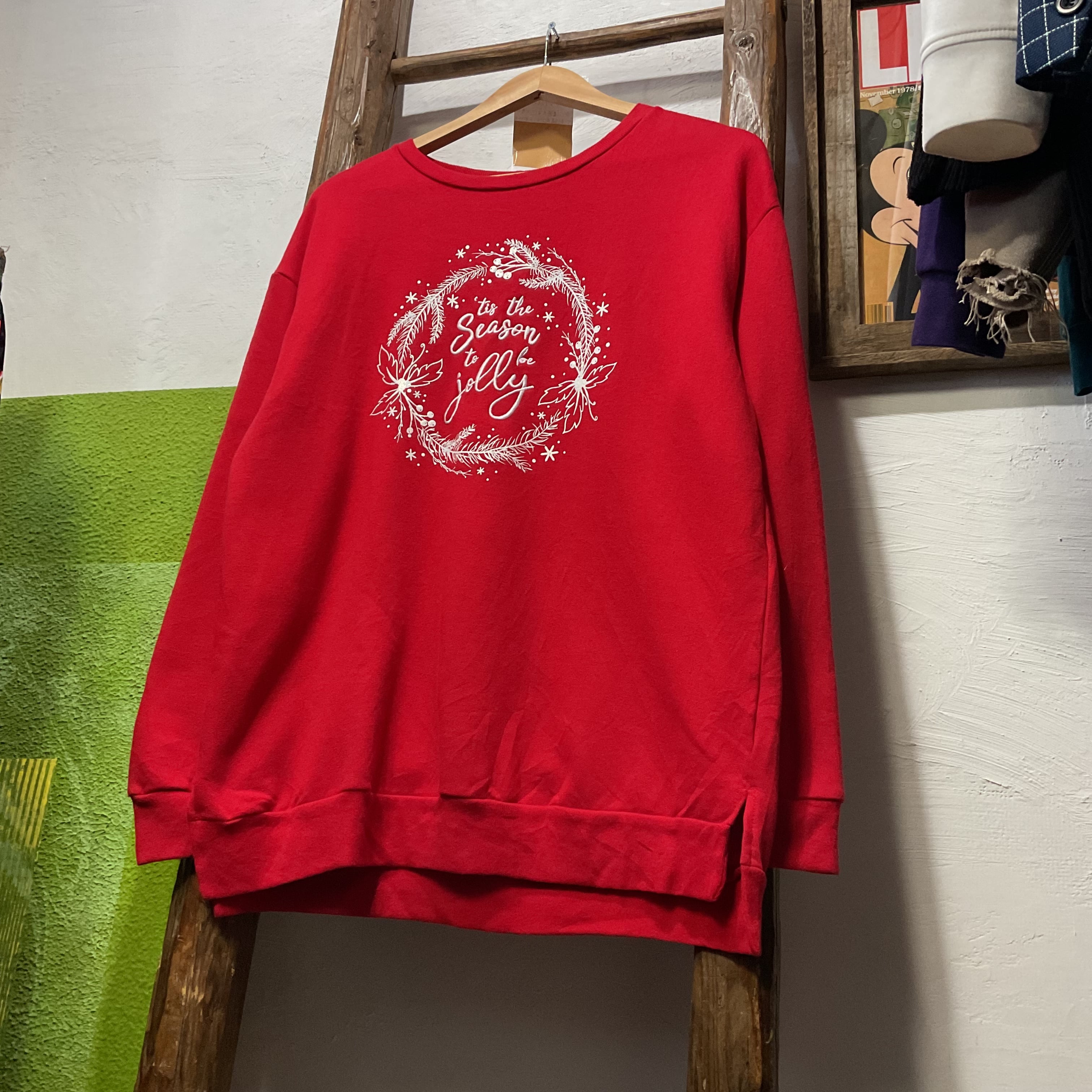 “’Tis the Season to Be Jolly”(=陽気な季節がやってきた)というホリデーシーズン定番フレーズを、リース状のボタニカルモチーフで囲んだクリスマススウェット。