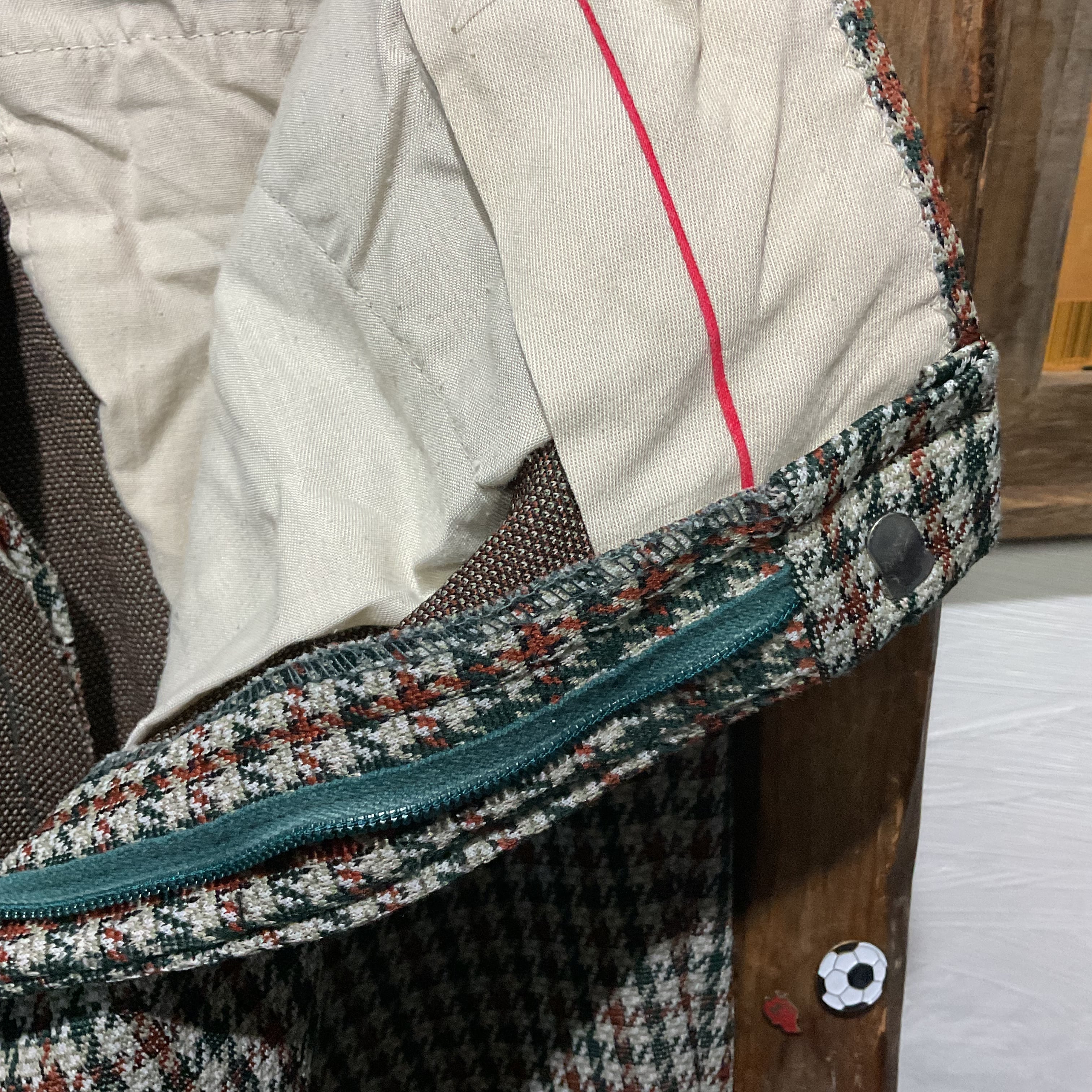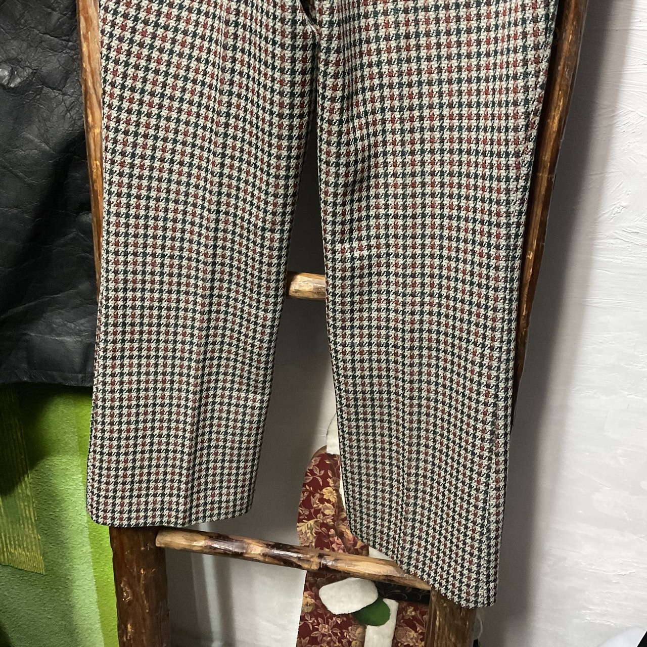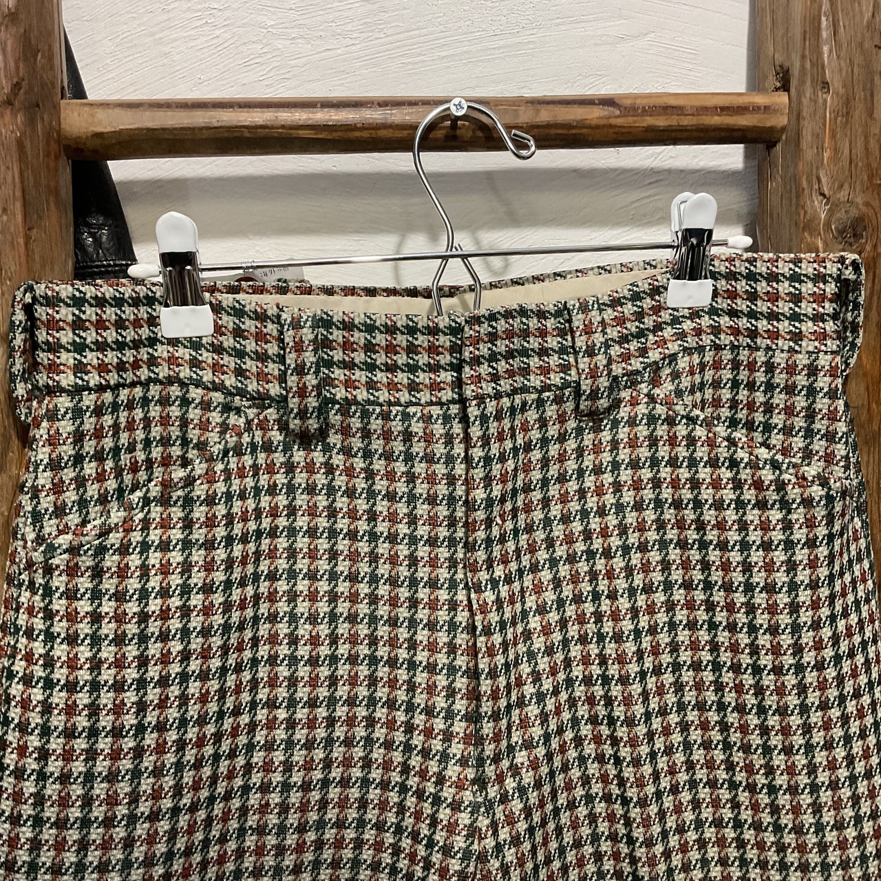 クラシックな千鳥格子柄が印象的なヴィンテージスラックス。グリーン・ブラウン・生成りをベースにした落ち着いた配色で、秋冬ムードたっぷり。