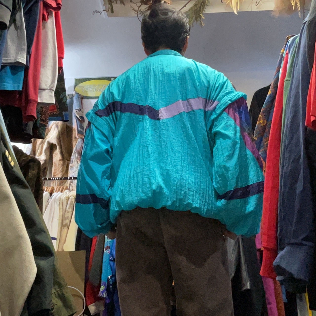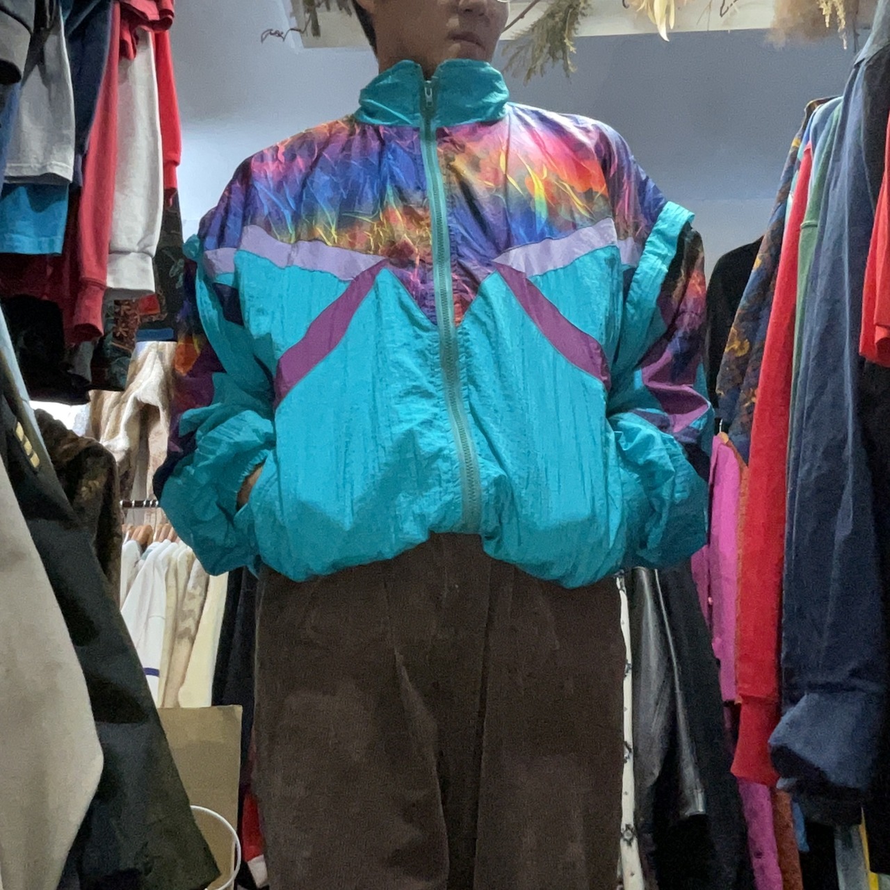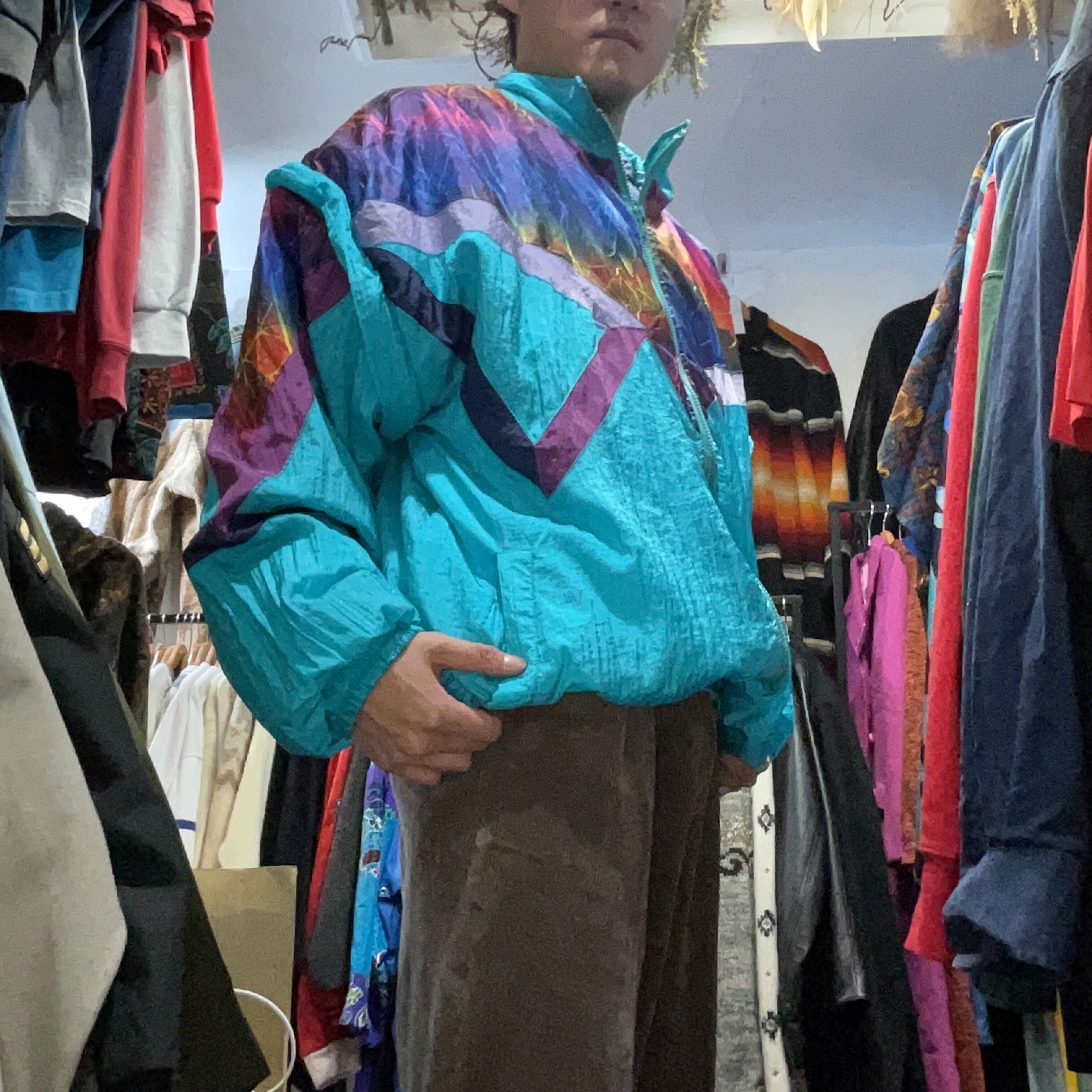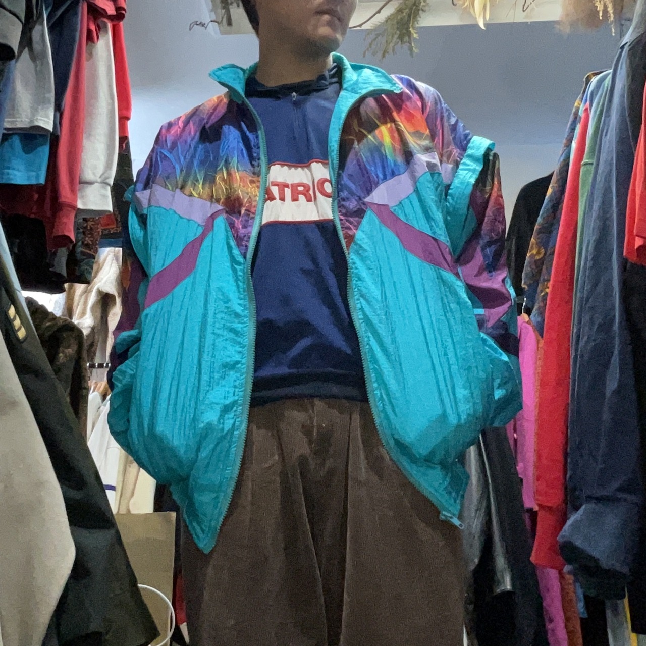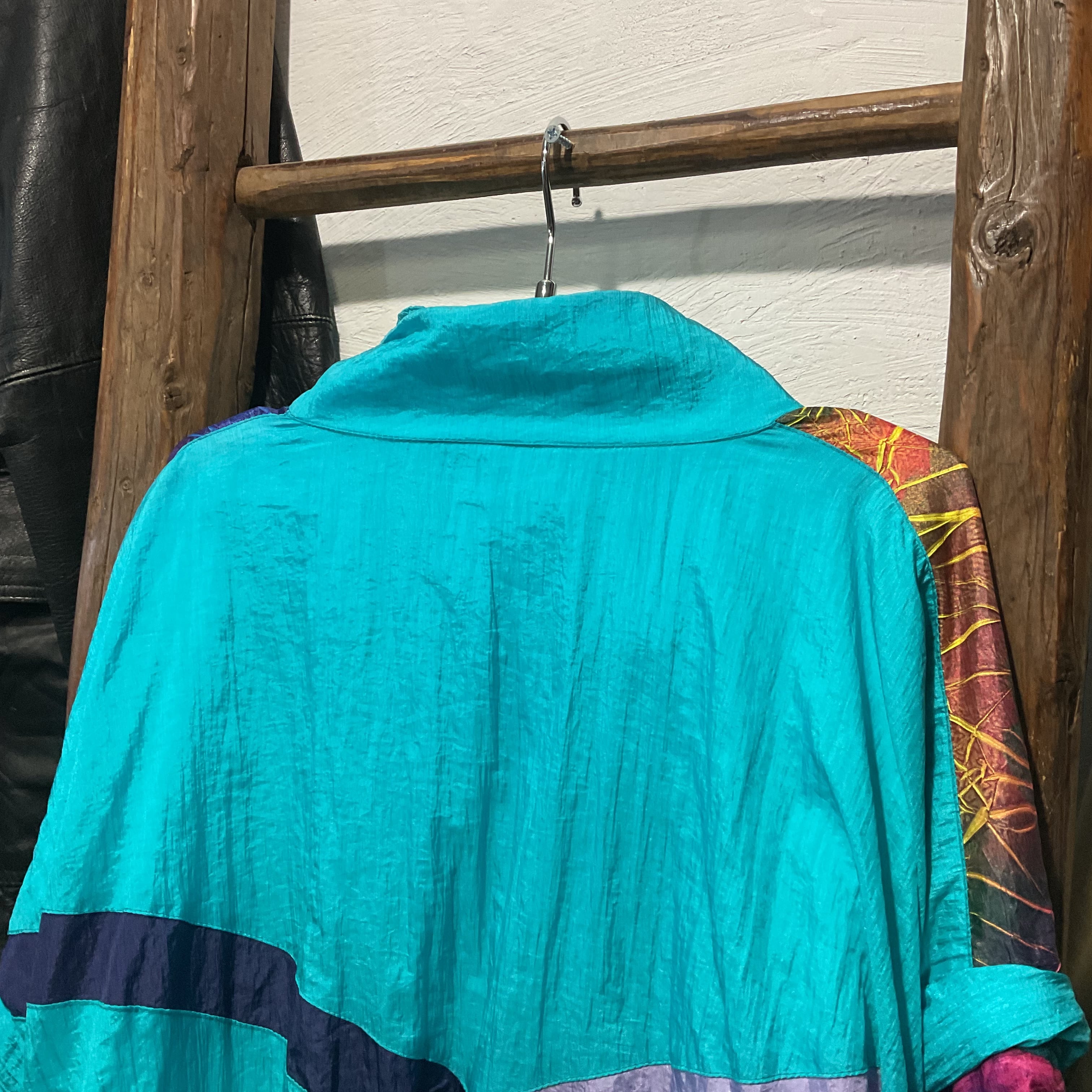 柄も切替も主役級で、1枚でコーデが完成するタイプ。素材は薄中肉のシャカ系に見えるので、春秋の羽織りはもちろん、冬はインナーにフーディ/フリースを入れても映える。