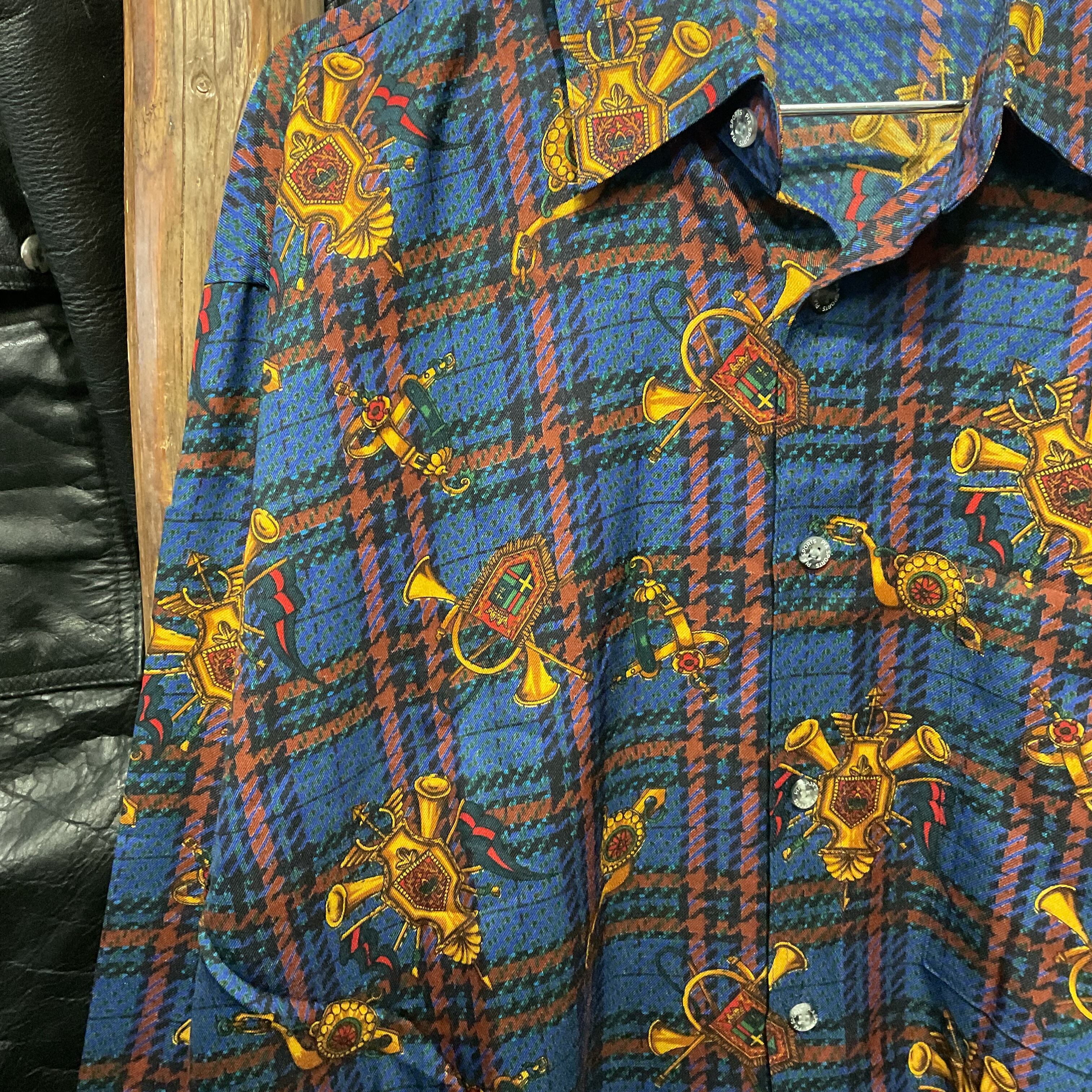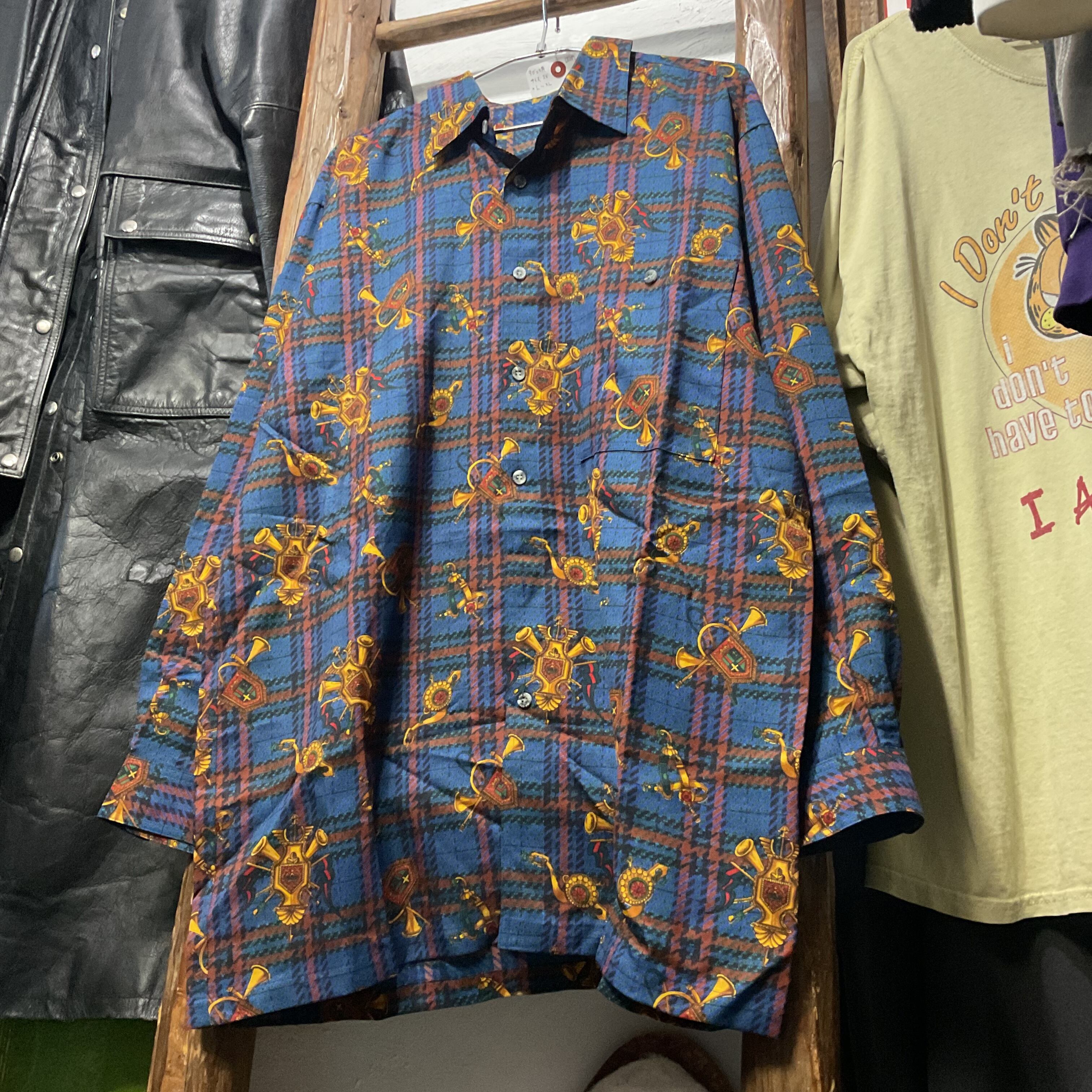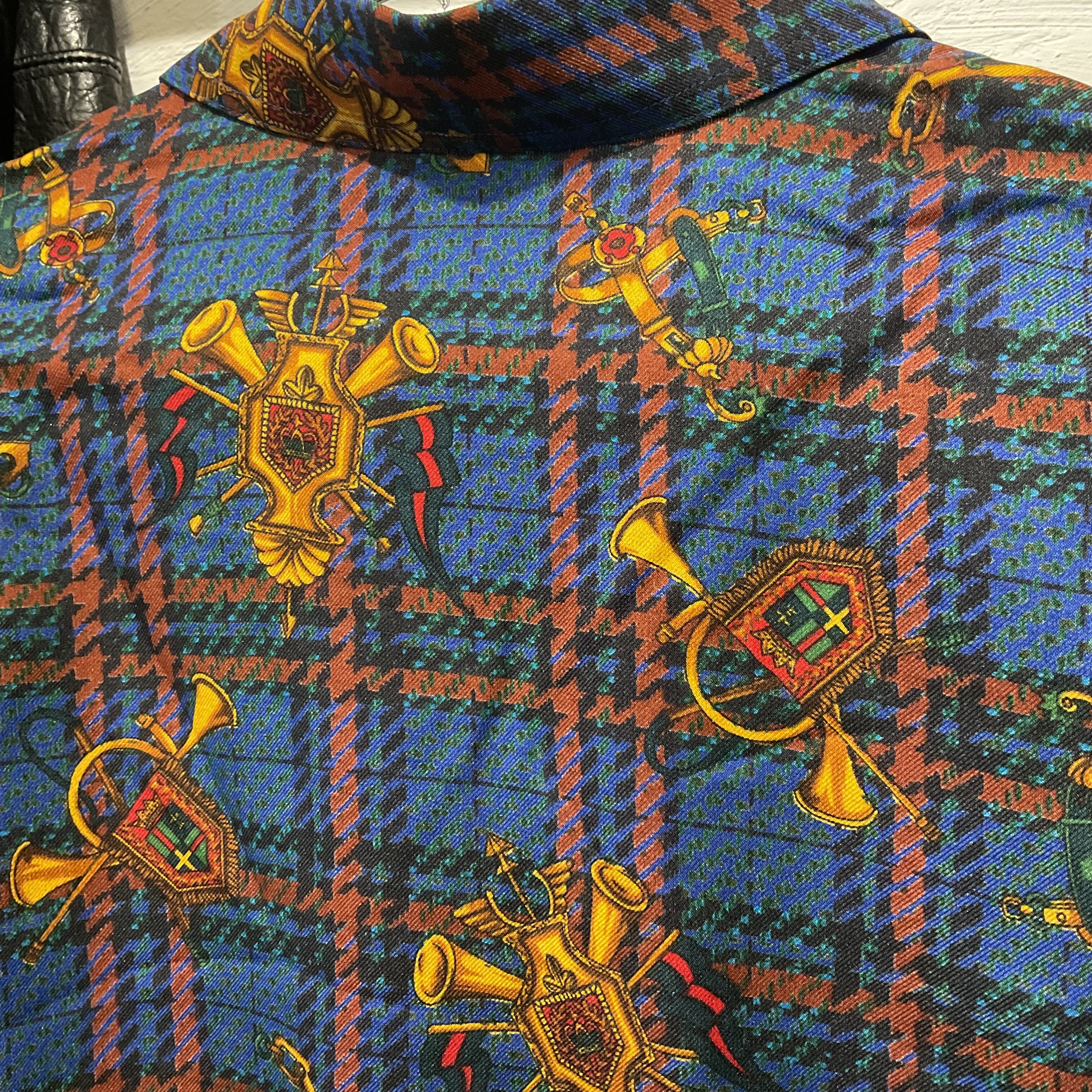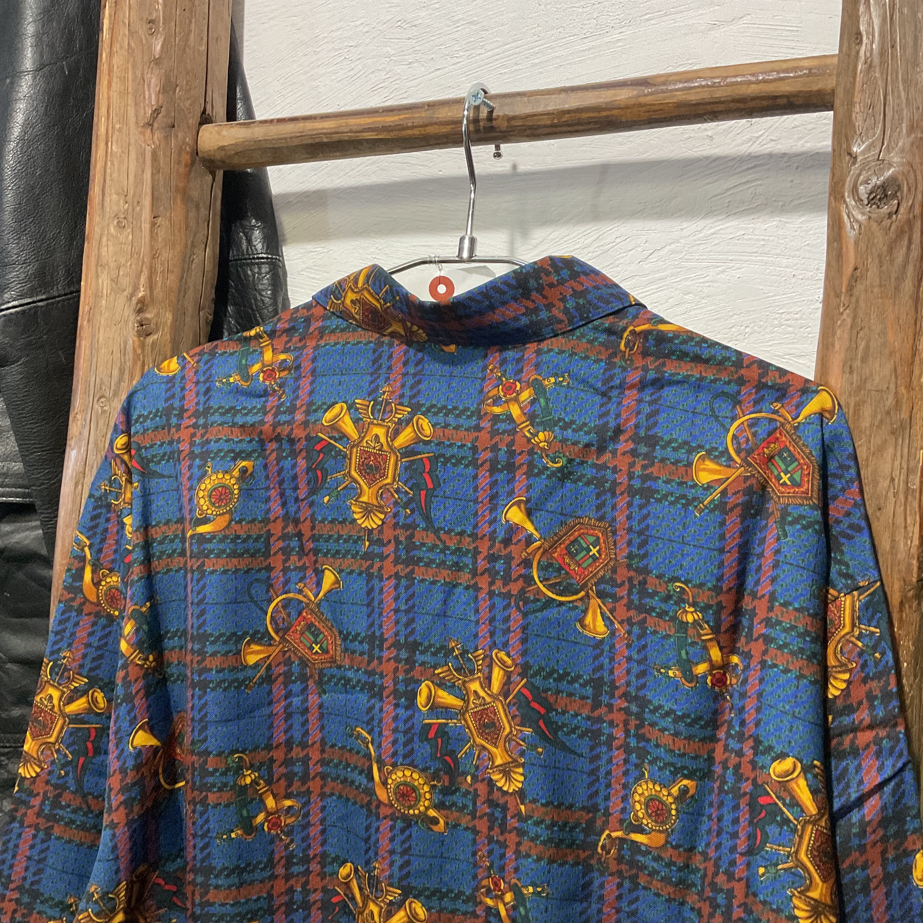 ブルーを基調としたタータンチェックに、ホルンや紋章モチーフを散りばめた存在感抜群の総柄シャツ。