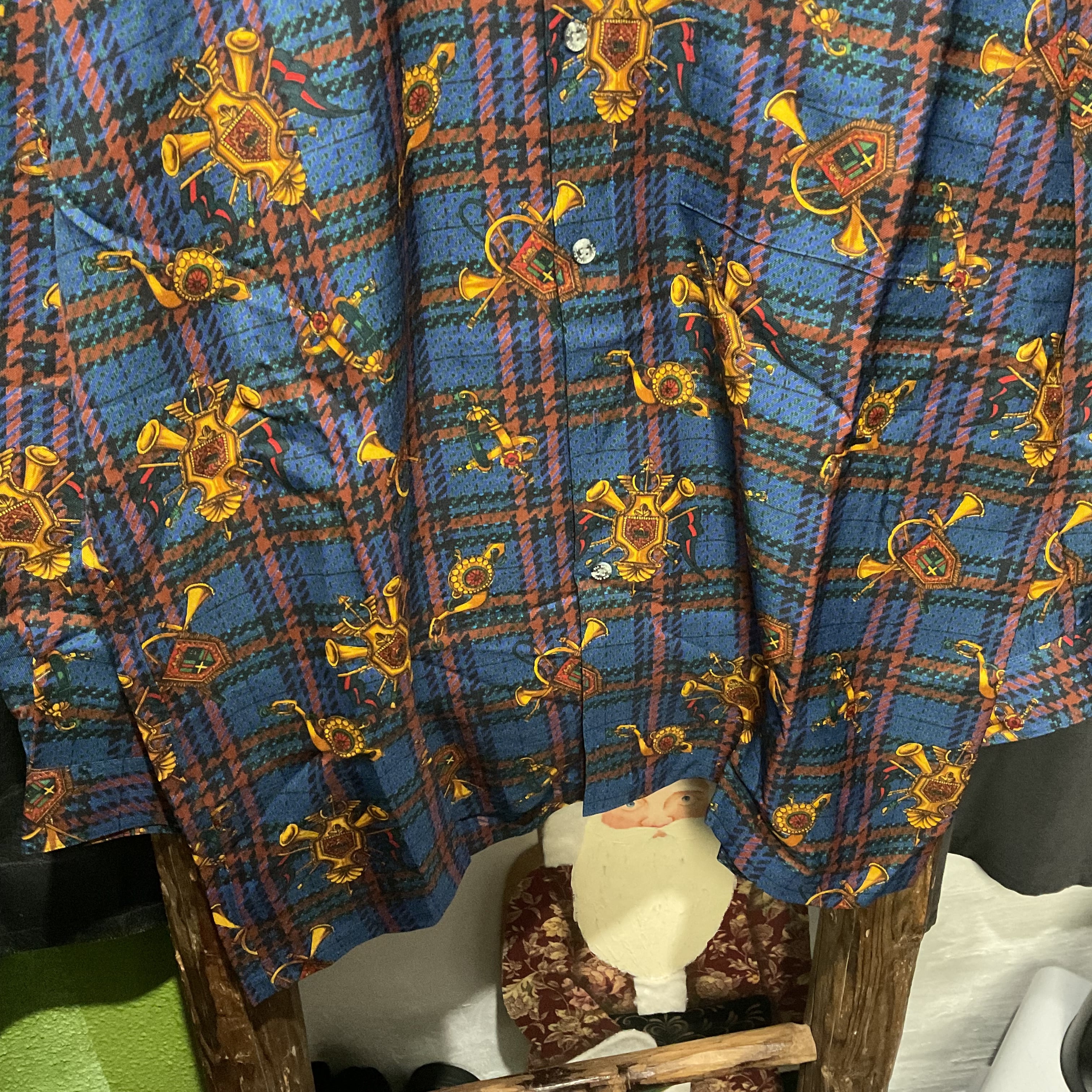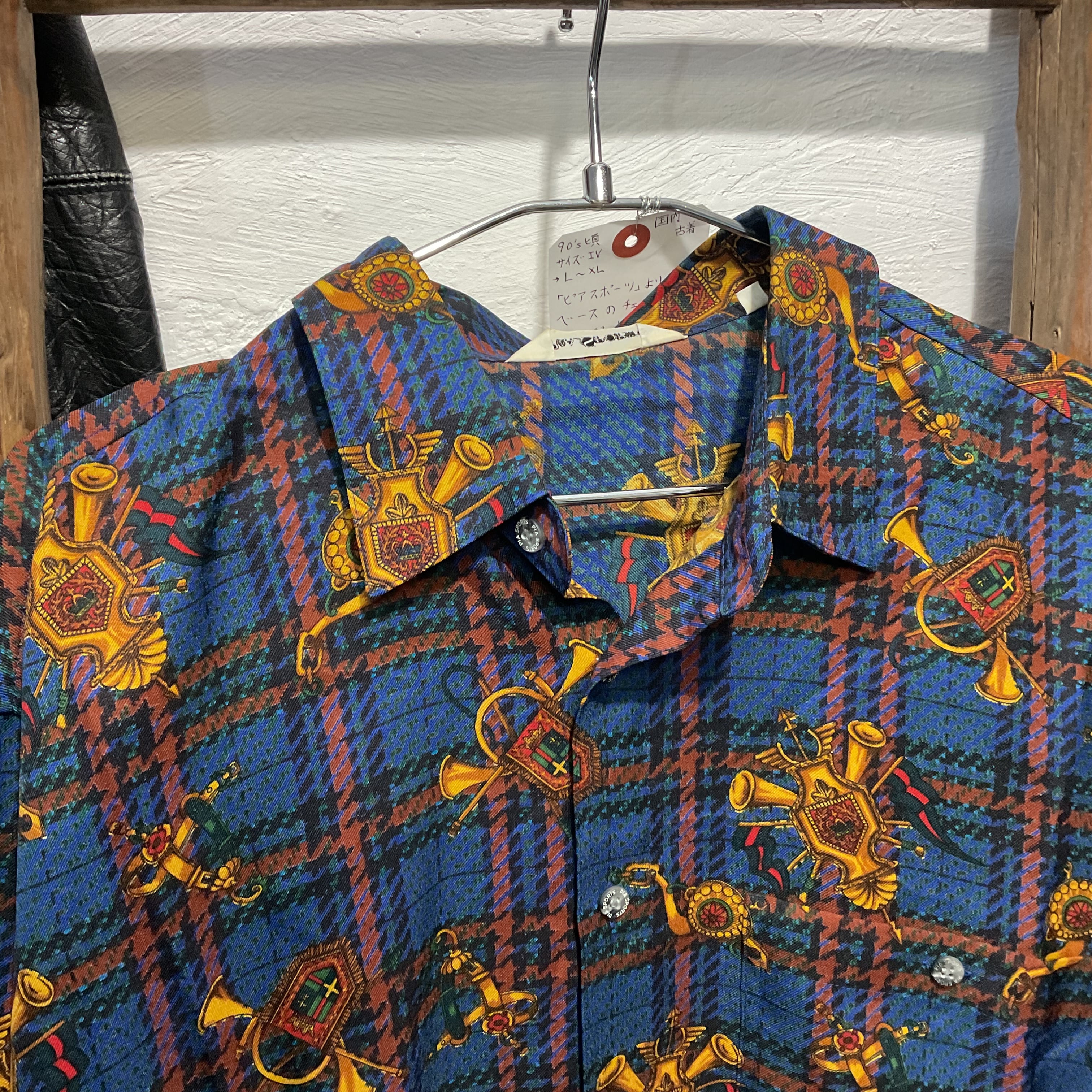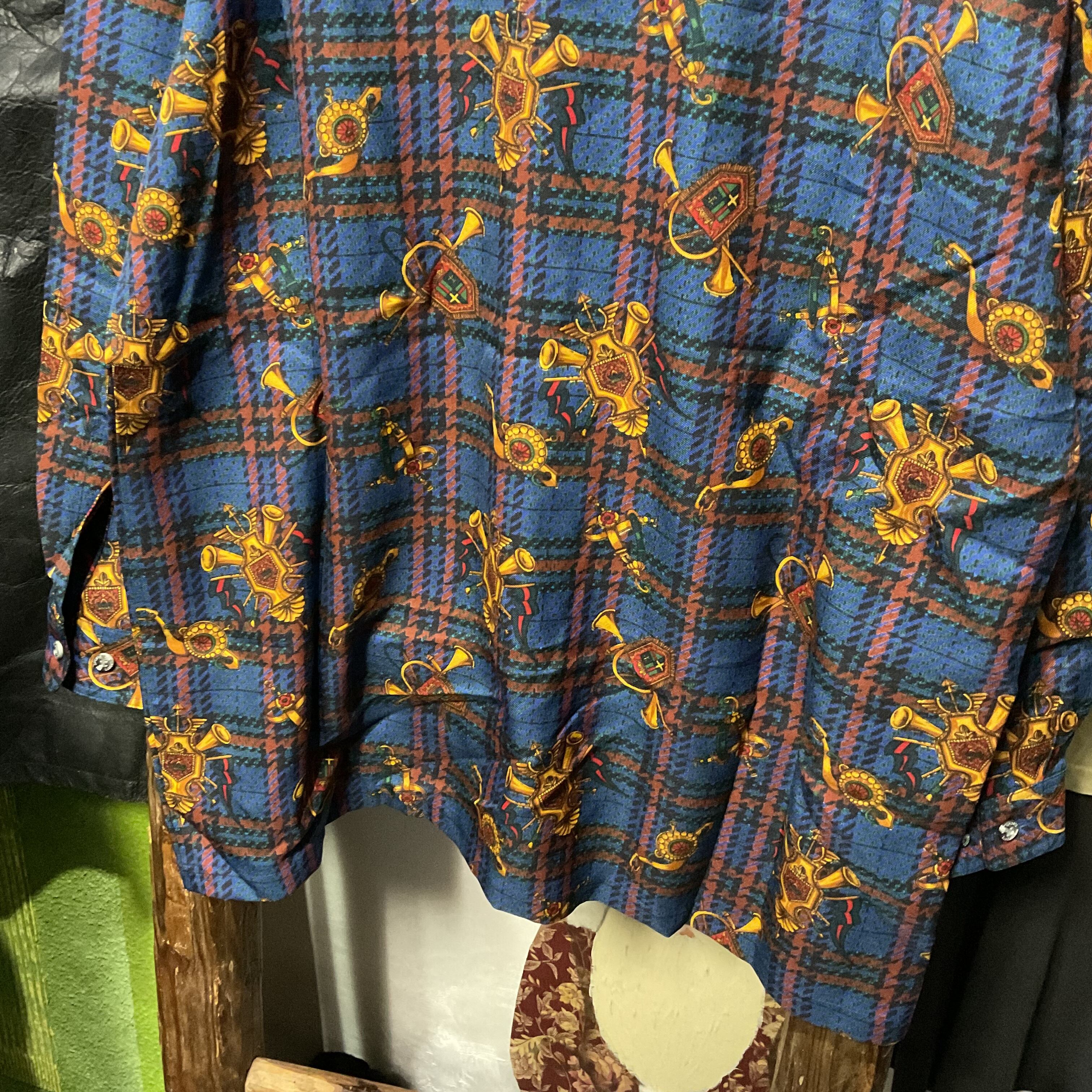 ブルーを基調としたタータンチェックに、ホルンや紋章モチーフを散りばめた存在感抜群の総柄シャツ。