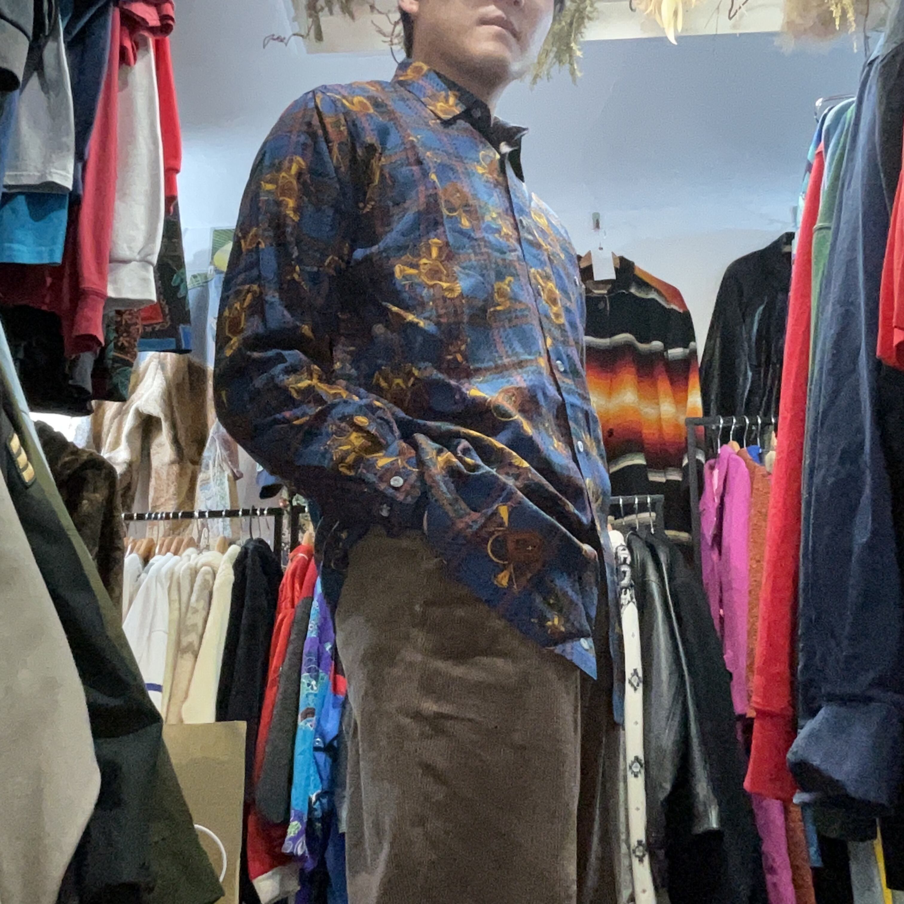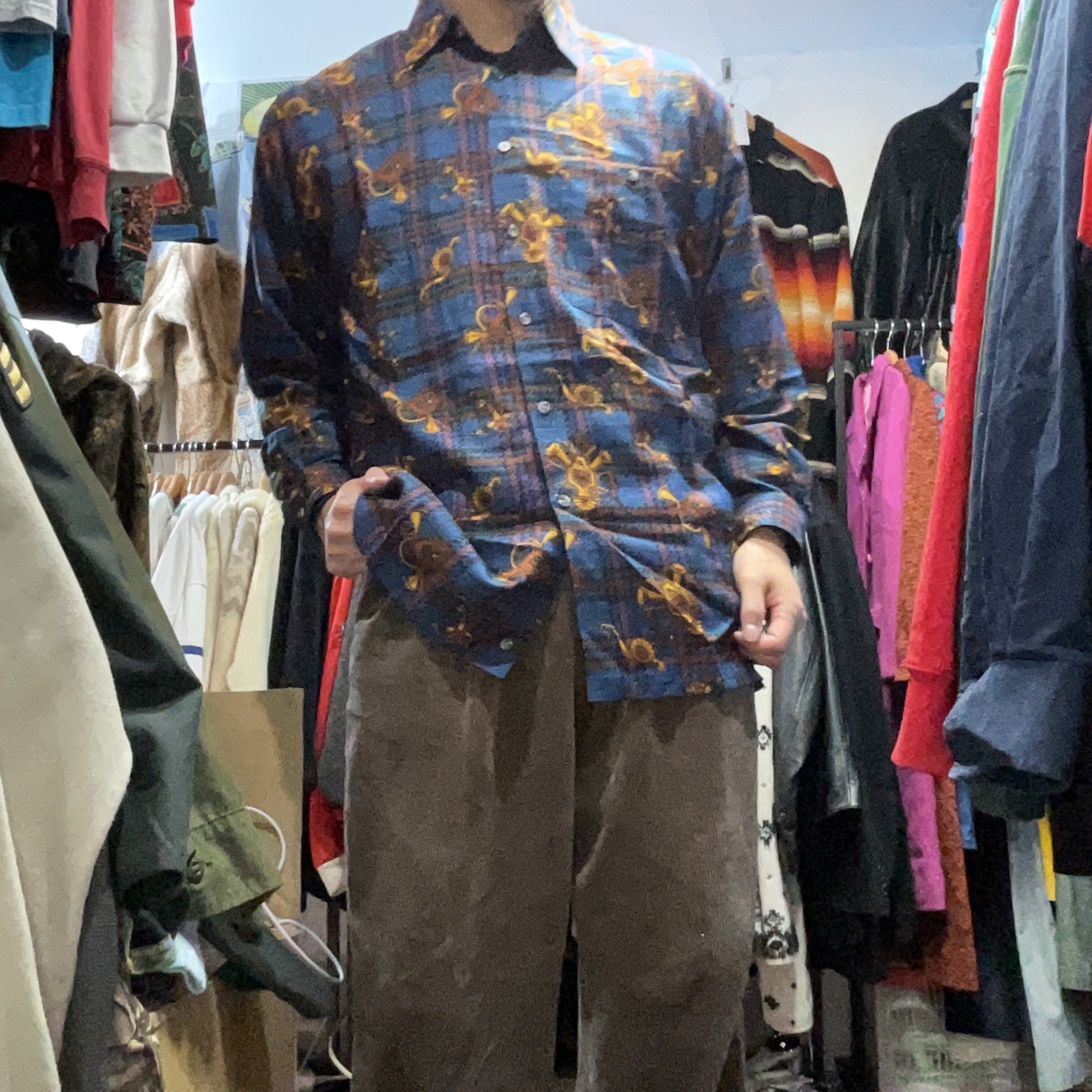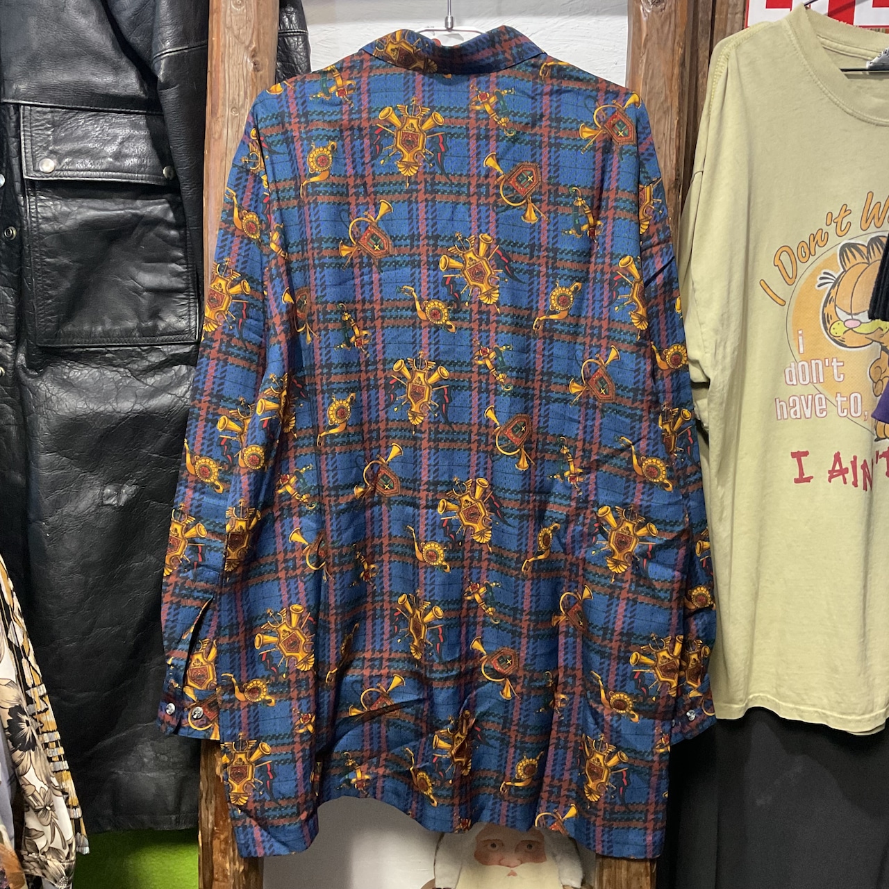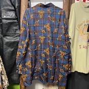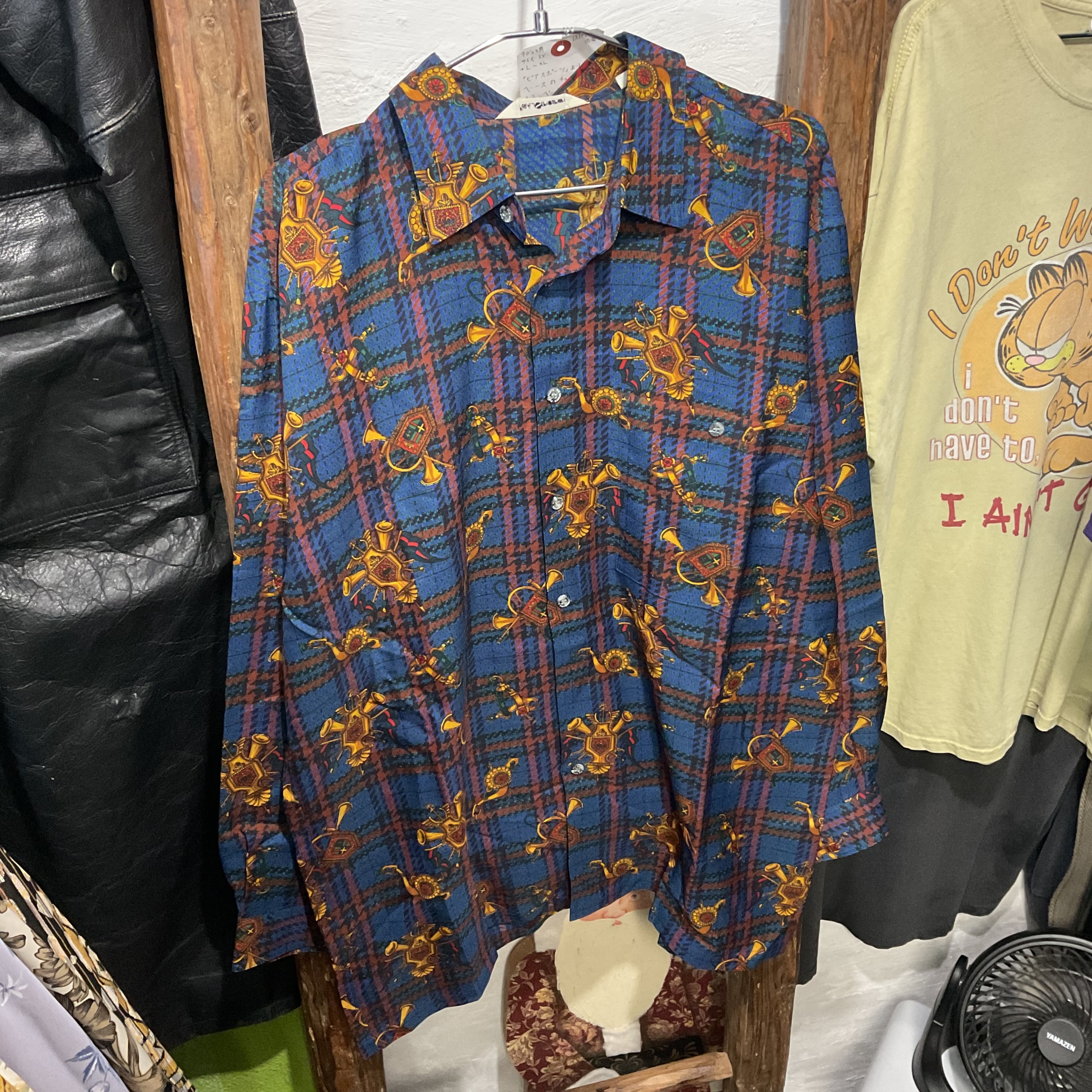ブルーを基調としたタータンチェックに、ホルンや紋章モチーフを散りばめた存在感抜群の総柄シャツ。