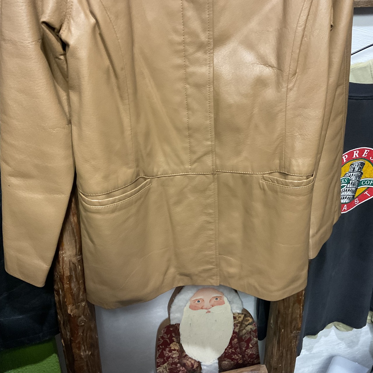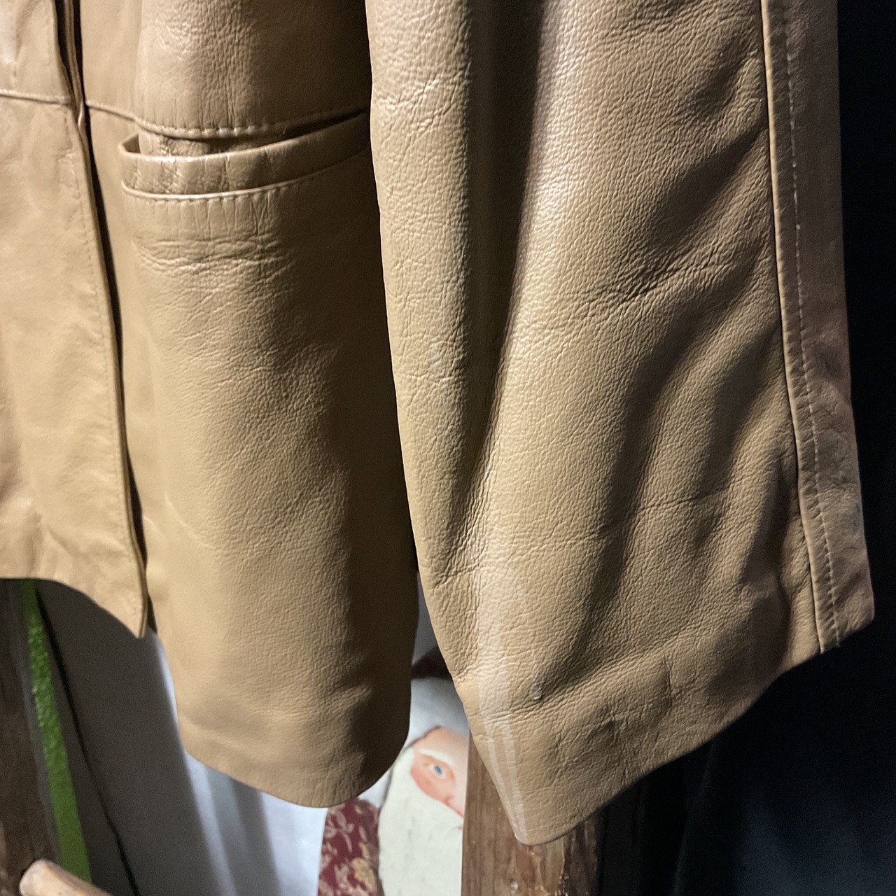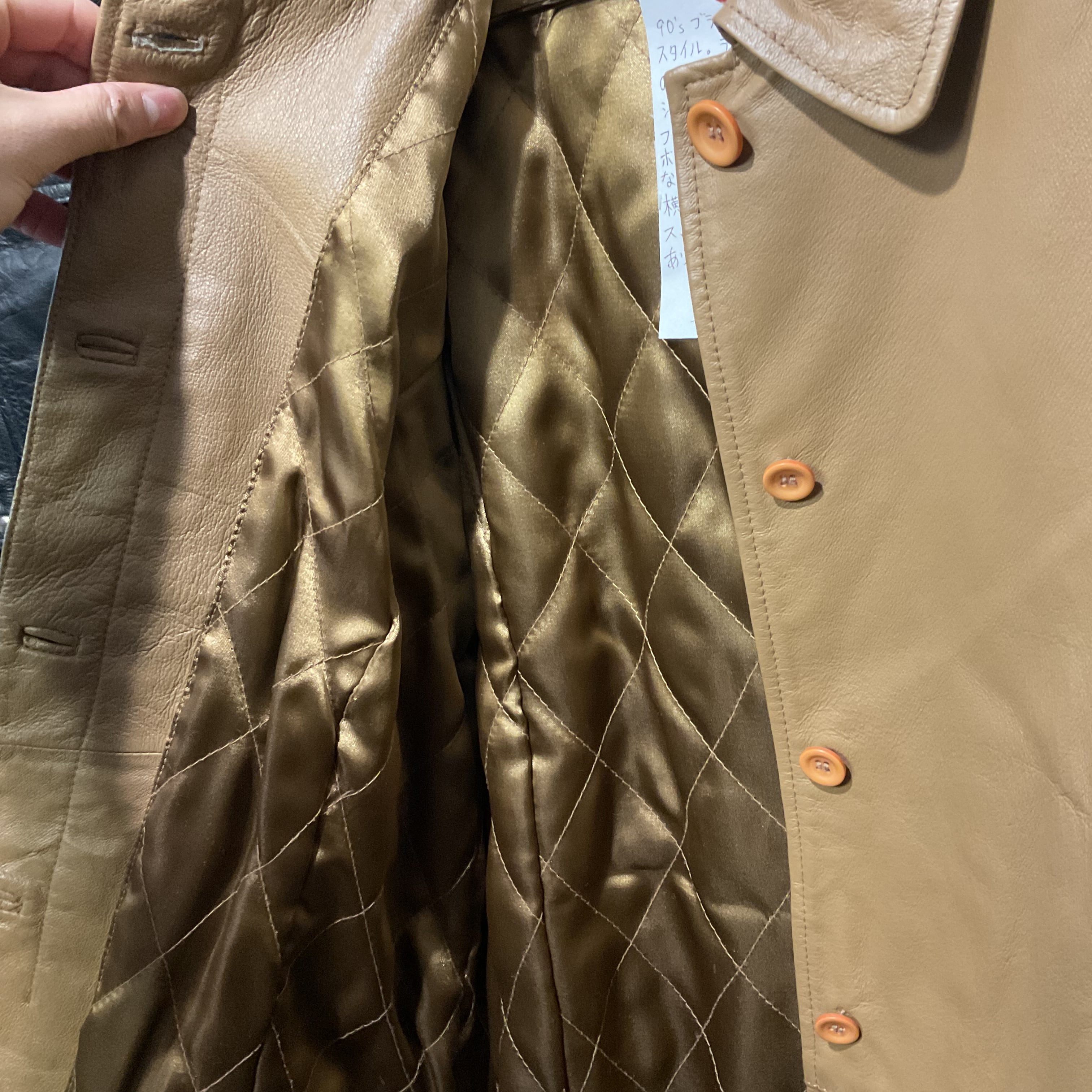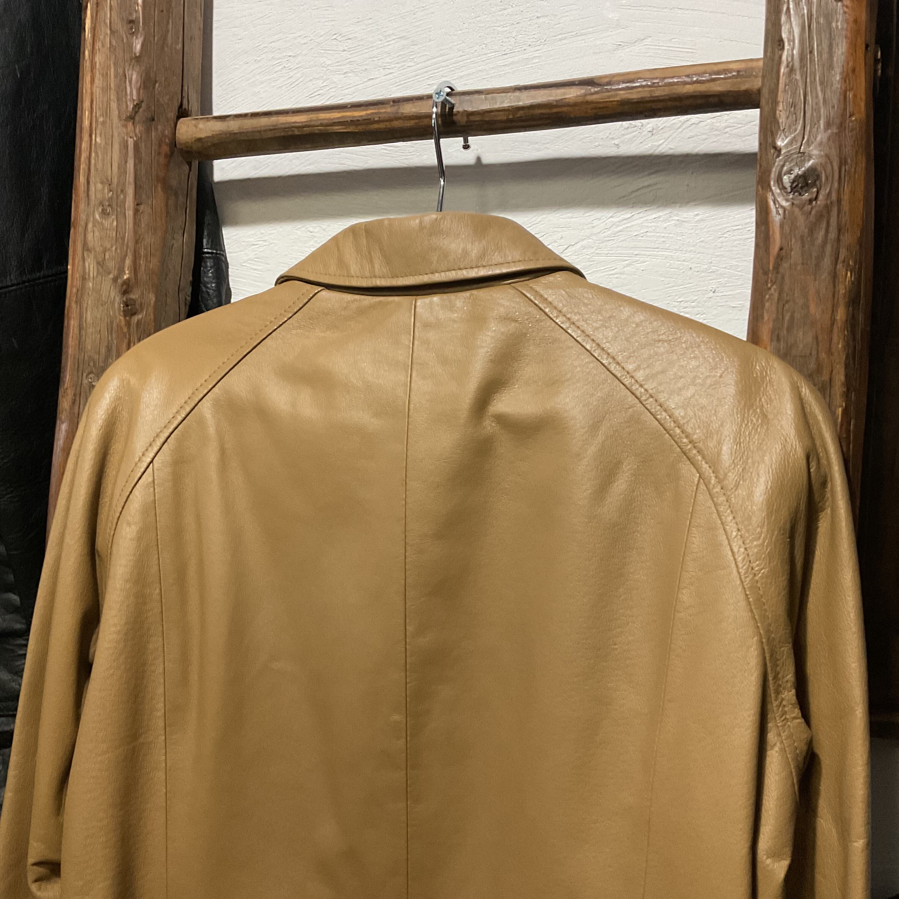 しっとりとした質感の豚革を使用した、90年代らしいミニマルデザインのレザーコート。無駄な装飾を省いた比翼仕立てとステンカラーが特徴で、レザーアイテムでありながら上品で落ち着いた印象に。程よく身体に沿うシルエットと、着丈88cmのハーフ丈バランスは、パンツ・スカートどちらとも相性が良く、日常のスタイリングに取り入れやすい1着。裏地付きのため袖通しも滑らかで、秋冬から春先までロングシーズン活躍。レザー特有のシワや表情は見られますが、それも含めてヴィンテージらしい風合いとして楽しめる個体。シンプルだからこそ素材の良さが際立つ、90sレザーコート。