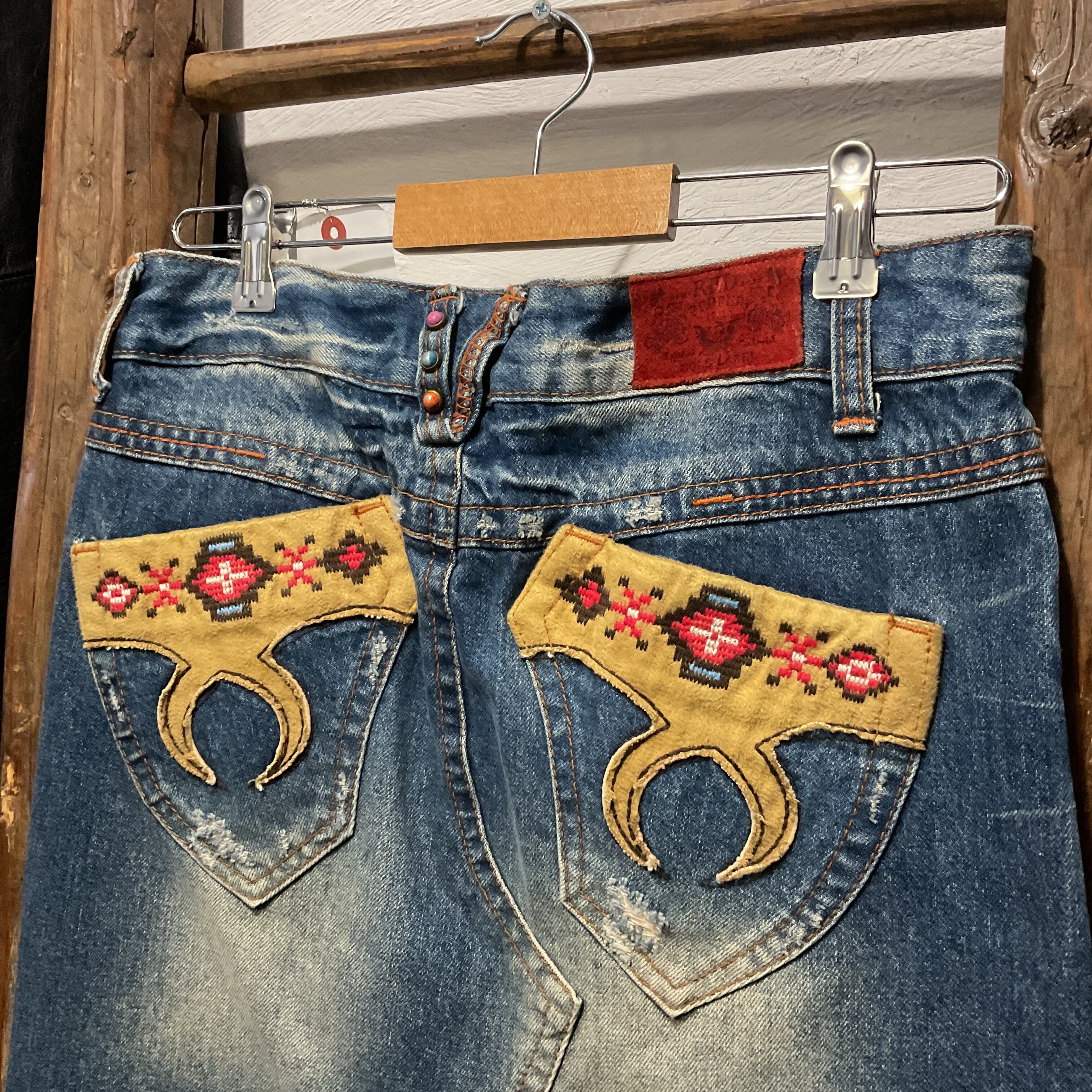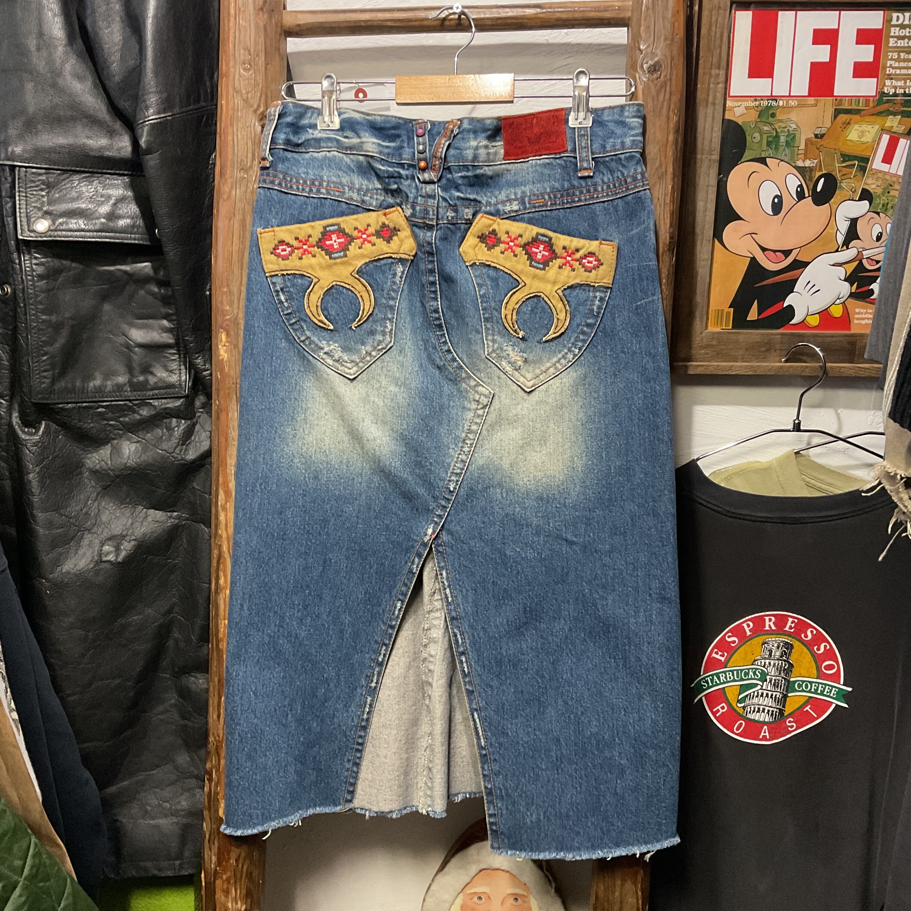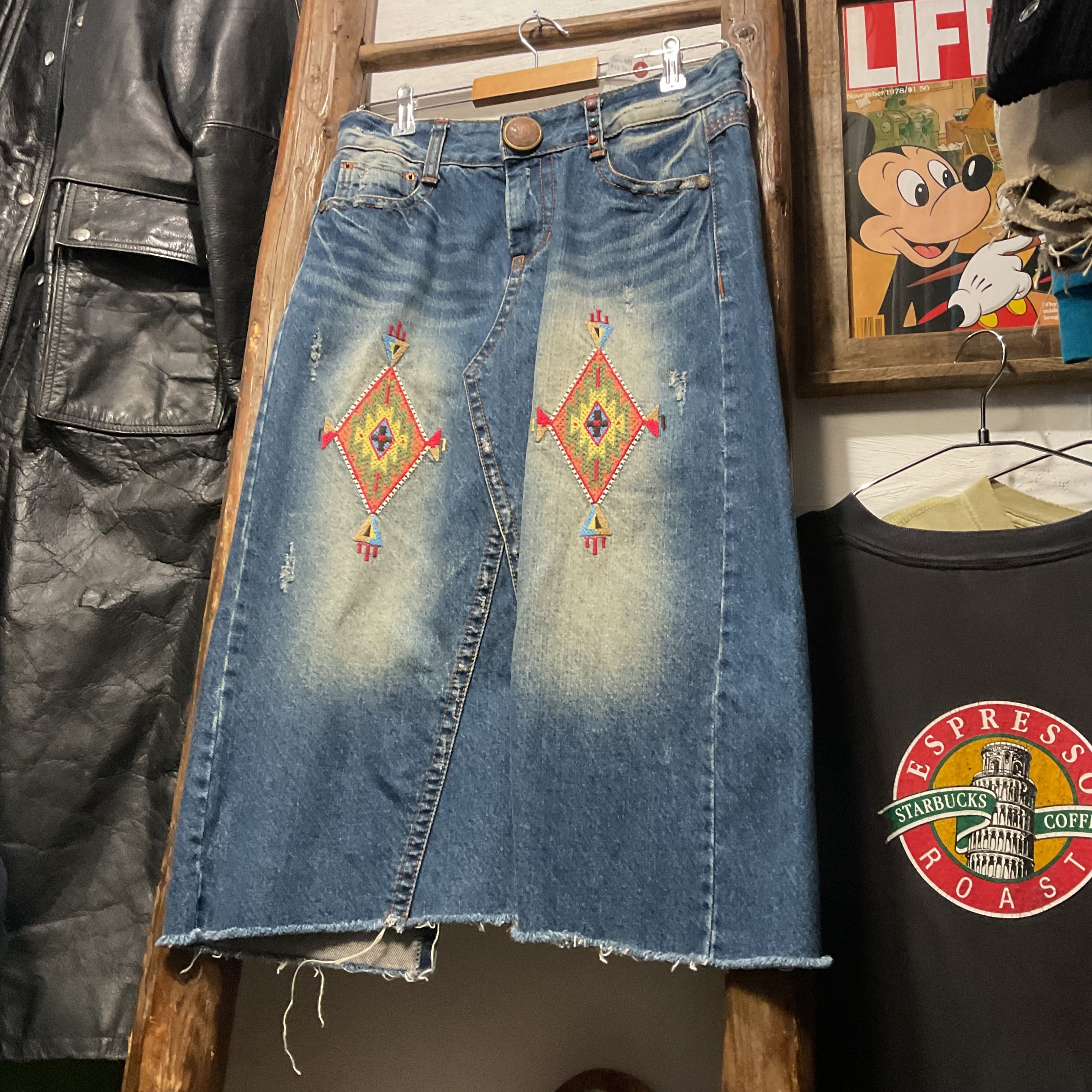 RED PEPPERらしい装飾感が映える、デニムスカート。フロントは重なりのあるラップ風デザインで、動きのあるシルエットが特徴。両脚側に入ったネイティブ調の刺繍パッチが主役級で、シンプルなトップスを合わせるだけでスタイリングが完成。トップボタンのロゴ入りメタルボタンや、カラースタッズなど細部まで作り込みがあり、Y2K〜平成っぽいムードにもハマる。裾はフリンジ仕様でラフに履ける1本(スカート)。