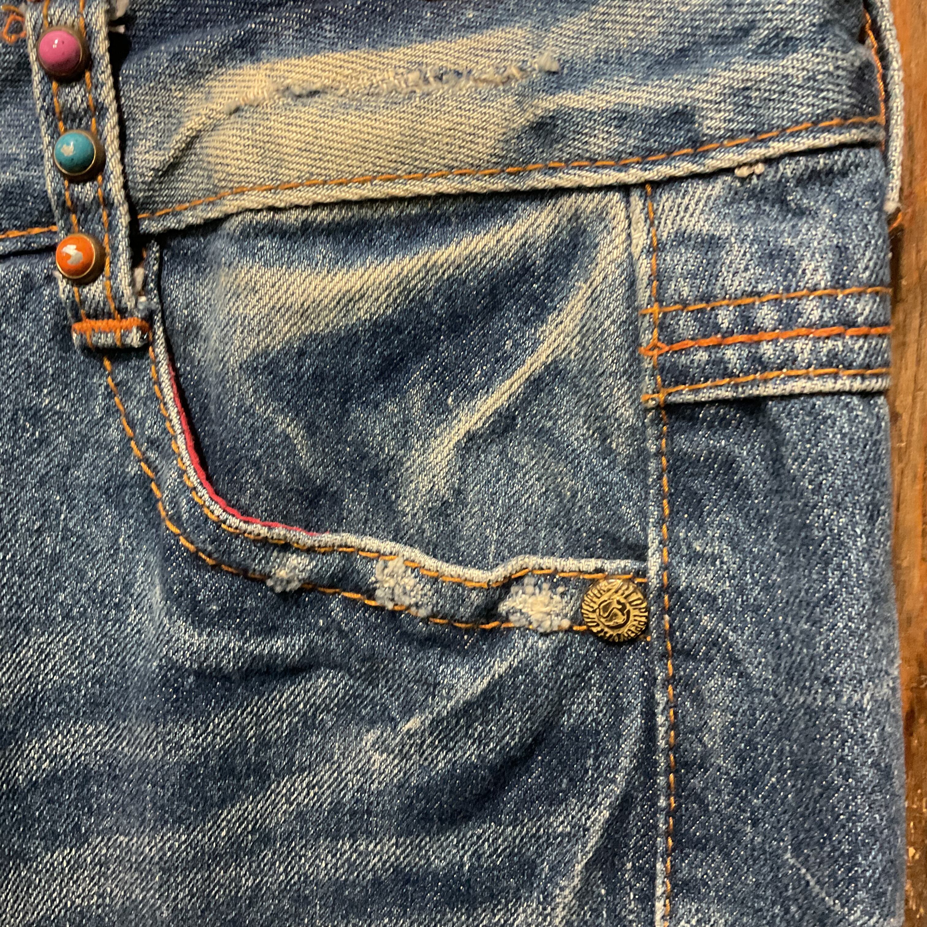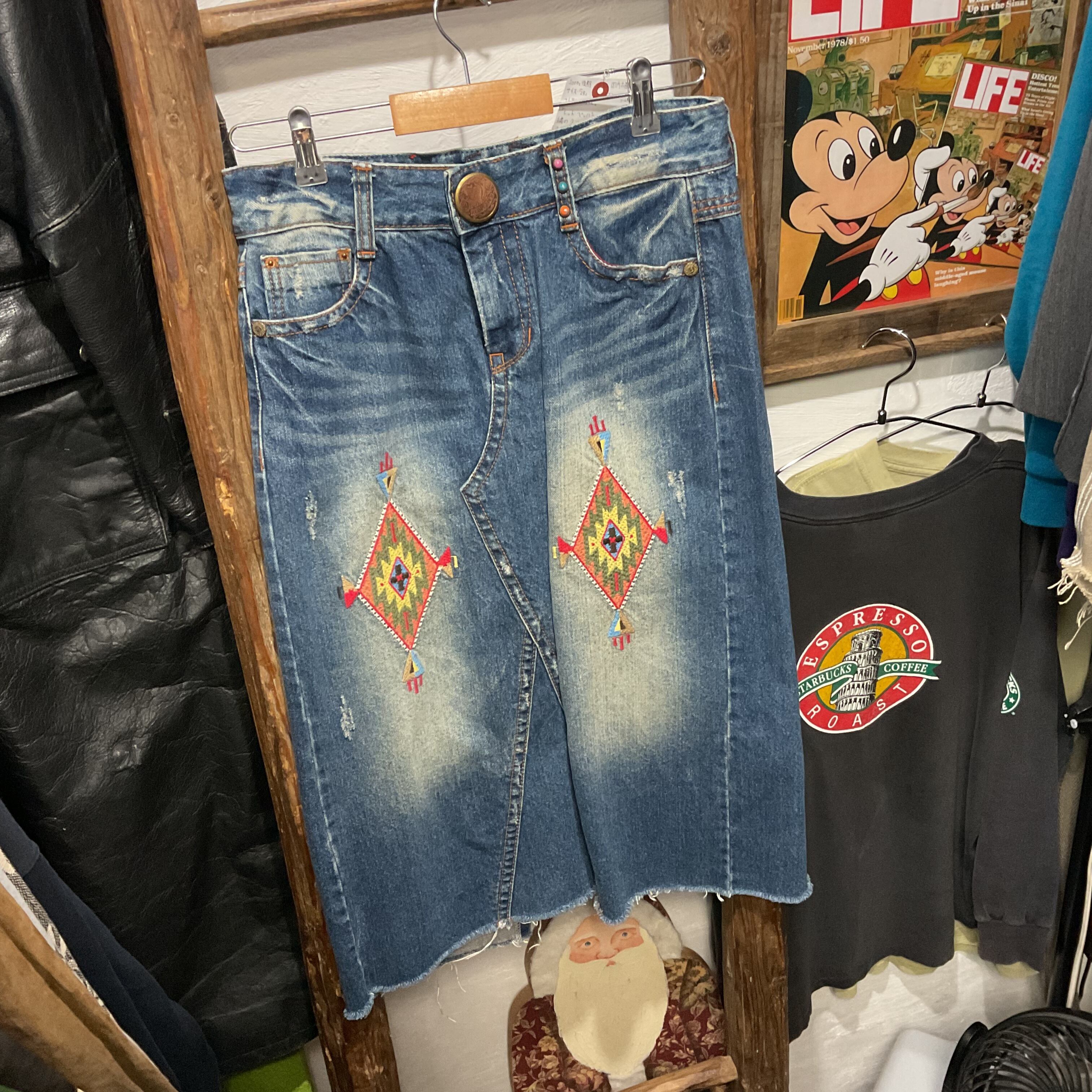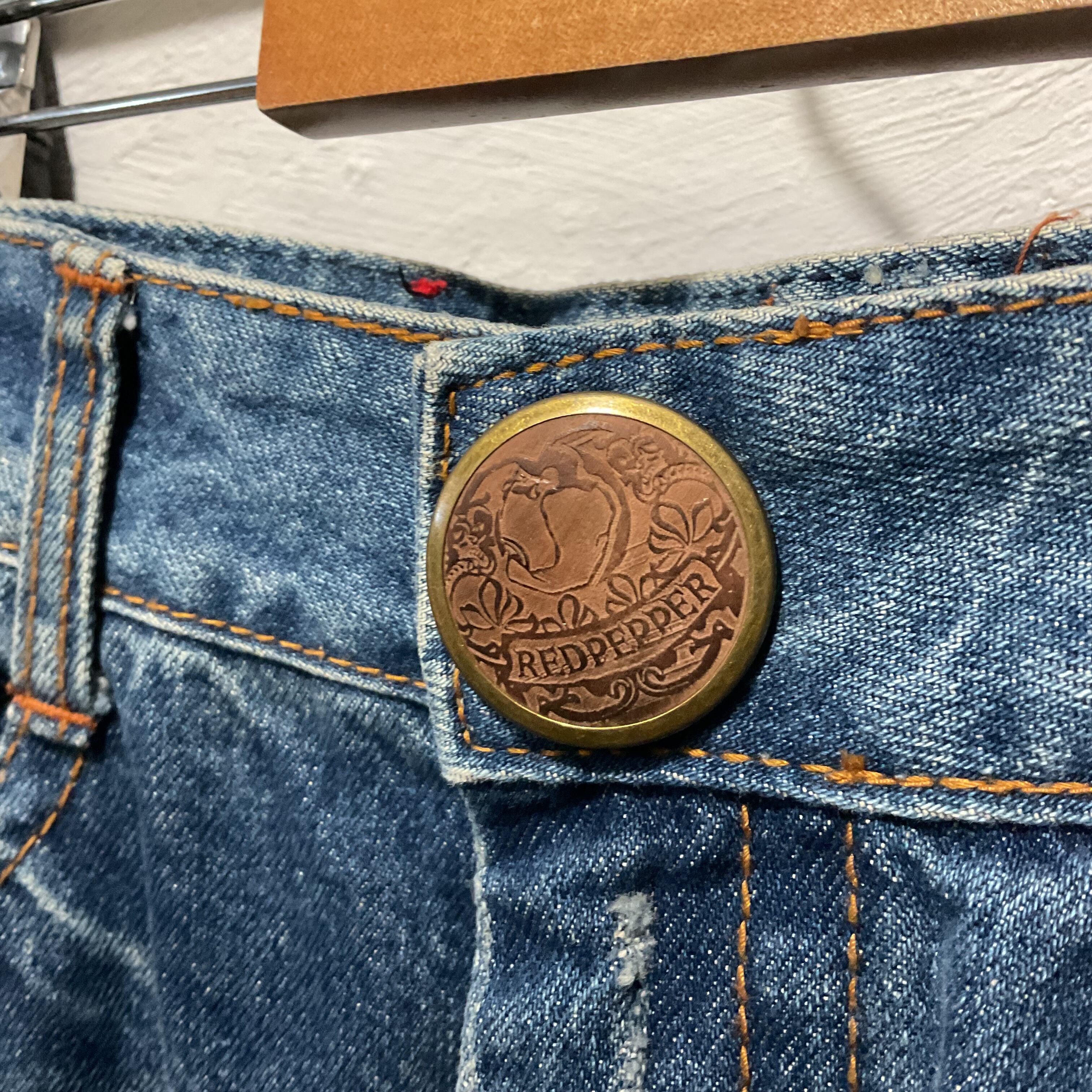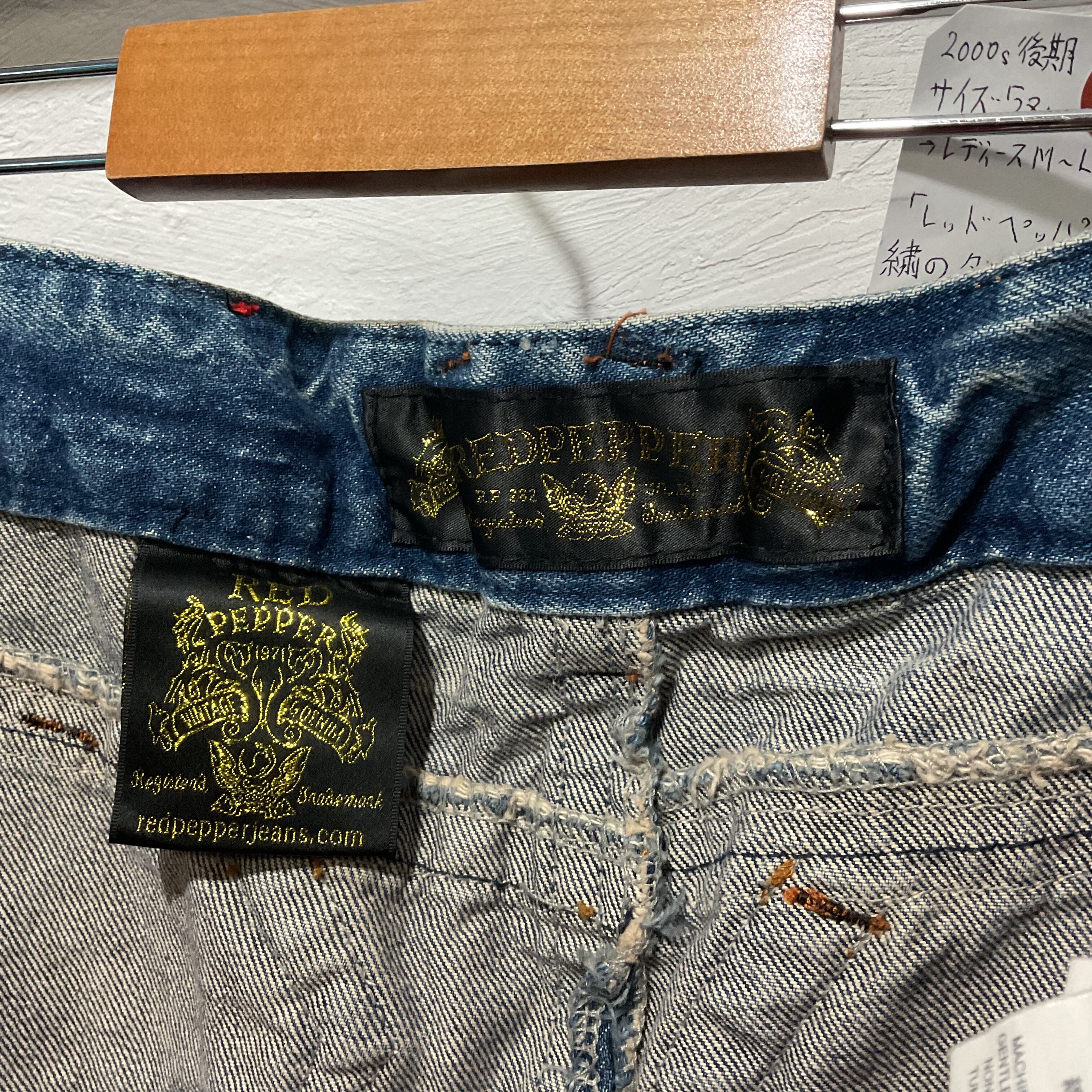 RED PEPPERらしい装飾感が映える、デニムスカート。フロントは重なりのあるラップ風デザインで、動きのあるシルエットが特徴。両脚側に入ったネイティブ調の刺繍パッチが主役級で、シンプルなトップスを合わせるだけでスタイリングが完成。トップボタンのロゴ入りメタルボタンや、カラースタッズなど細部まで作り込みがあり、Y2K〜平成っぽいムードにもハマる。裾はフリンジ仕様でラフに履ける1本(スカート)。