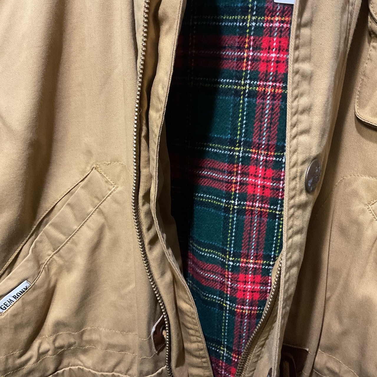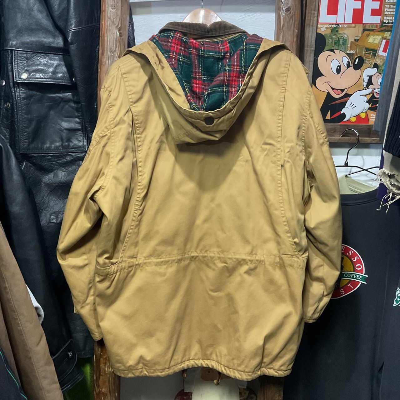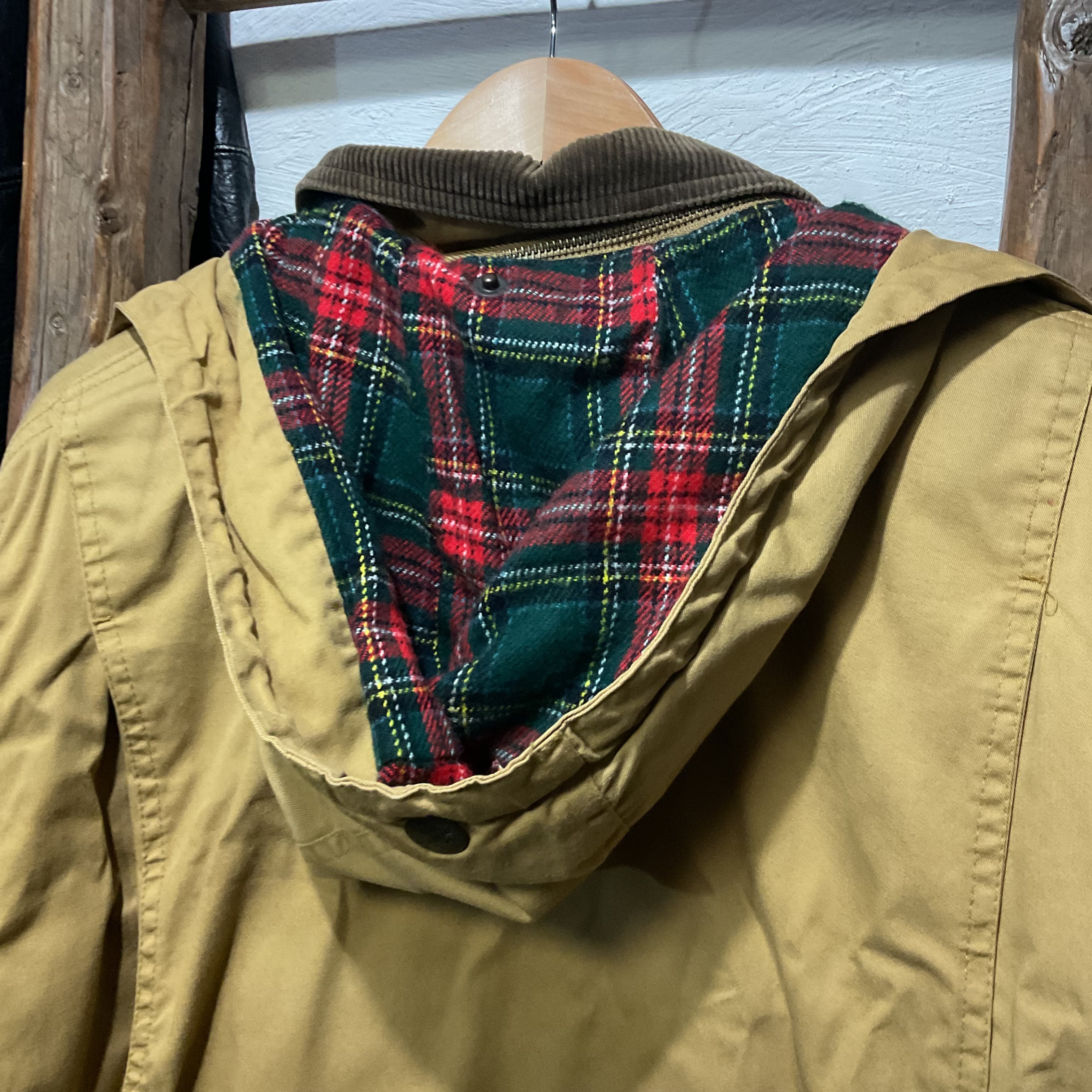 渋いベージュのボディに、コーデュロイ襟&タータンチェックのブランケットライナーが映える、90sムード満点のハンティング/フィールドジャケット。